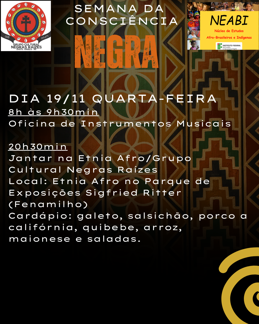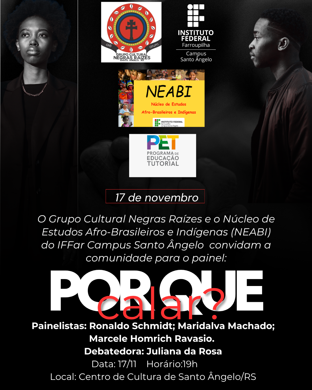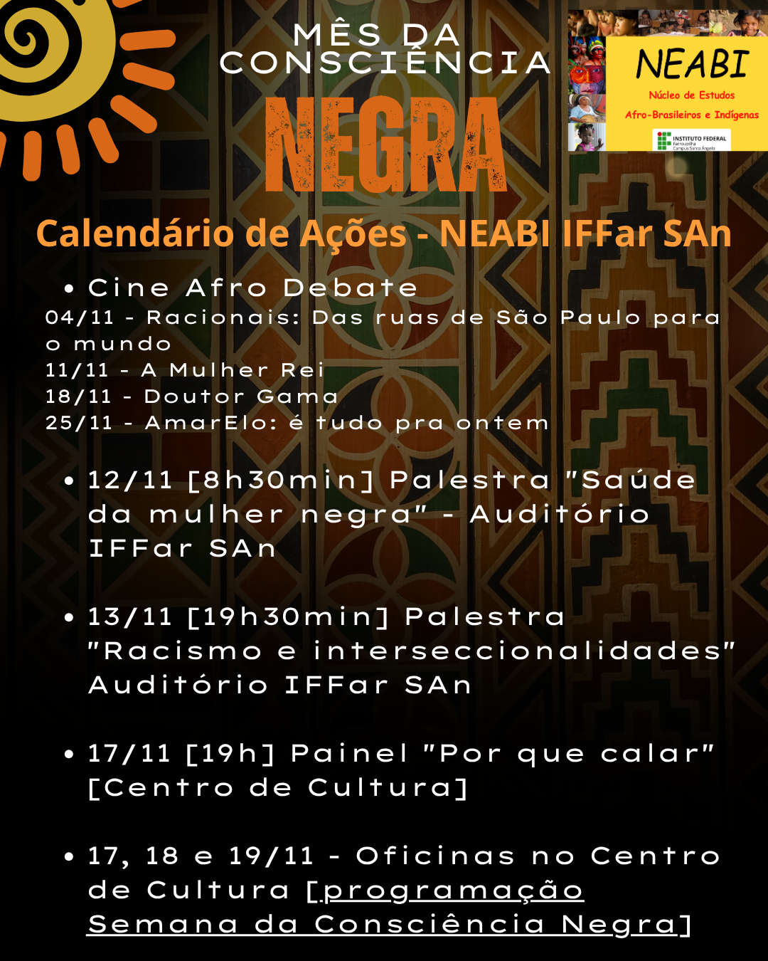 É nesse movimento que o IFFar – Campus Santo Ângelo, por meio do NEABI e do PET Letramento Racial Tec, em parceria com o Grupo Cultural Negras Raízes e a Secretaria Municipal de Cultura, realiza uma programação especial durante todo o mês. O objetivo é promover espaços de escuta, diálogo e estudo sobre os movimentos negros, visibilizando saberes historicamente silenciados e reafirmando o compromisso com uma educação pública, antirracista e libertadora.