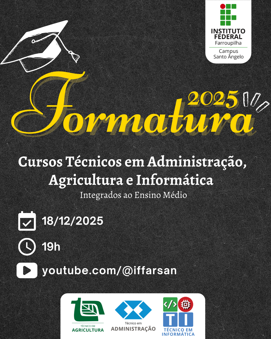 Na quarta-feira, 18 de dezembro, às 19h, ocorre a Formatura 2025 dos Cursos Técnicos em Administração, Agricultura e Informática, integrados ao Ensino Médio. A solenidade celebrará o encerramento do ciclo formativo dos estudantes que concluíram sua formação técnica aliada à educação básica, reafirmando o compromisso do IFFar com uma educação pública, gratuita e de qualidade.