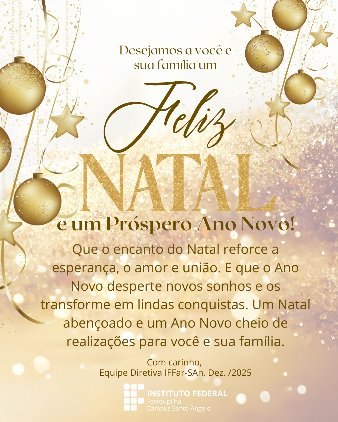Ao nos aproximarmos do encerramento de mais um ano, a Direção Geral do Instituto Federal Farroupilha - Campus Santo Ângelo agradece, de forma sincera, o empenho, a dedicação e o compromisso de estudantes e servidores que, ao longo de 2025, contribuíram para o fortalecimento de nossa instituição e para a promoção de uma educação pública, gratuita, inclusiva e de qualidade.