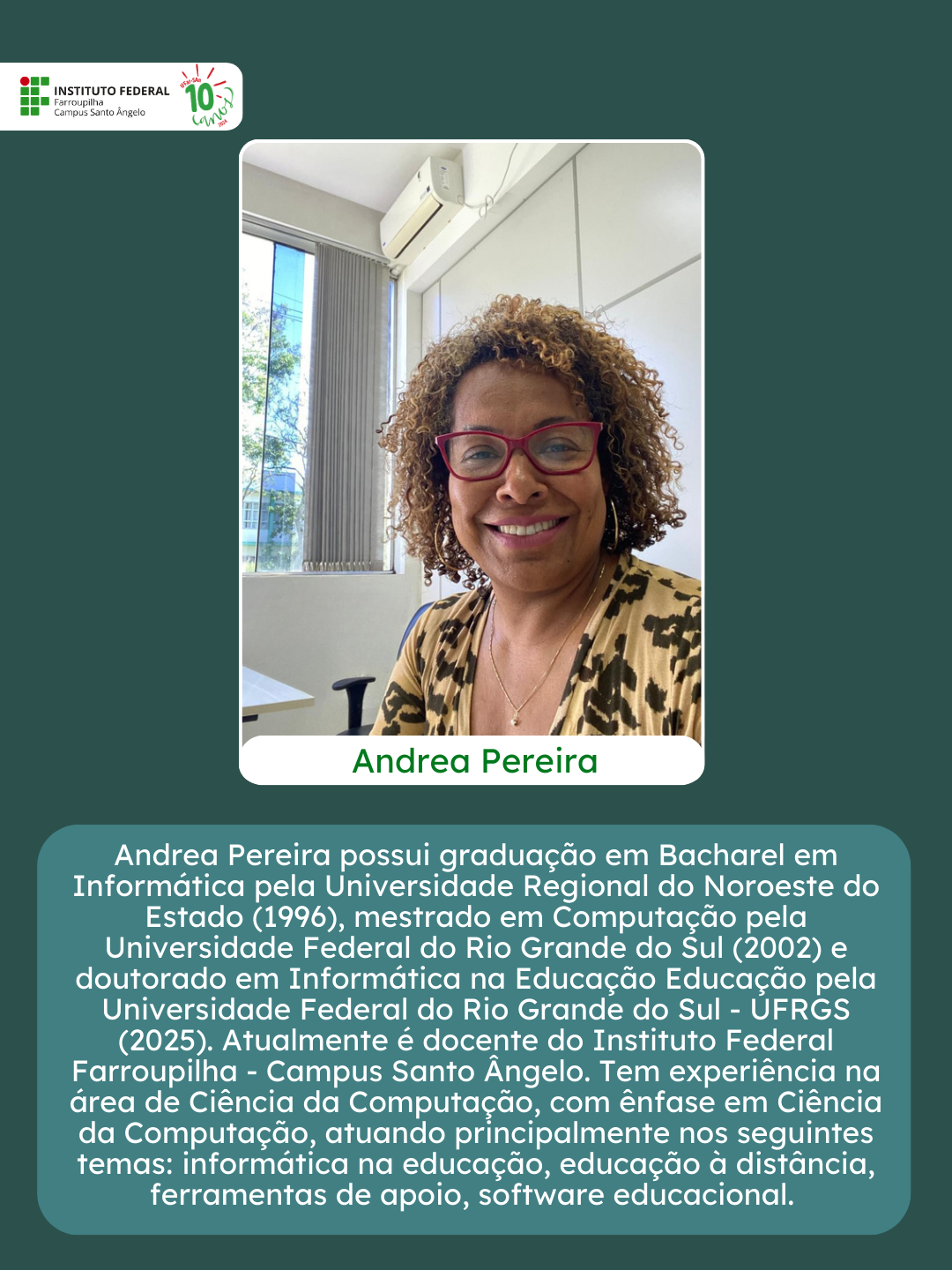 A professora Dra. Andrea Pereira possui graduação em Bacharel em Informática pela Universidade Regional do Noroeste do Estado (1996), mestrado em Computação pela Universidade Federal do Rio Grande do Sul (2002) e doutorado em Informática na Educação Educação pela Universidade Federal do Rio Grande do Sul - UFRGS (2025). Atualmente é docente do Instituto Federal Farroupilha - Campus Santo Ângelo. Tem experiência na área de Ciência da Computação, com ênfase em Ciência da Computação, atuando principalmente nos seguintes temas: informática na educação, educação à distância, ferramentas de apoio, software educacional.