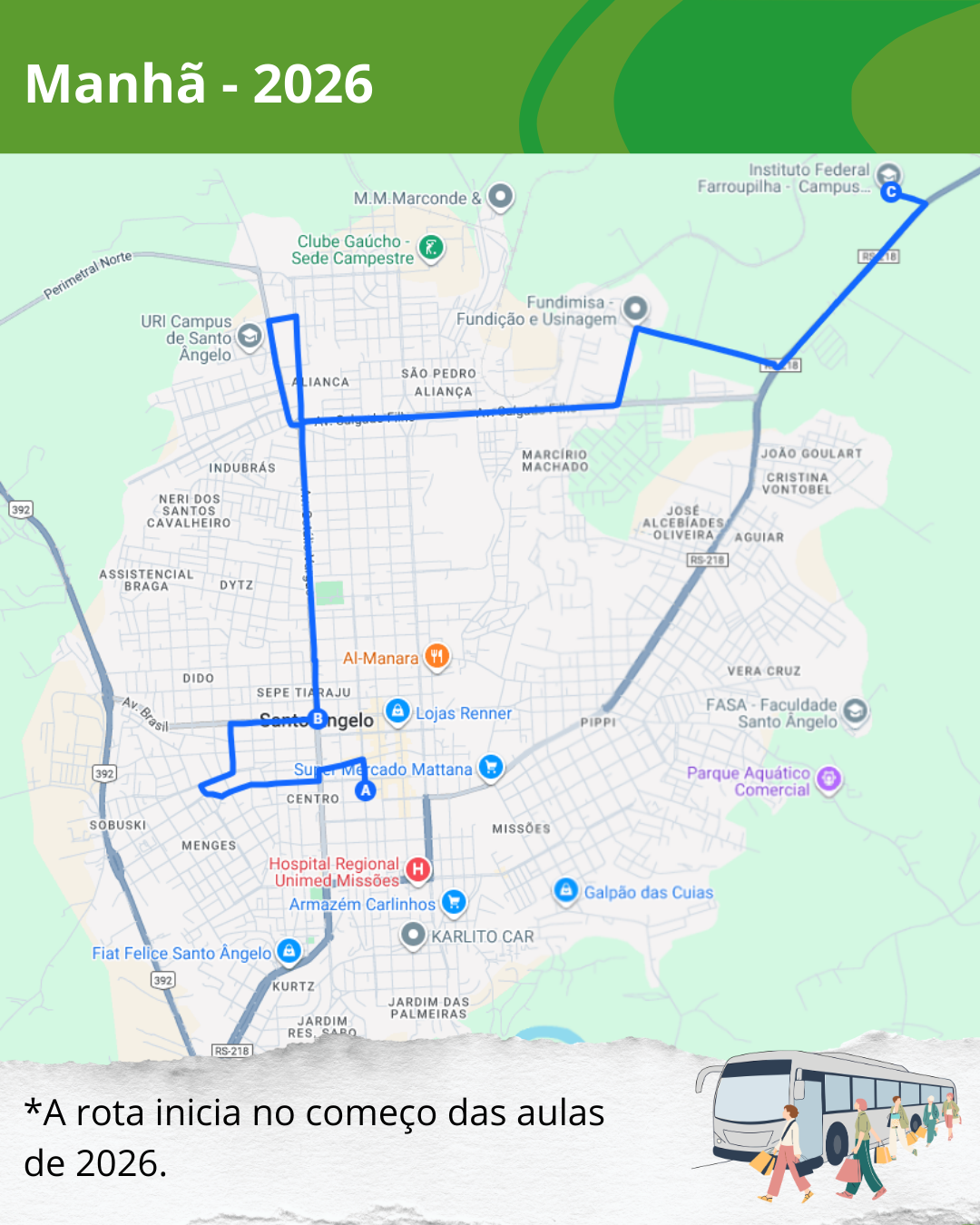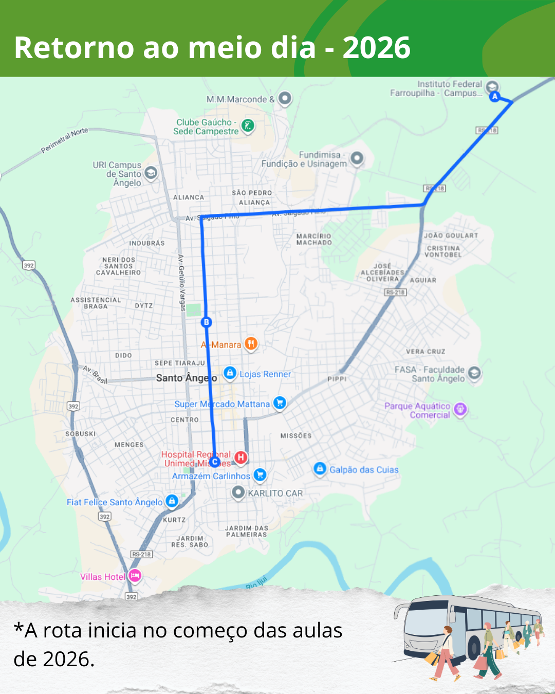 - Início na Catedral, passando pela Av. Getúlio Vargas, Av. Salgado Filho, região da Fundimisa, até o Campus Santo Ângelo.