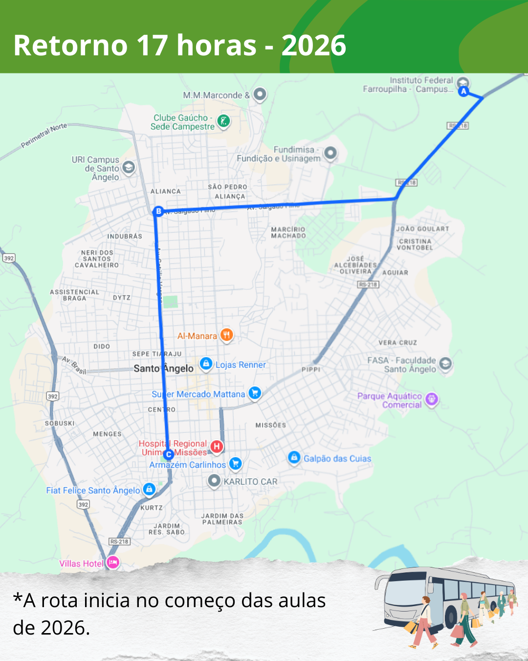 - 17h30 – saída do campus pela Av. Salgado Filho e Av. Getúlio Vargas, com destino ao centro até a Haller