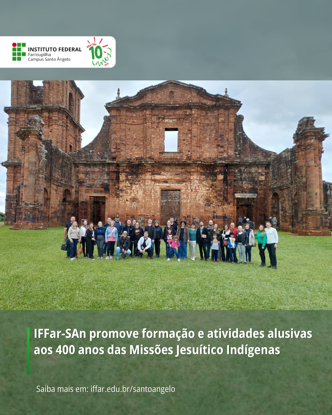 Nesse contexto, a Direção Geral, a Direção de Ensino, a Coordenação de Ações Afirmativas e o Núcleo de Estudos Afro-Brasileiros e Indígenas (NEABI) promoveram a Formação de Servidores, integrando institucionalmente as atividades alusivas aos 400 anos das Missões, com o objetivo de aprofundar o conhecimento histórico, refletir sobre os desafios da preservação e fortalecer a valorização do patrimônio cultural missioneiro.