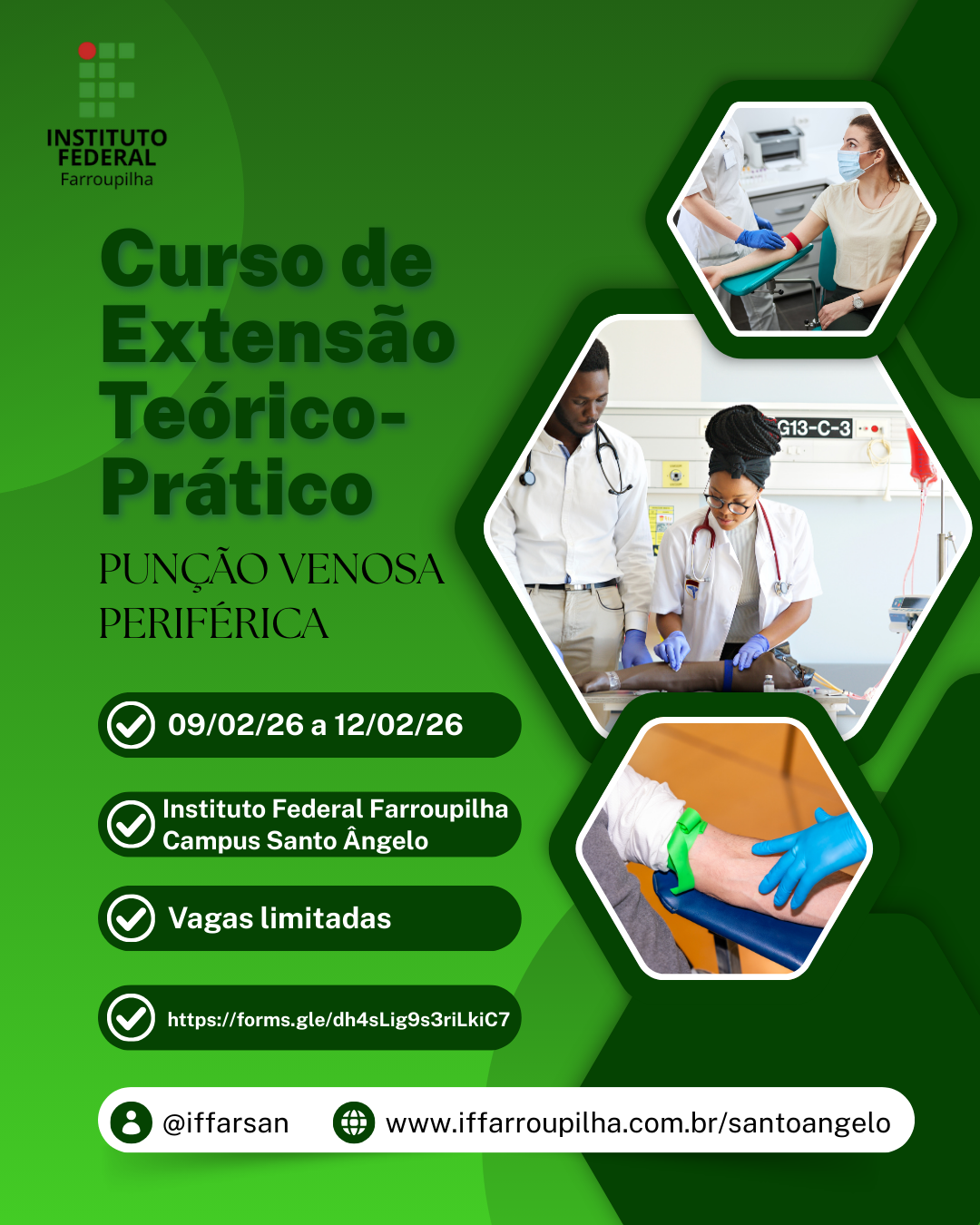 O Instituto Federal Farroupilha – Campus Santo Ângelo está com inscrições abertas para o curso de Extensão em Saúde, voltado à capacitação teórico-prática em punção venosa periférica.