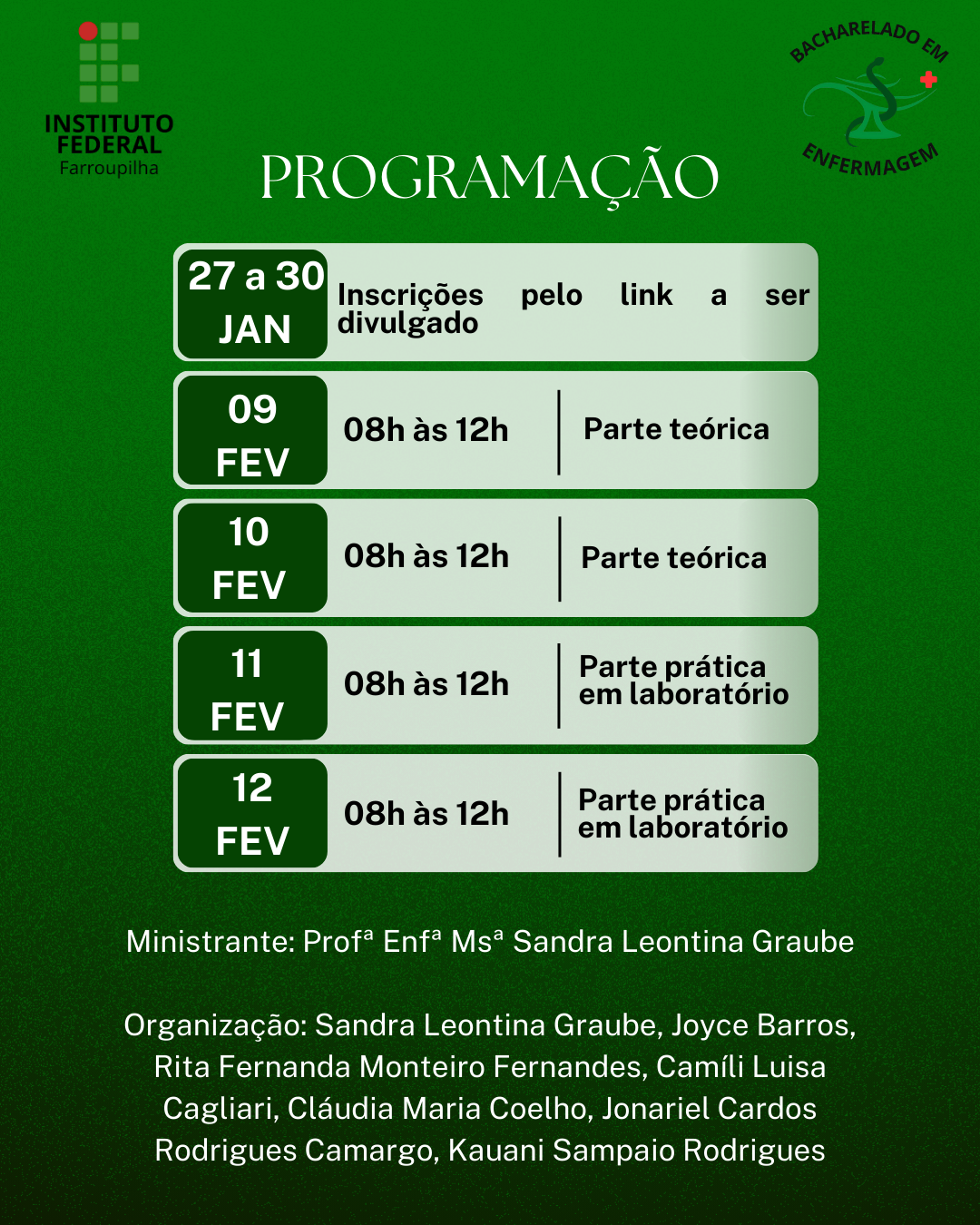 O curso terá duração de 09 a 12 de fevereiro de 2026, com atividades das 8h às 12h.