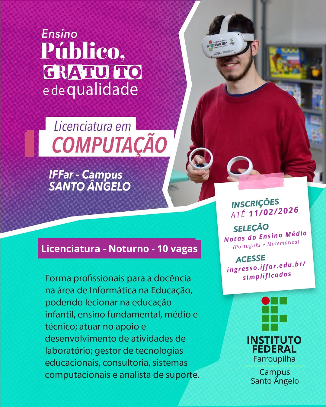 As inscrições para o Processo Seletivo Simplificado 2026 dos Cursos de Graduação do IFFar terminam nesta quarta-feira, 11 de fevereiro.