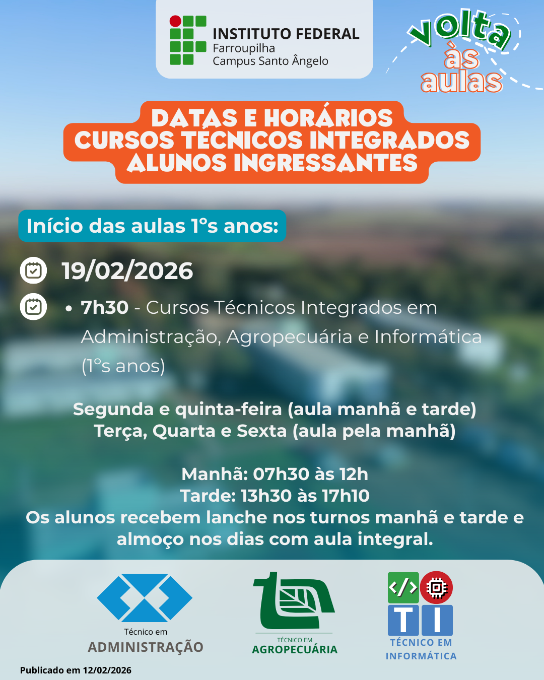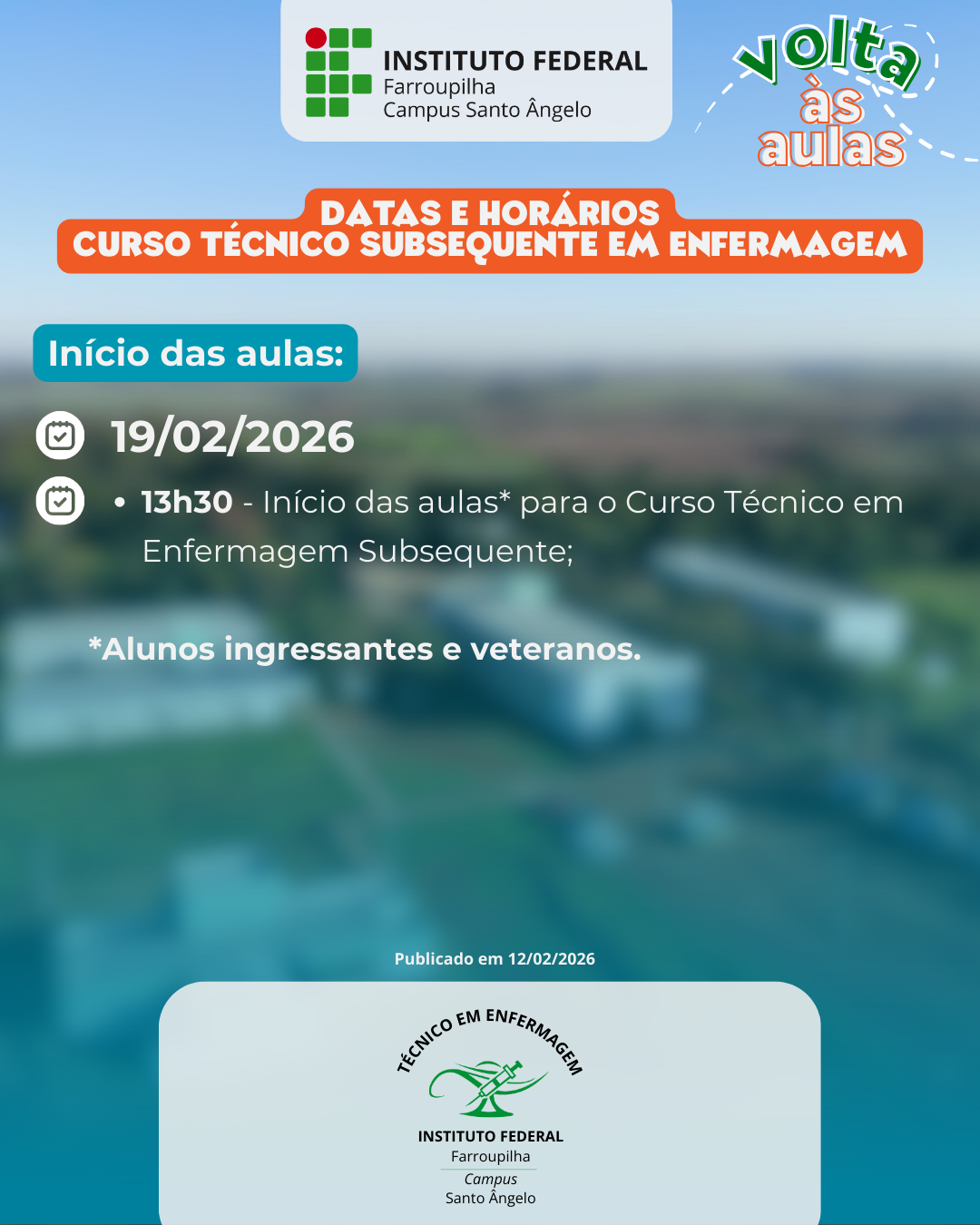 O Instituto Federal Farroupilha – Campus Santo Ângelo divulgou as datas e os horários de retorno às aulas para o ano letivo de 2026, conforme o Calendário Acadêmico institucional. As orientações contemplam estudantes dos Cursos Técnicos Integrados ao Ensino Médio, do Curso Técnico em Enfermagem Subsequente e dos Cursos de Graduação.