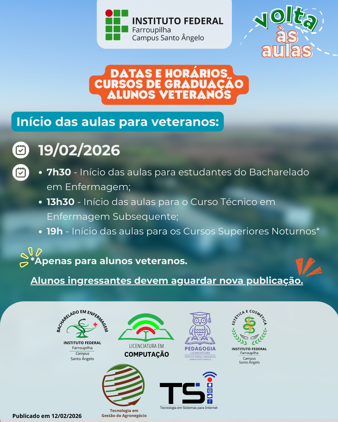 As aulas para estudantes ingressantes e veteranos iniciam em 19 de fevereiro de 2026, no turno da tarde, às 13h30.
