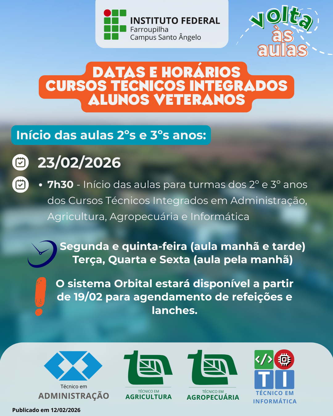 O sistema Orbital estará disponível a partir de 19 de fevereiro de 2026 para o agendamento de refeições e lanches exclusivamente para os estudantes dos Cursos Técnicos Integrados.