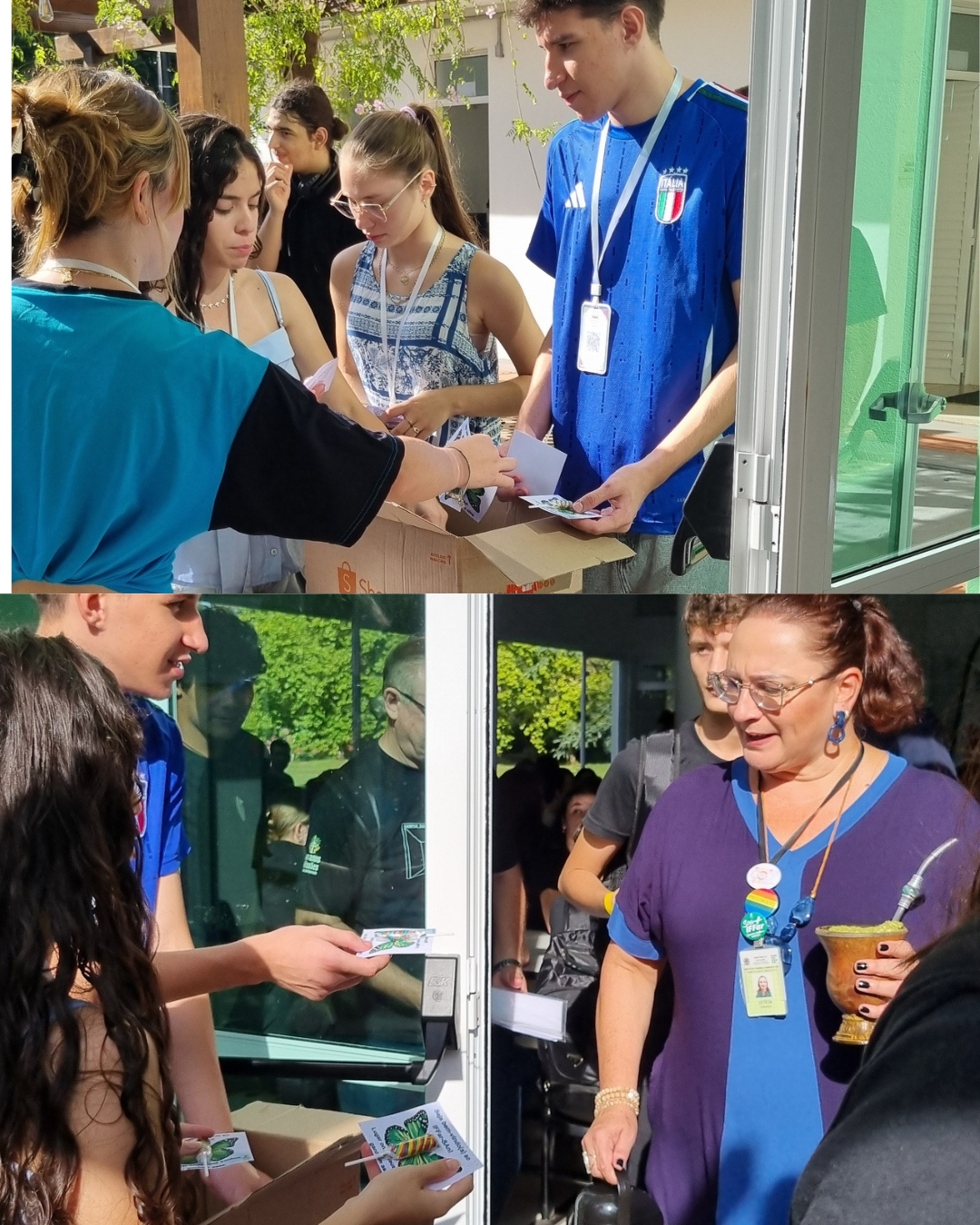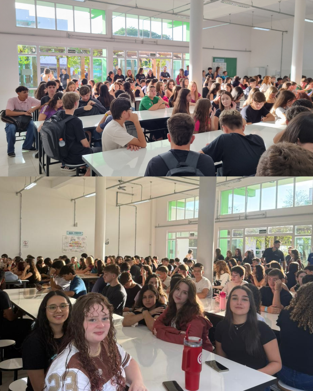 A movimentação começou cedo, às 07h10, com o Grêmio Estudantil e veteranos(as) recepcionando os(as) calouros(as) no Prédio A. Cada ingressante recebeu sua pulseira colorida por curso e foi guiado ao Centro de Convivência, que estava preparado com música e um cenário especial para fotos, o primeiro registro de muitos que virão!