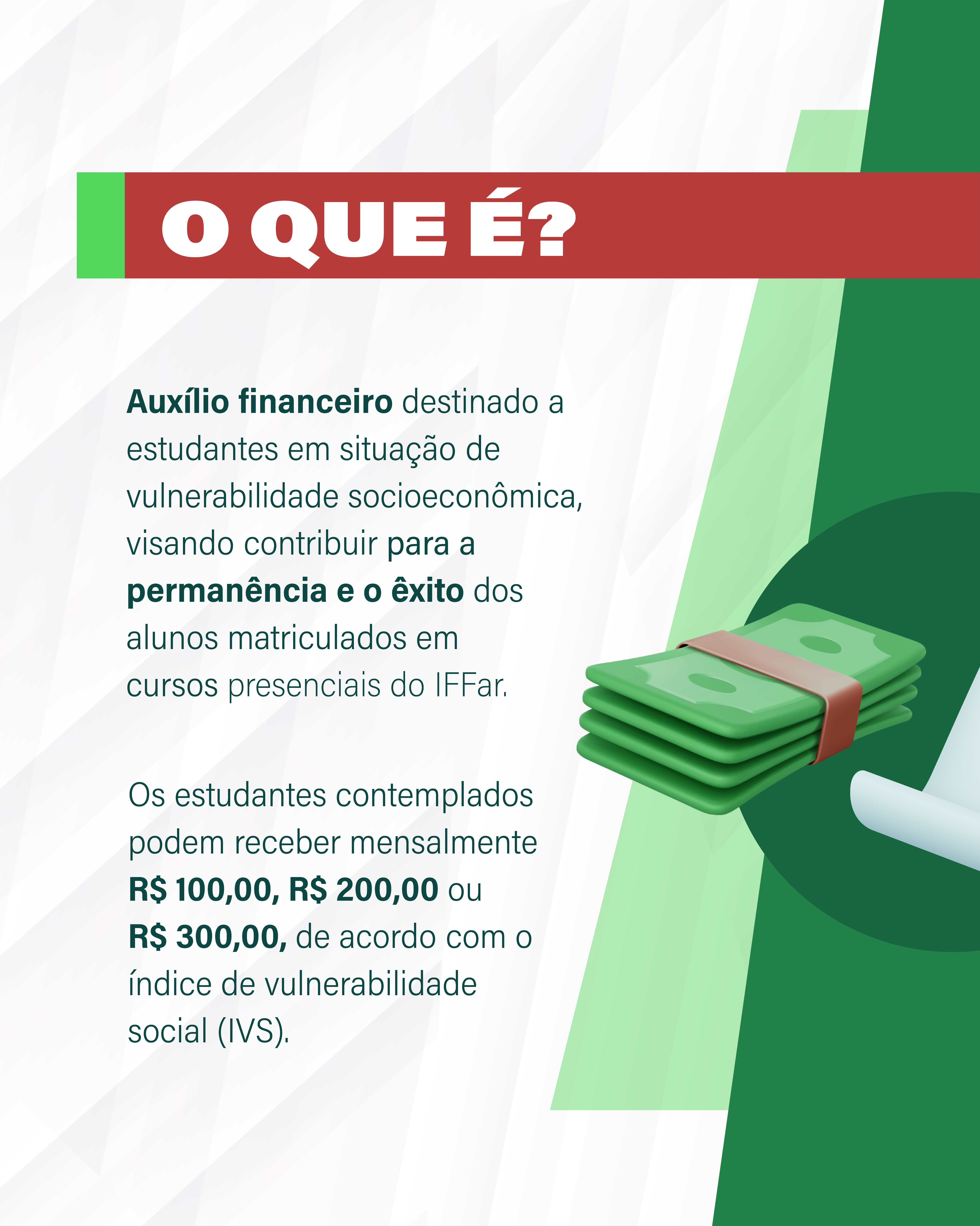 Auxílio financeiro destinado a estudantes em situação de vulnerabilidade socioeconômica, visando contribuir para a permanência e o êxito dos alunos matriculados em cursos presenciais do IFFar.