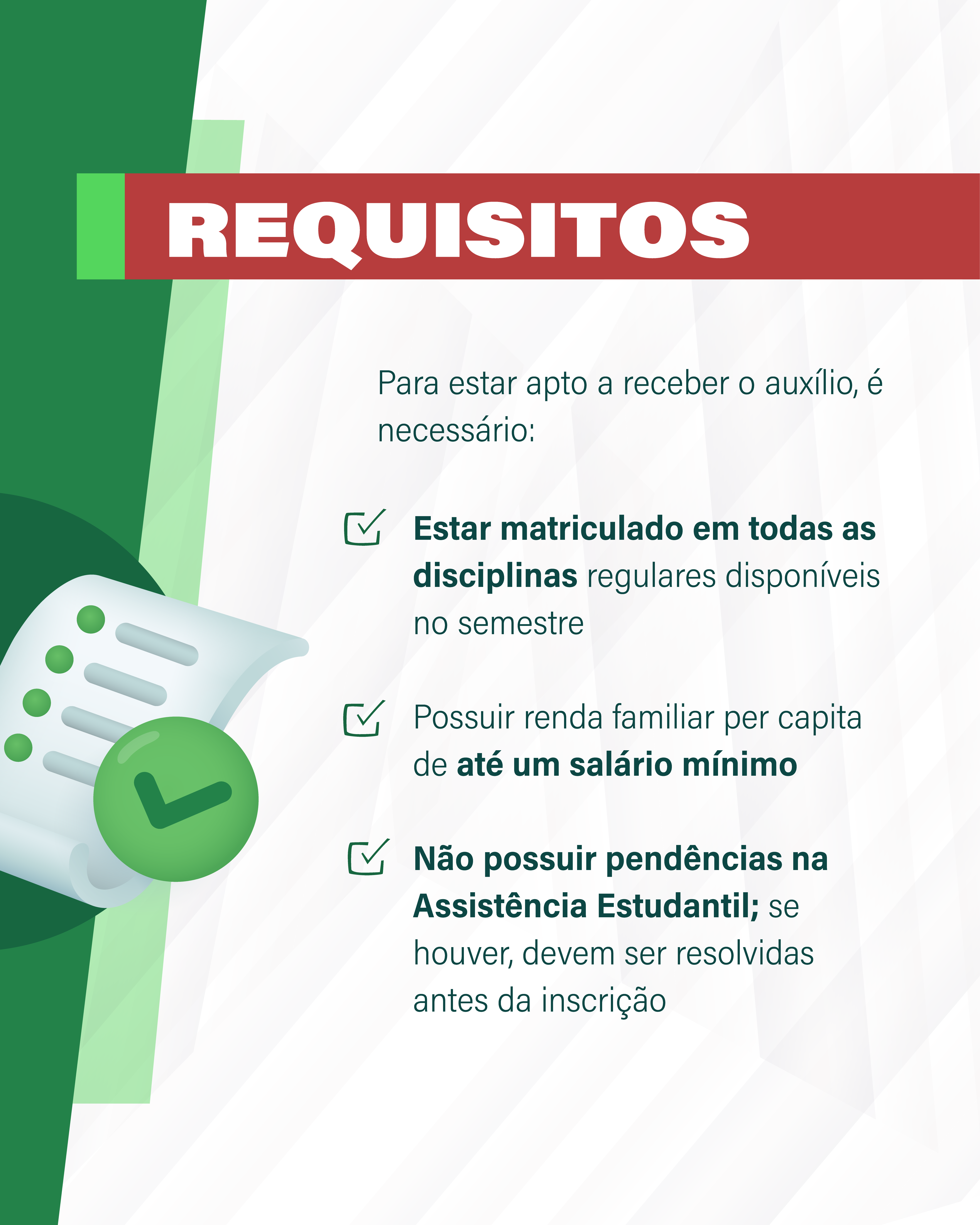 Além disso, o estudante que deseja solicitar o auxílio deve estar matriculado em todas as disciplinas regulares disponíveis no semestre. Casos específicos podem ser analisados pela coordenação do curso e pela Coordenação de Assistência Estudantil.