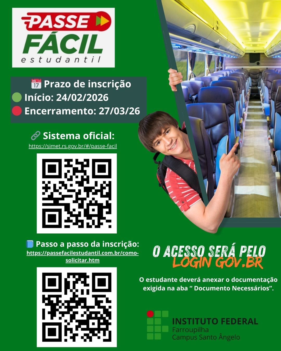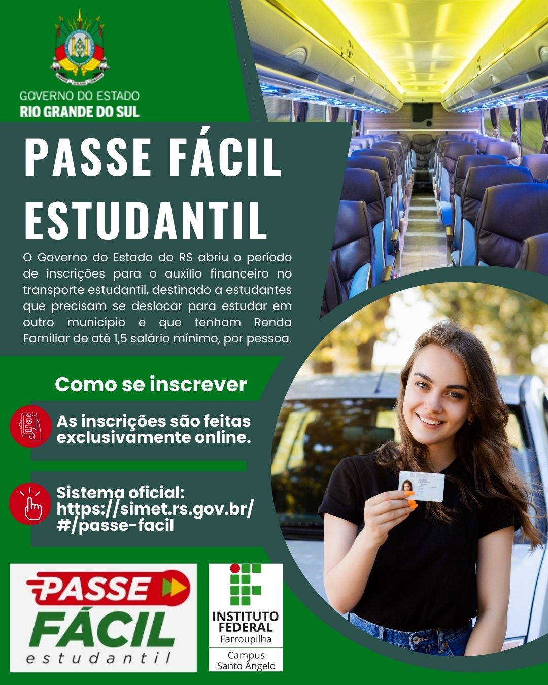 Estudantes do Instituto Federal Farroupilha (IFFar) que residem em um município e estudam em outro já podem se inscrever no programa Passe Fácil Estudantil, iniciativa do Governo do Estado do Rio Grande do Sul, por meio da METROPLAN, que oferece auxílio financeiro para o transporte estudantil intermunicipal.
