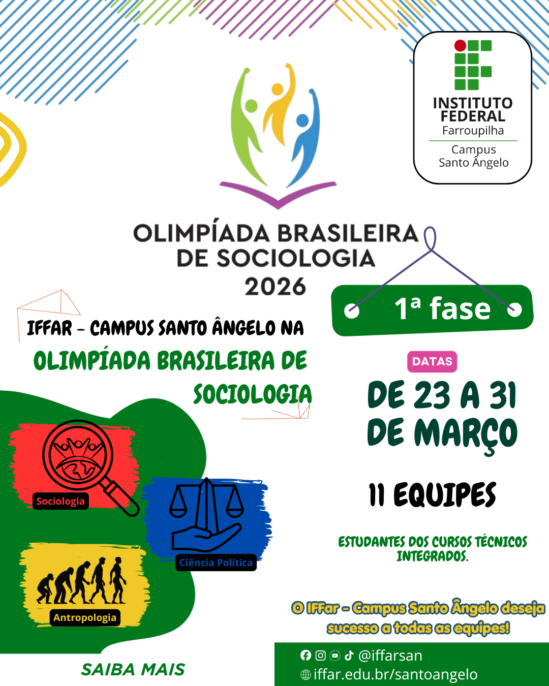 Estudantes do Instituto Federal Farroupilha – campus Santo Ângelo (IFFar-SAn) estão participando da Olimpíada Brasileira de Sociologia. Ao todo, 11 equipes, formadas por estudantes dos cursos técnicos integrados ao ensino médio, representam o campus na primeira fase da competição, que ocorre entre os dias 23 e 31 de março.