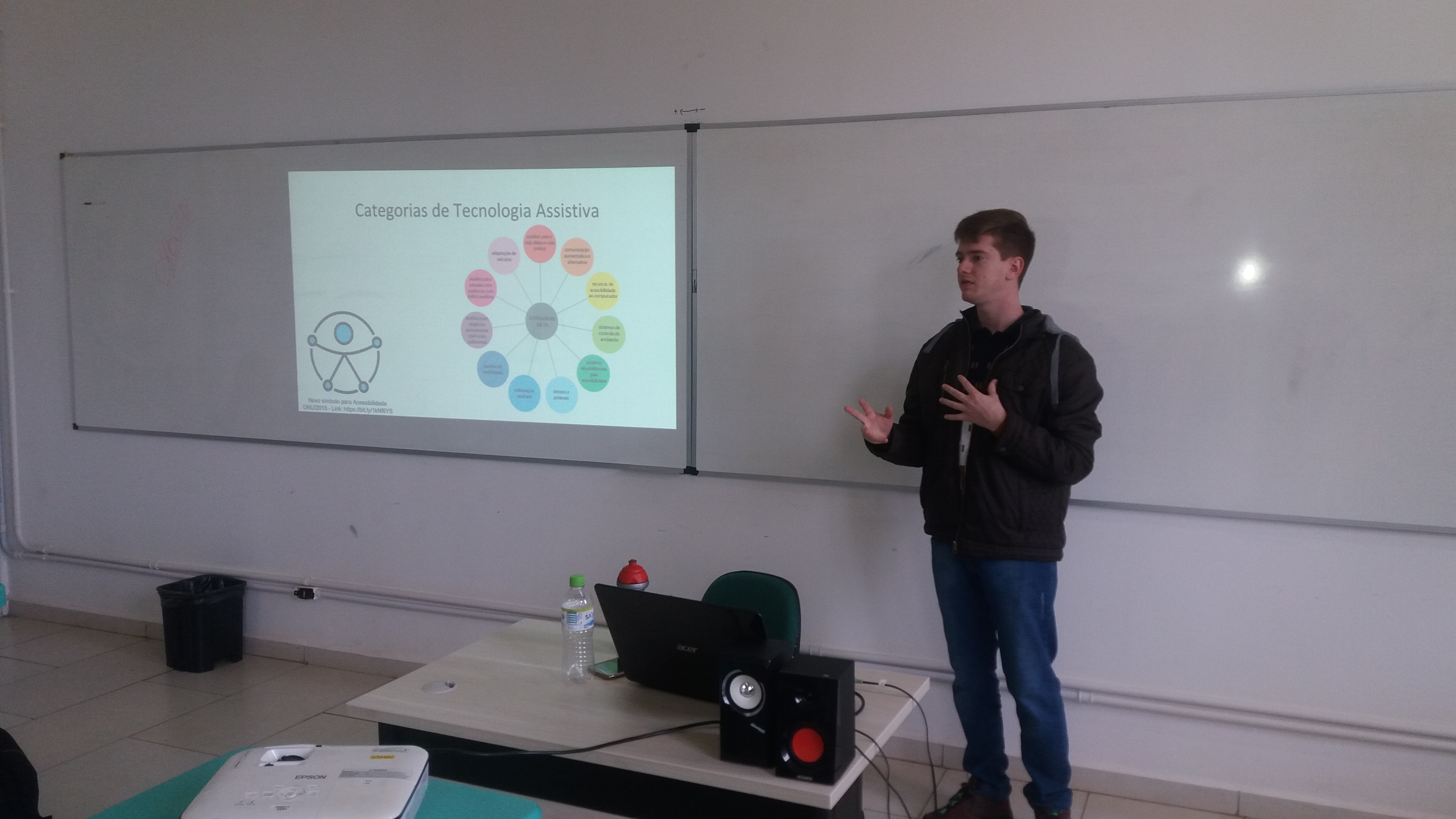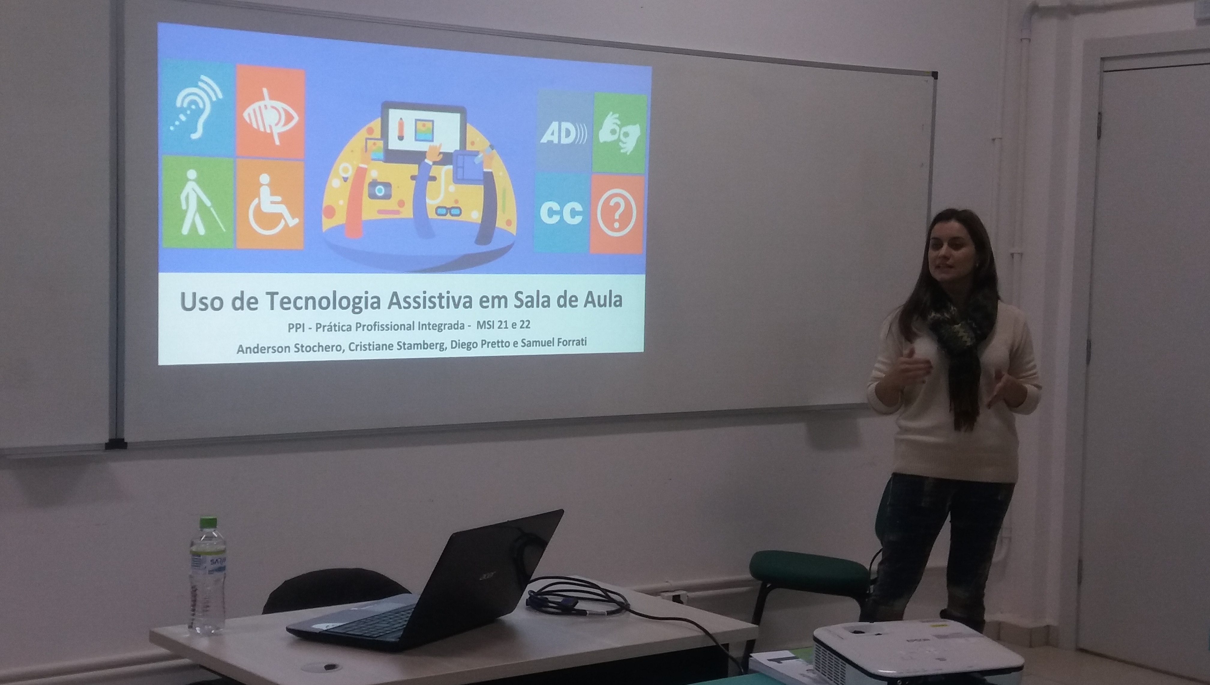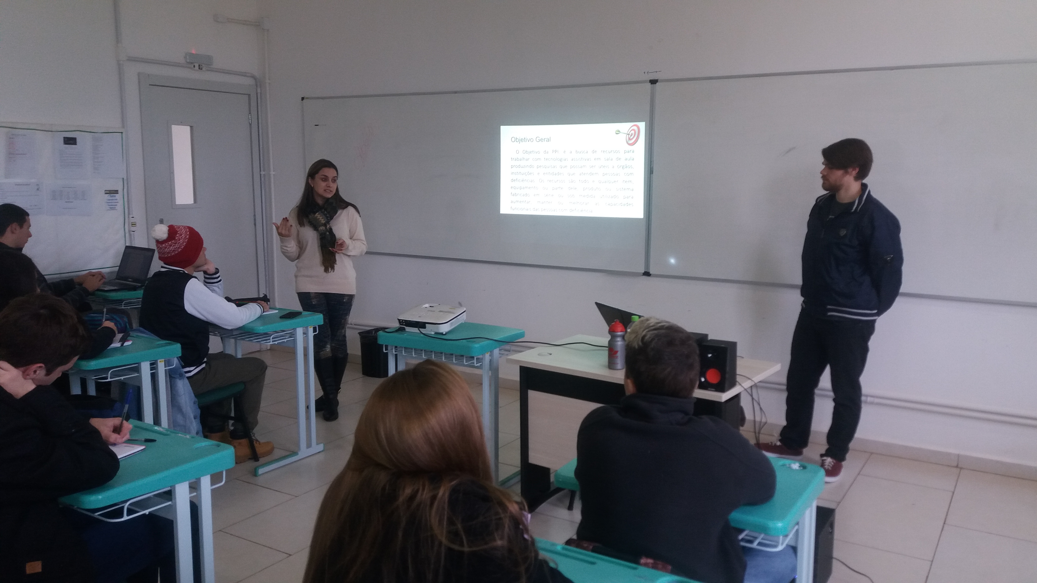 Ocorreu no dia 04/06 no Campus Santo Ângelo um momento de reflexão e debate sobre Tecnologia Assistiva, tema extremamente pertinente e relevante para sociedade atual e que compõe o desenvolvimento da Prática Profissional Integrada - PPI dos alunos do 2° ano do curso Técnico Integrado de Manutenção e Suporte em Informática neste ano letivo. O momento foi organizado pelos professores Cristiane da Silva Stamberg e Diego Pretto, e contou também com a participação dos alunos do Curso Superior de Tecnologia em Sistemas para Internet - Anderson Daniel Stochero e Samuel Müller Forrati, os quais, juntamente com a professoras Andréa Pereira e Cristiane Stamberg, desenvolvem o Projeto de Pesquisa “O ensino e a aprendizagem em matemática com o auxílio de ferramentas tecnológicas”, que objetiva a criação de um jogo computacional matemático, tendo como público alvo crianças com Transtorno do Espectro Autista - TEA, contemplando a área da Tecnologia Assistiva. Além de falar sobre o projeto, os acadêmicos também apresentaram, no decorrer da conversa, alguns pontos importantes sobre o tema, visando esclarecer possíveis dúvidas e contribuir com ideias e inspirações para o desenvolvimento da PPI.