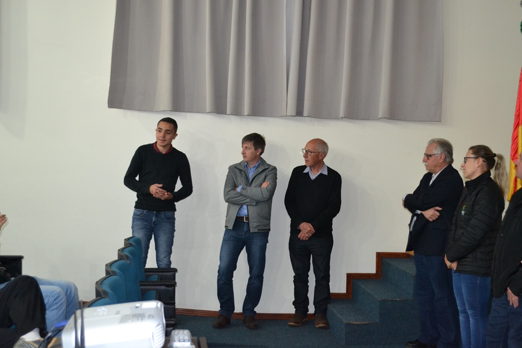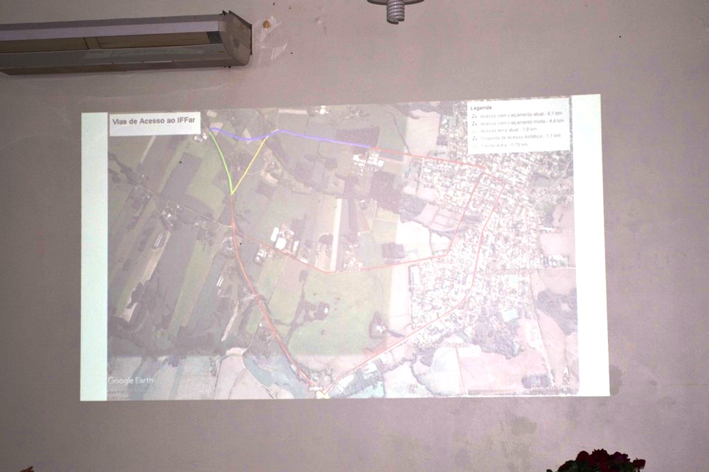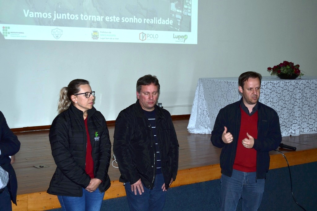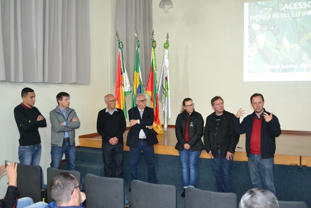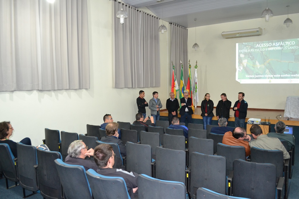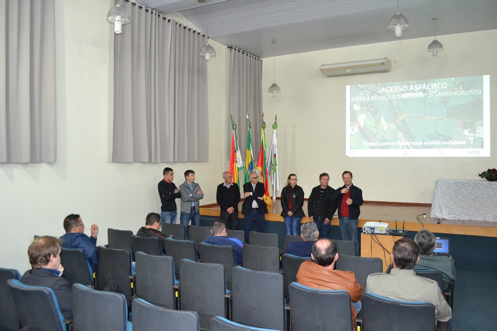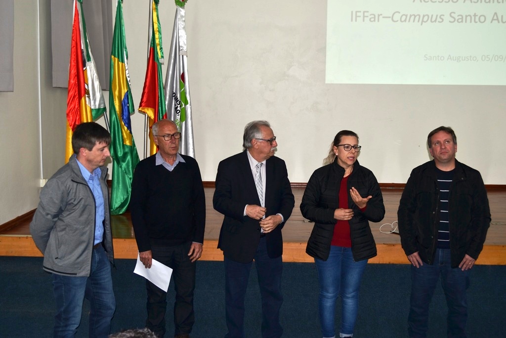 O IFFar - Campus Santo Augusto realizou na noite do dia 05 de setembro, no auditório da instituição, o lançamento do Projeto que visa asfaltar o acesso entre o campus e a RS 155. Estiveram presentes na oportunidade, a Diretora Geral do IFFar - Campus Santo Augusto, Verlaine Denize Brasil Gerlach, o prefeito de Santo Augusto, Naldo Wiegert, o presidente da Amuceleiro e prefeito de Chiapetta, Éder Both, os proprietários da empresa Lupa Agrícola, Sidinei André Reinehr e Roberto Barcelos, o arquiteto Otávio Polo, o vereador Irani da Rosa e o presidente do Diretório Central de Estudantes – DCE, Gabriel Toledo.