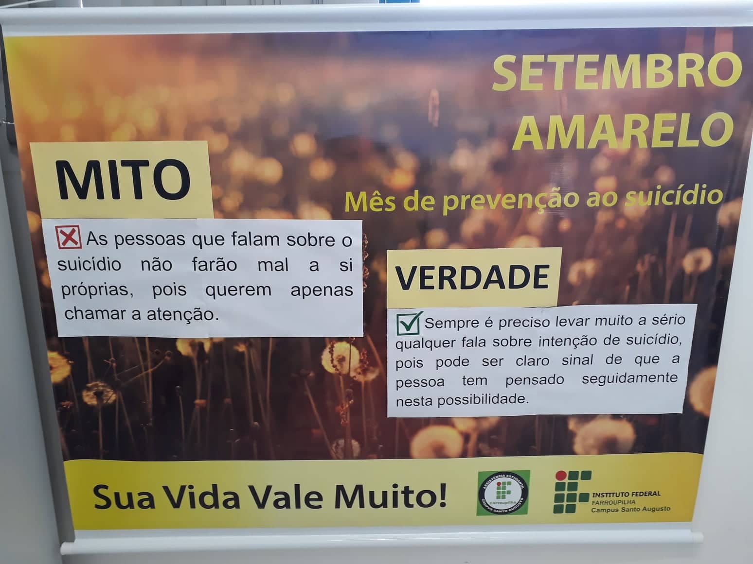 A equipe da Assistência Estudantil também realizou, no dia 10 de setembro, dia Mundial de Prevenção ao Suicídio, conversa com os líderes das turmas dos cursos técnicos integrados ao Ensino Médio, falando sobre a importância da campanha do Setembro Amarelo, sobre a necessidade de ficarem atentos a essa questão em sala de aula, e, incentivando a divulgação de informações nas redes sociais. Nesse dia também foram entregues folders informativos aos alunos.