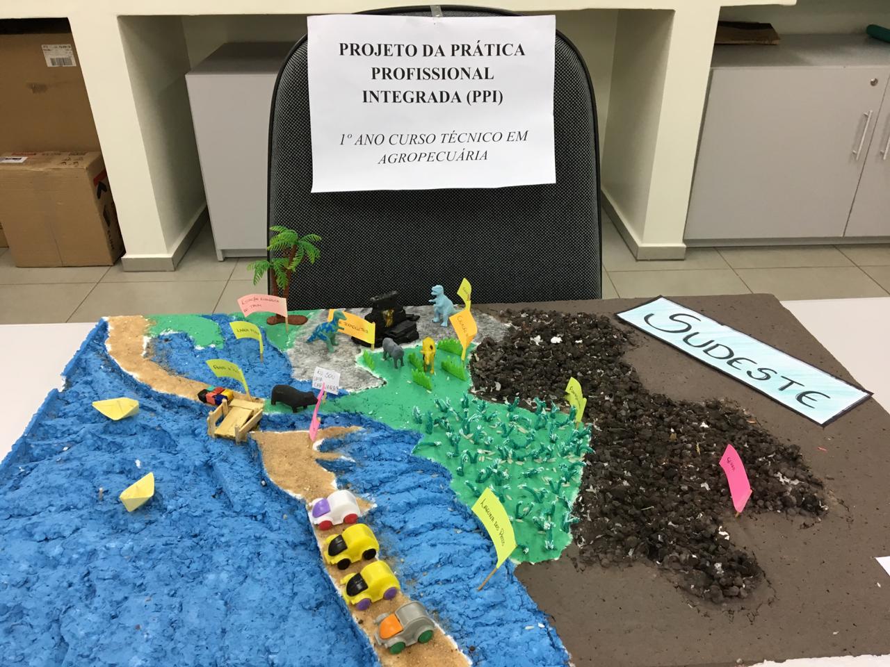 Após a realização do estudo de cada mesorregião, os grupos elaboraram uma maquete com dimensões de no mínimo 80 x 50 cm, onde foi apresentada e caracterizada cada uma das macrorregiões, além de poderem elaborar outros materiais, como perfis de solo de cada região, pôster, apresentação em power point, álbum seriado, entre outros. Os trabalhos foram expostos no corredor do prédio F, para estudantes e professores pudessem conferir, também deverão ser apresentados na Mostra Técnica da Instituição, que será realizada no dia 24 de novembro.