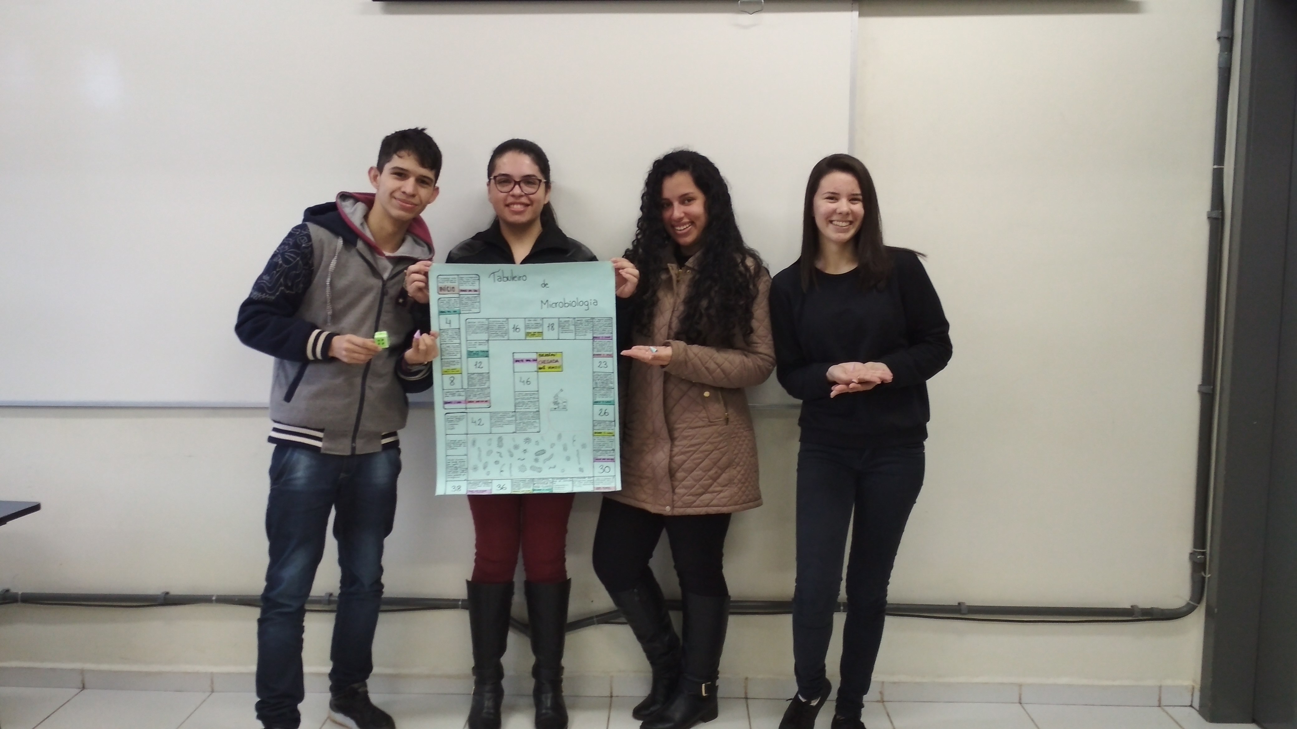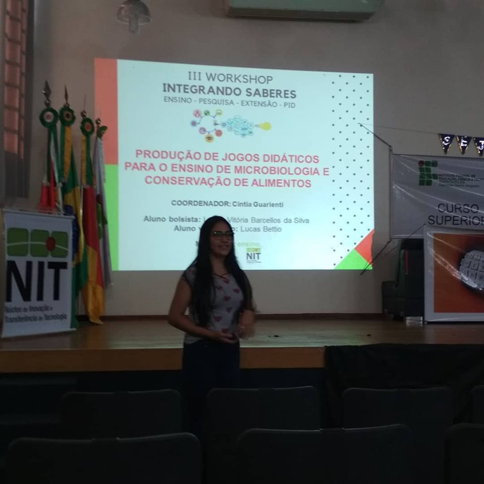 Apesar da estrutura de laboratórios existente no IFFar – Campus Santo Augusto, algumas associações práticas relacionadas ao assunto não podem ser realizadas e necessitam de um embasamento teórico, para que o aluno entenda as relações e consequências da presença de microrganismos nos alimentos, pensando nisso a professora Cíntia Guarienti está desenvolvendo ao longo desse ano o projeto de ensino, “Produção de jogos didáticos para o ensino de microbiologia e conservação de alimentos”, tendo como bolsista a estudante, Luana Vitória Barcellos da Silva e como voluntário o estudante, Lucas Bettio.
