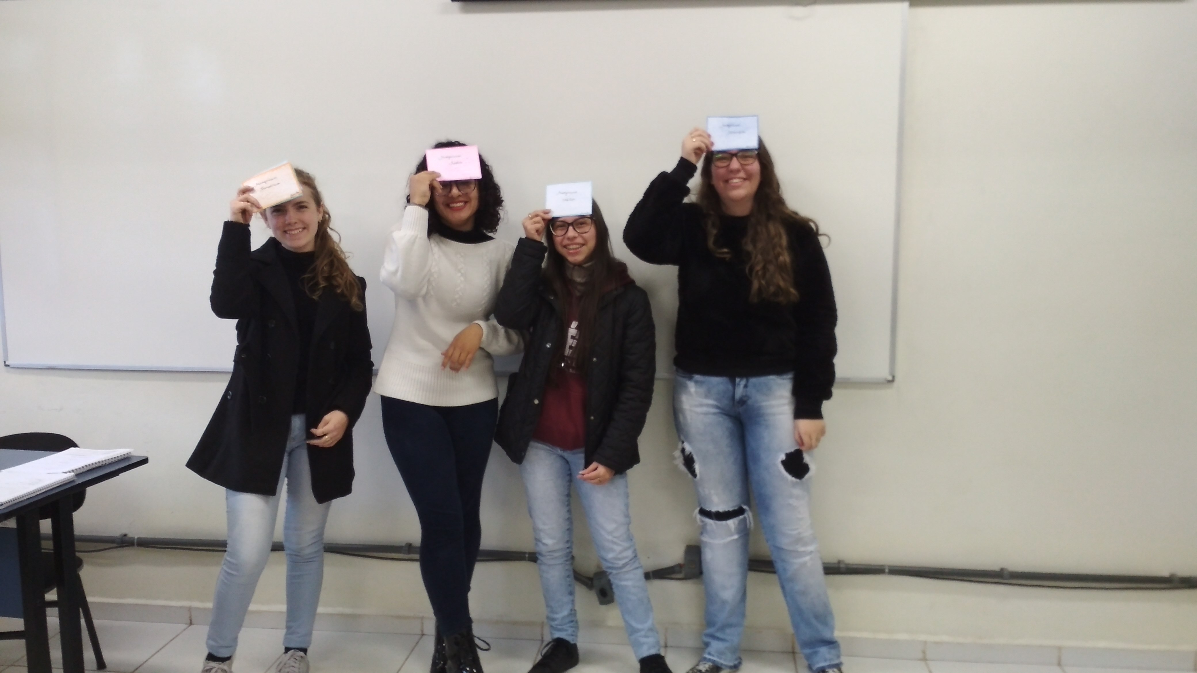 A professora explica que os conteúdos de maior correspondência e relevância para os cursos foram elencados e distribuídos entre os alunos participantes do projeto, que estão alocados em 8 grupos. Os grupos devem pensar estratégias para a criação de jogos, partindo de uma revisão de literatura e pesquisa sobre jogos que já tenham sido produzidos e que apresentam boas expectativas de resultados no ensino (por exemplo: jogos de tabuleiro, jogos de cartas, perguntas e respostas – “quiz”...).