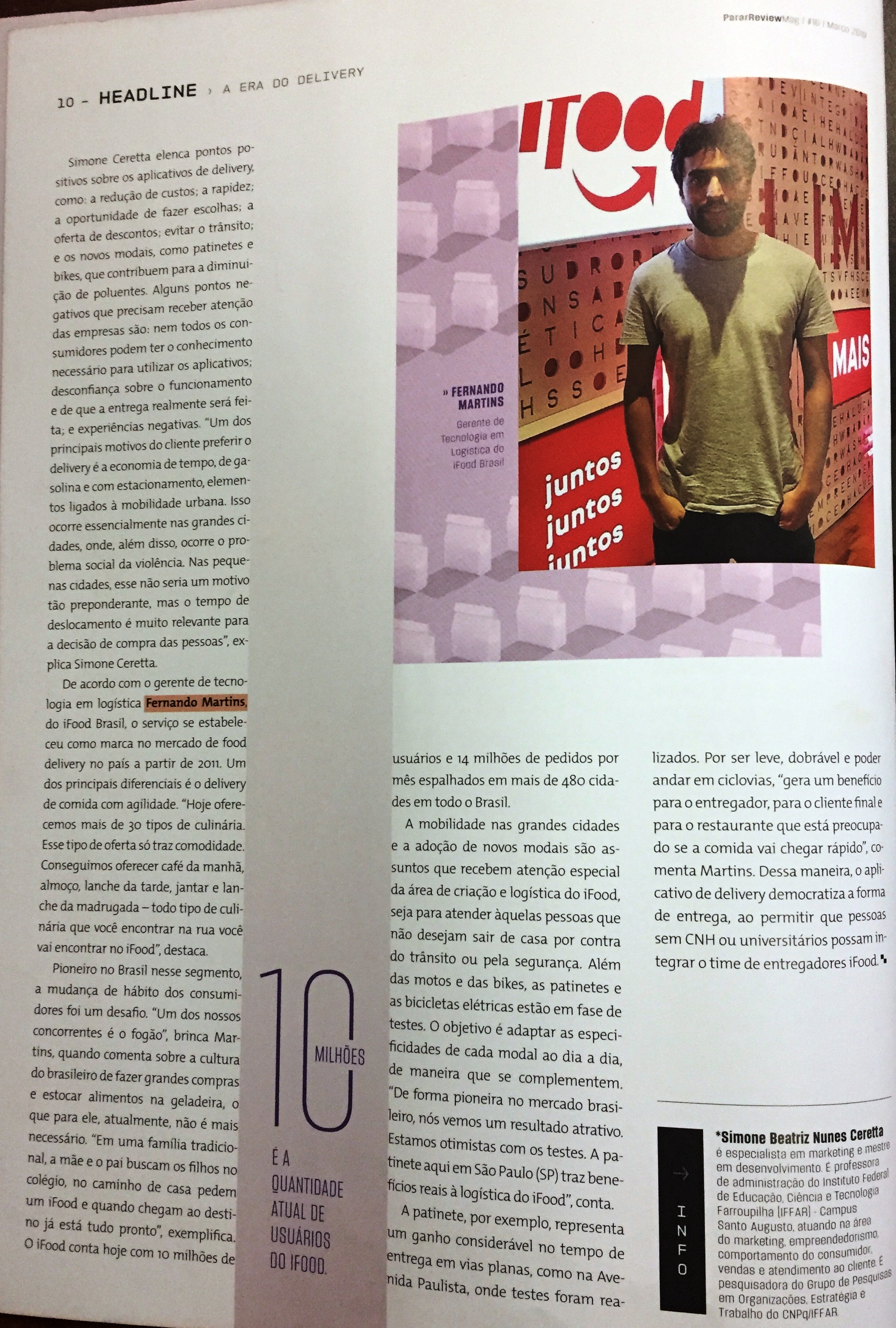 A professora do IFFar – Campus Santo Augusto, Simone Beatriz Nunes Ceretta, especialista em Marketing e Mestre em Desenvolvimento, foi entrevistada recentemente para a última edição da revista desenvolvida pelo Instituto PARAR, resultando no artigo “A Era do Delivery”, que fala sobre como esse nicho de mercado em expansão contempla variadas categorias de serviços.