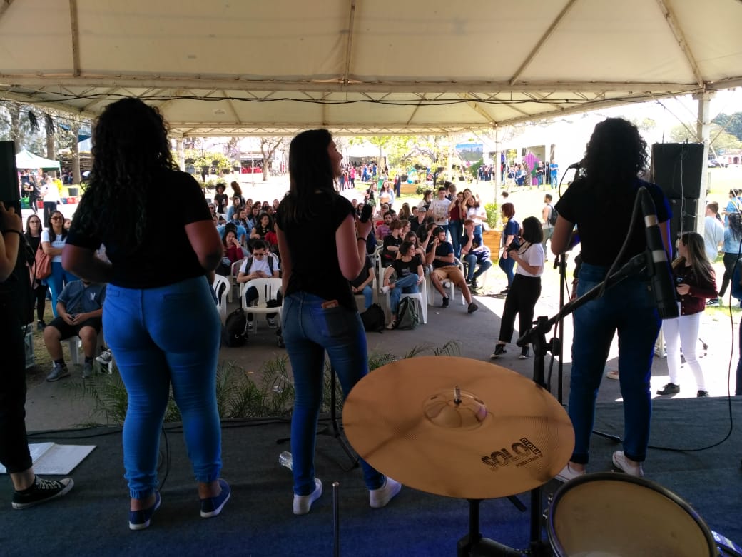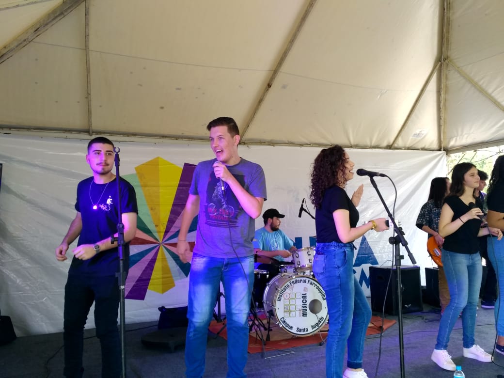 Durante a apresentação da Banda IF Musical no palco de shows do Descubra UFSM 2019, os egressos do IFFar – Campus Santo Augusto e ex-integrantes do projeto IF Musical, Eduardo Grenzel e Emanuel Santos (atuais estudantes da UFSM), foram convidados pelo grupo para se apresentarem com a Banda.