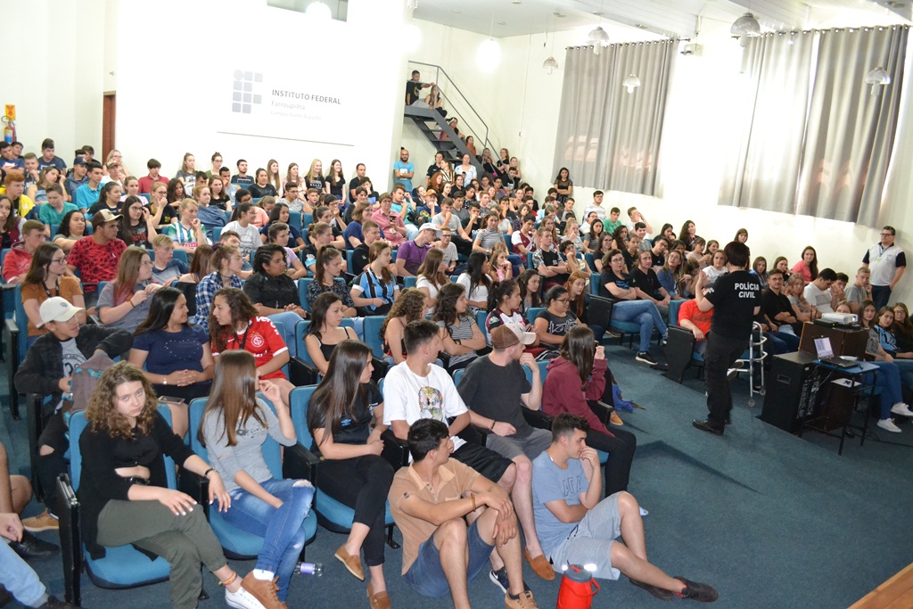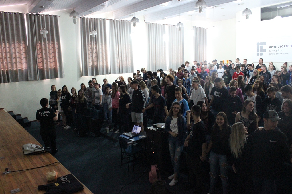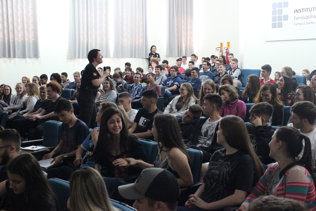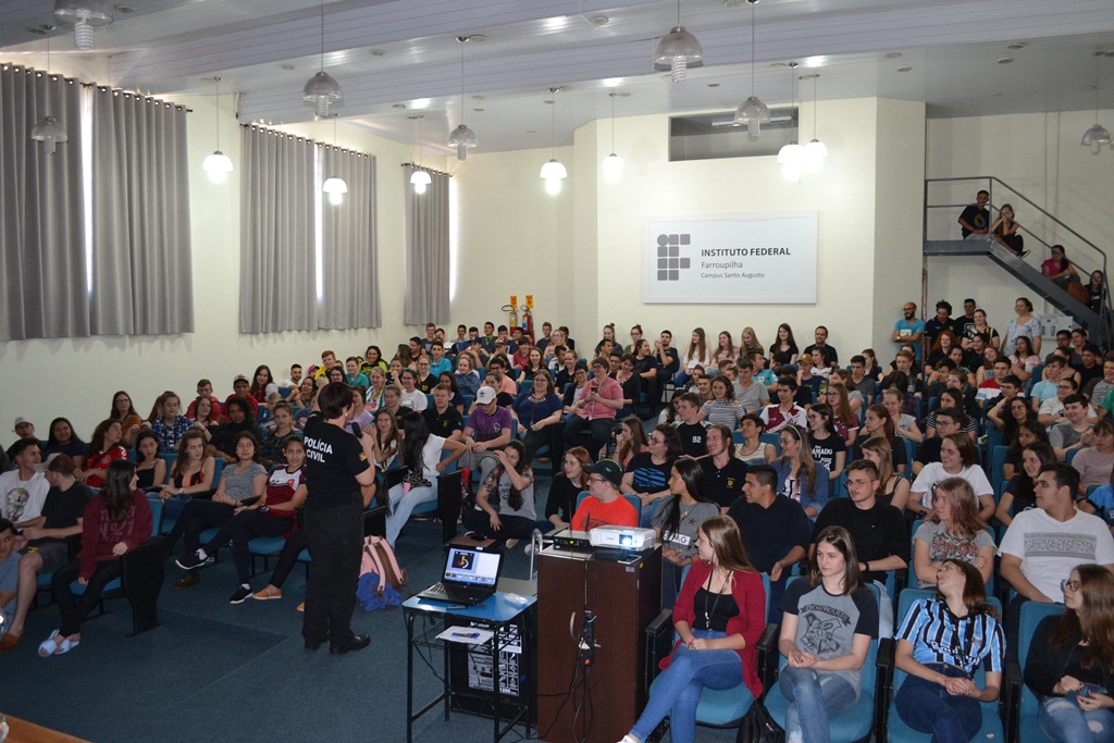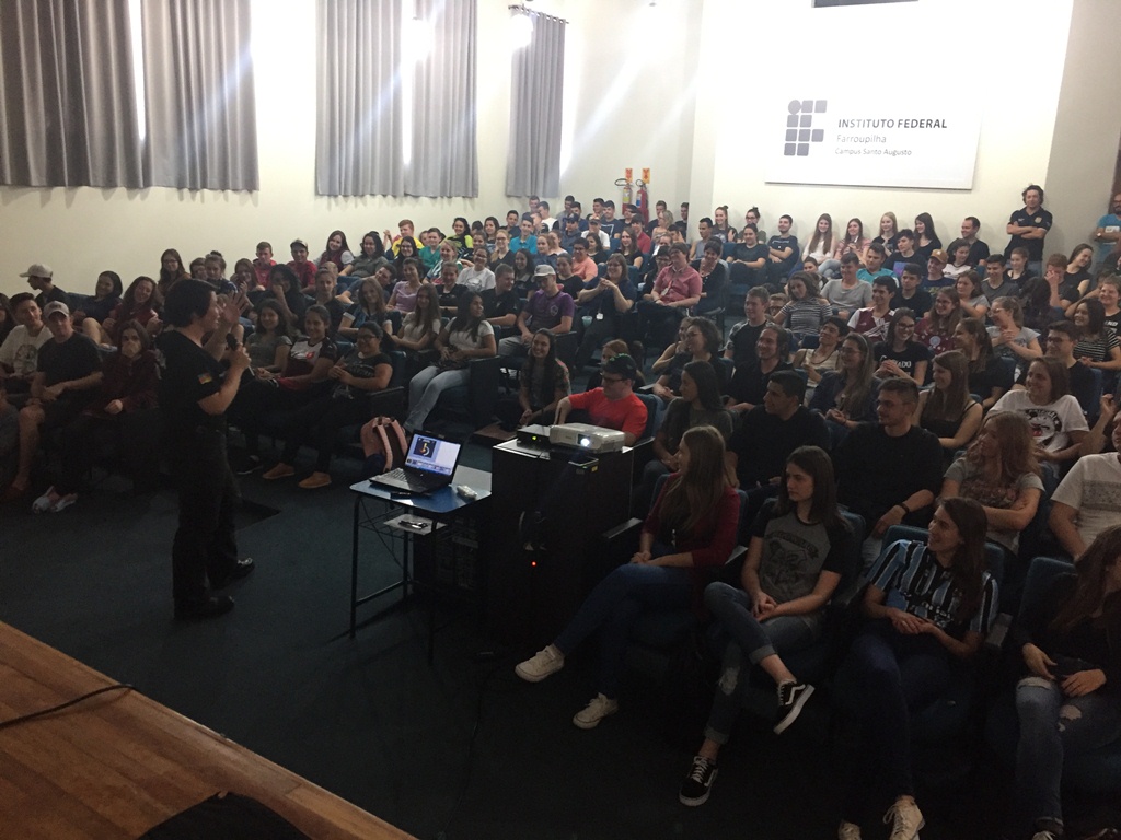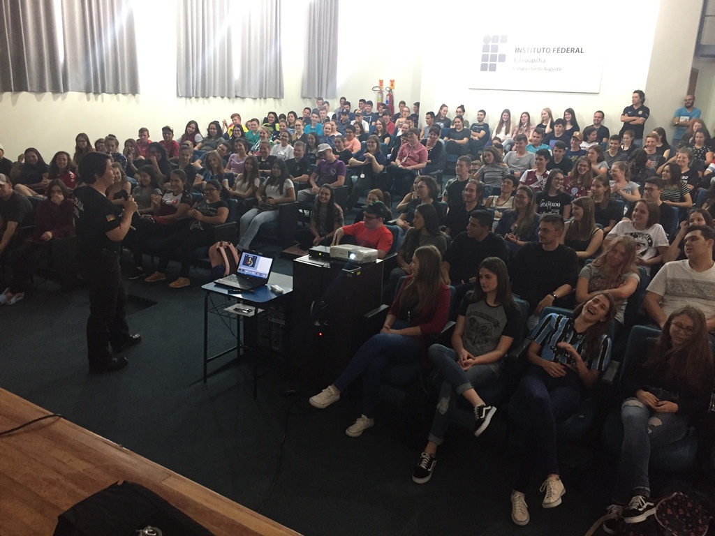 Os estudantes dos cursos técnicos integrados ao ensino médio do IFFar – Campus Santo Augusto receberam nesta quinta-feira, dia 24, a Delegada Caroline Bamberg Machado, responsável pela Delegacia Regional de Cruz Alta, para uma atividade alusiva ao Dia Nacional da Segurança e Saúde nas Escolas (10 de outubro), organizada pela Direção de Ensino, através dos setores de Assessoria Pedagógica e da Coordenação de Assistência Estudantil.