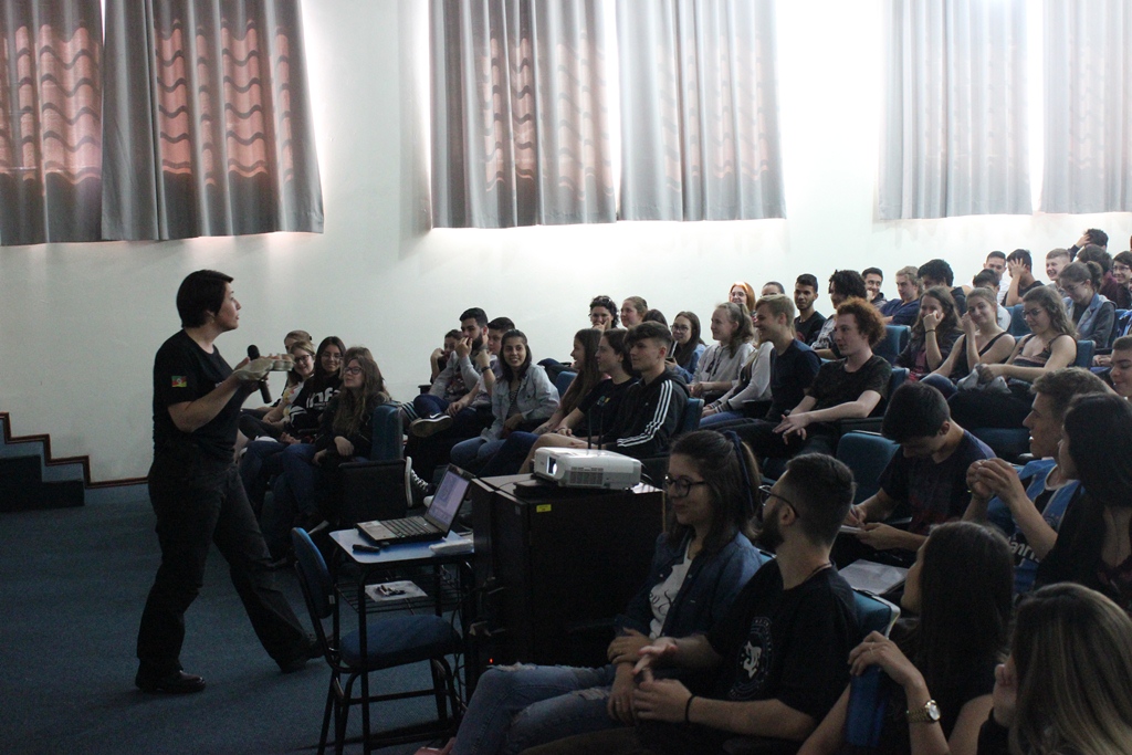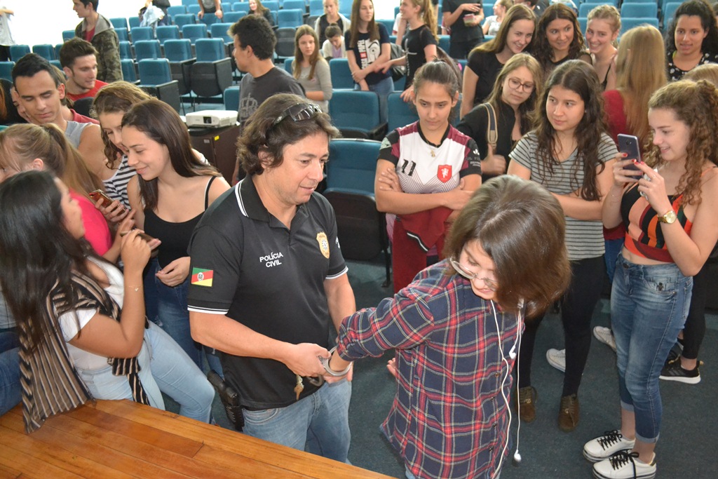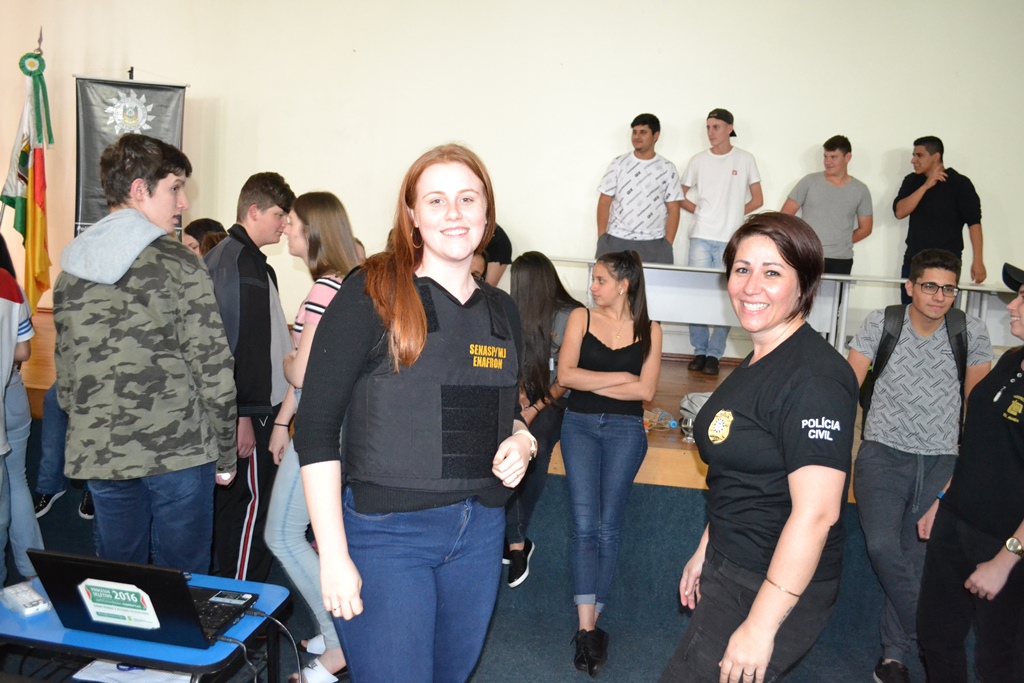 A conversa da Delegada com os estudantes foi bem informativa e descontraída, os quais interagiram bastante, tanto nos momentos de brincadeira, quanto nos assuntos mais sérios, como bullying, drogas e suicídio. No final os estudantes fizeram fila para provar um colete à prova de balas e também puderam brincar de ser algemados pela polícia. Caroline prometeu que em outra oportunidade virá até o campus para uma palestra para os estudantes dos cursos superiores.