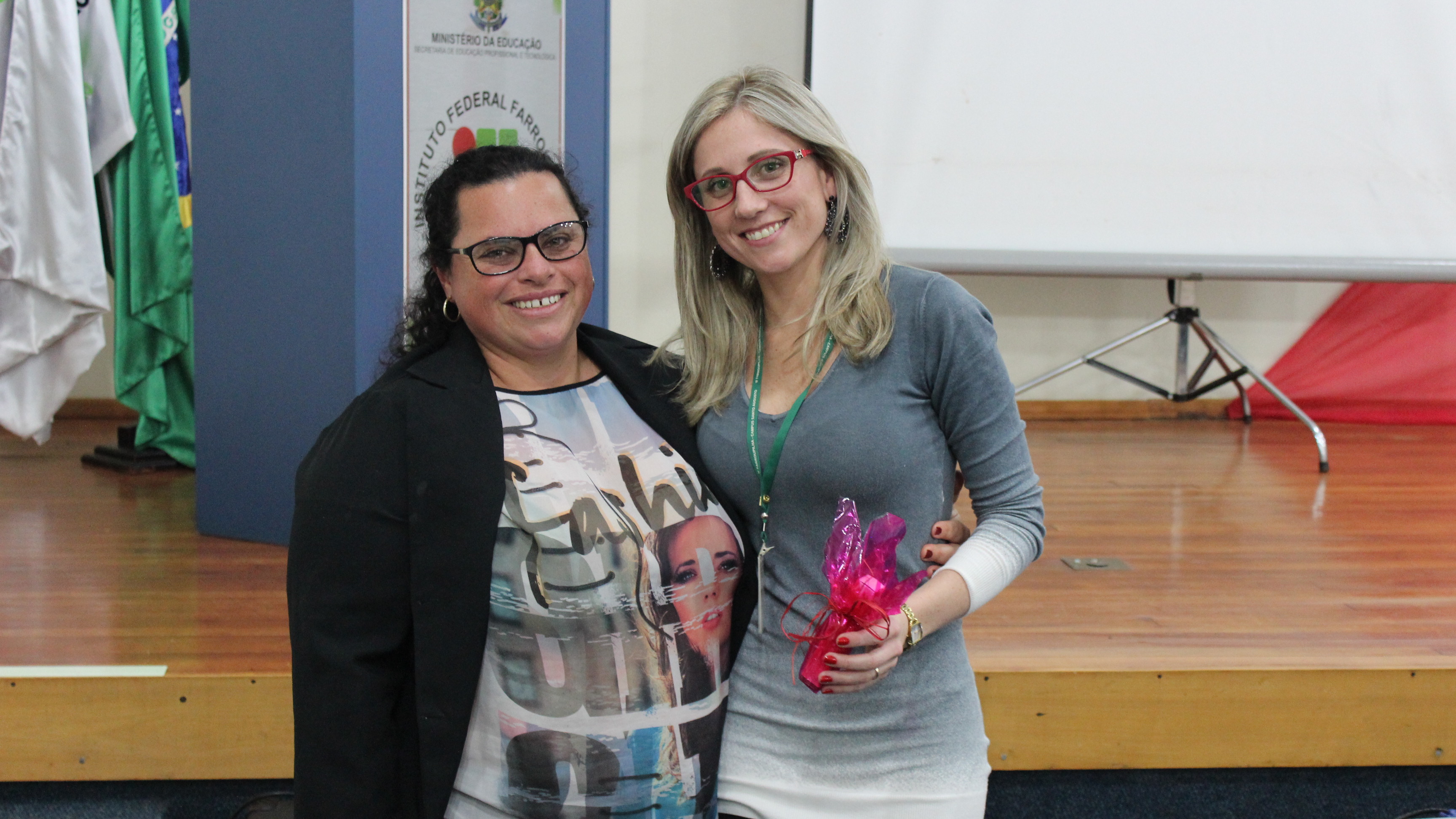 Professora Cintia Guariente (à direita), recebendo um mimo da aluna Maria Luciner Mosselin.