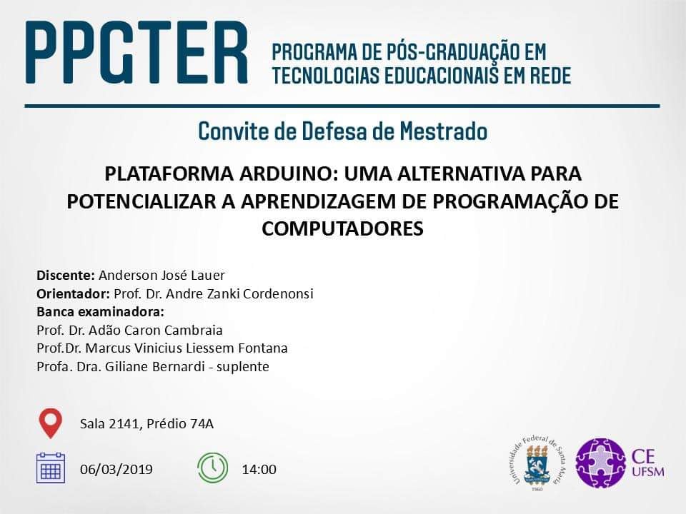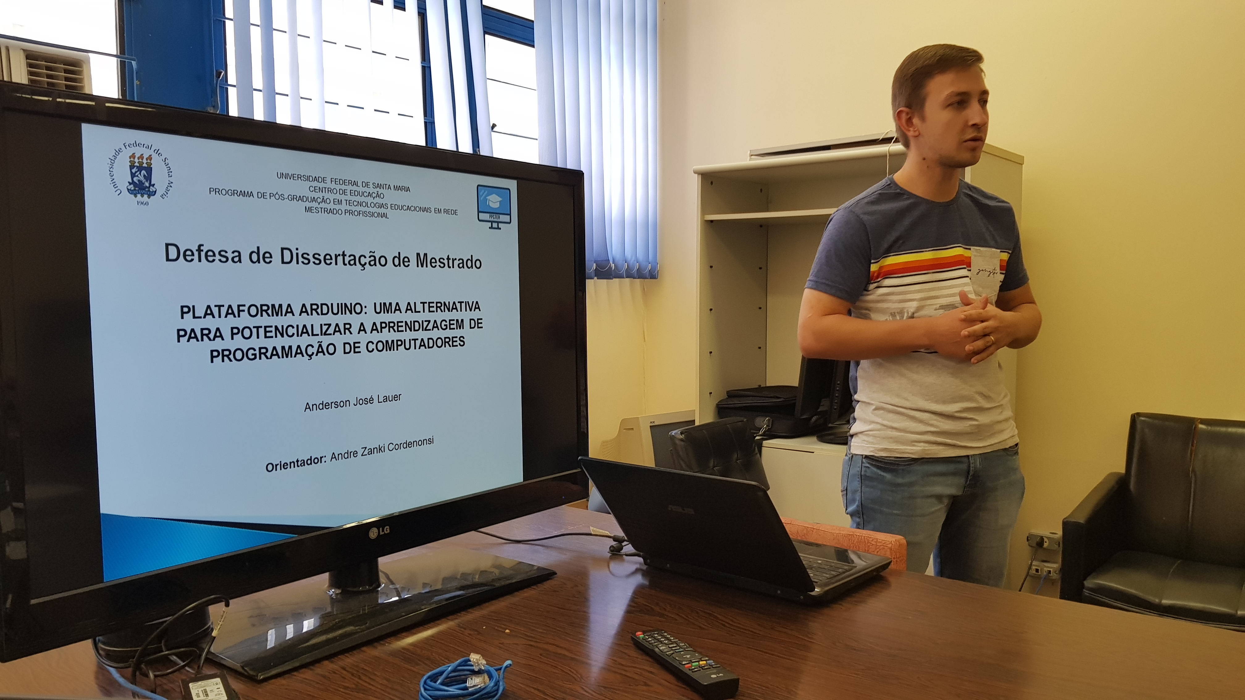O estudante do IFFar - Campus Santo Augusto, Anderson José Lauer, defendeu na última sexta-feira, dia 06 de março, a sua dissertação do Mestrado Profissional em Tecnologias Educacionais em Rede pela Universidade Federal de Santa Maria – UFSM. O trabalho intitulado “Plataforma Arduino: uma alternativa para potencializar a aprendizagem de programação de computadores”, foi avaliado pela banca composta pelos seguintes professores: Dr. André Zanki Cordenonsi (orientador), Dr. Adão Caron Cambraia (IFFar) e Dr. Marcus Vinicius Liessem Fontana (UFSM).
