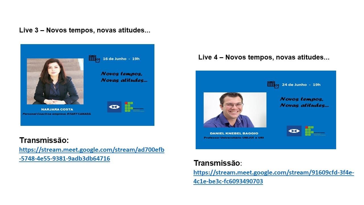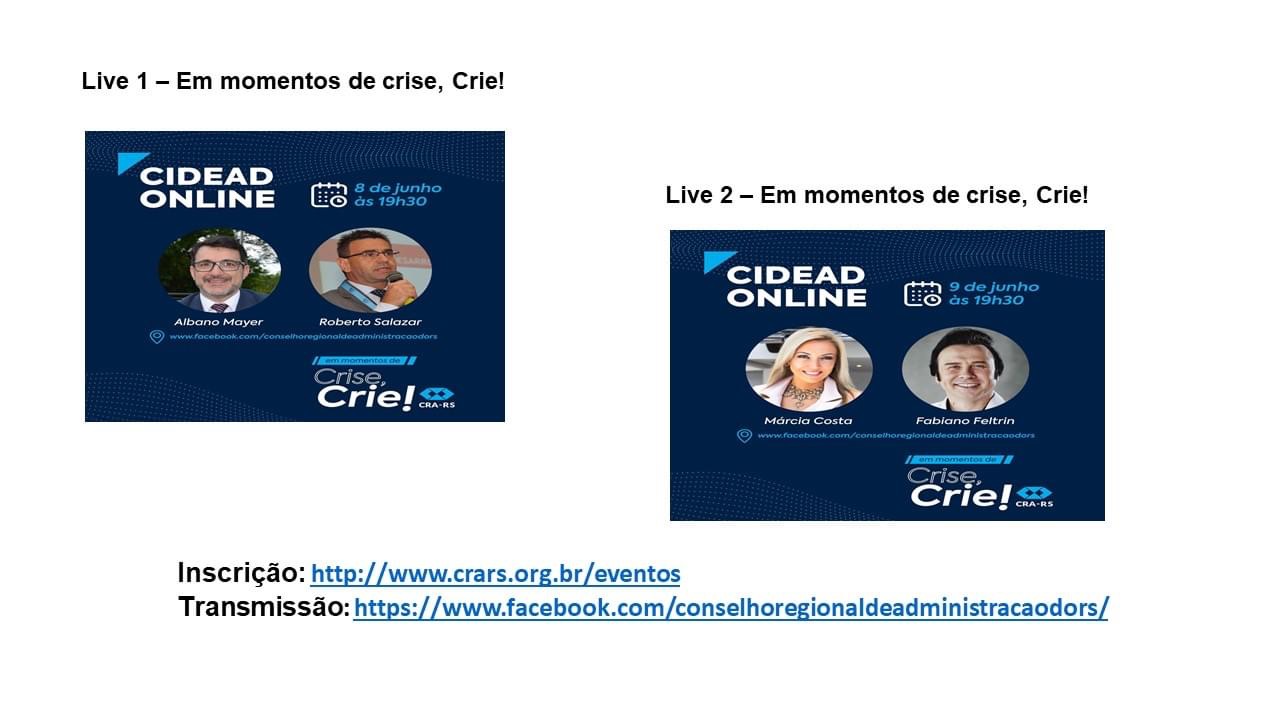 Nos dias 08 e 09 de junho aconteceram as lives do Ciclo de Debates em Administração – CIDEAD online, promovido pelo Conselho Regional de Administração do Rio Grande do Sul – CRA/RS, mediadas pela presidente, Claudia Abreu, com o tema, “Em momentos de crise, crie”, com o apoio do Bacharelado em Administração do IFFar – Campus Santo Augusto e de outras instituições de ensino. No dia 08 a live contou com os administradores, Albano Mayer e Roberto Salazar e no dia 09 com os administradores, Márcia Costa e Fabiano Feltrin. Nos dias 16 e 24 de junho o tema foi “Novos tempos, novas atitudes, sendo a live do dia 16, ministrada por Narjara Costa (Coach da empresa Start no Canadá) e no dia 24 pelo professor da Unijuí e da Uri, Dr. Daniel Knebel Baggio.