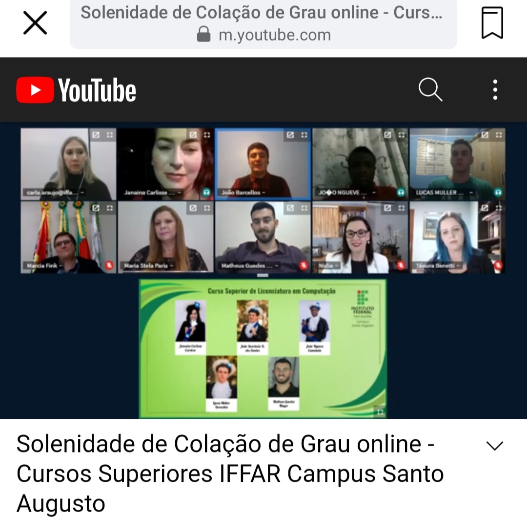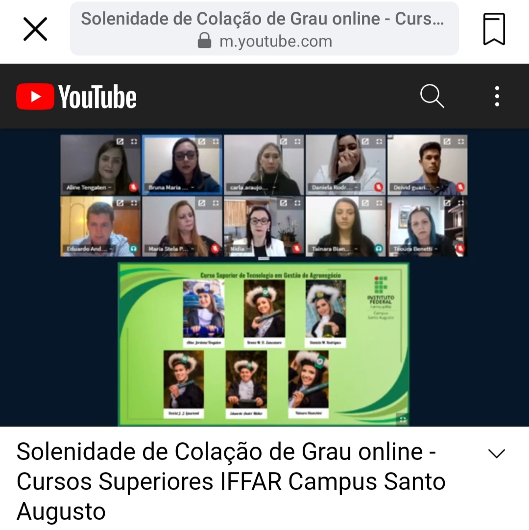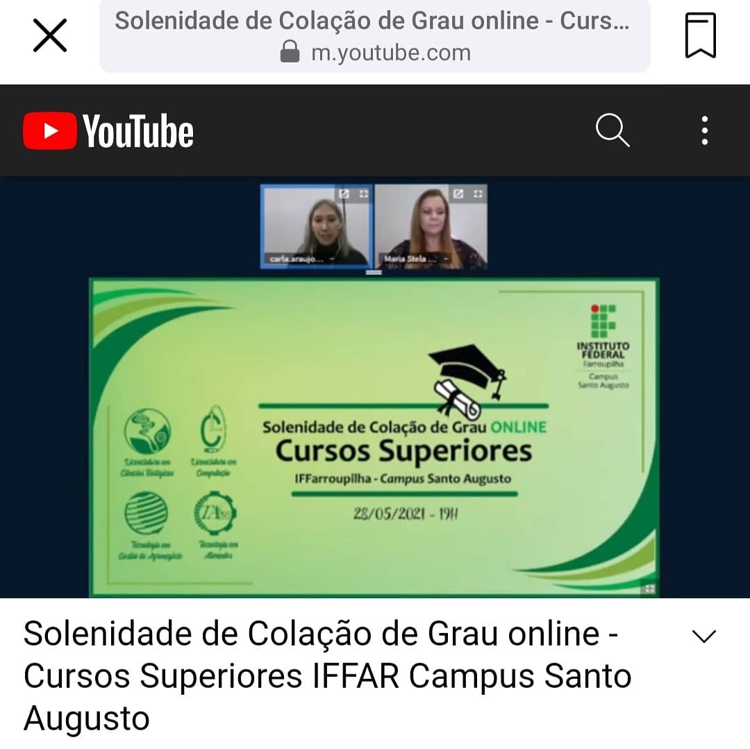O IFFar - Campus Santo Augusto realizou na noite de ontem, às 19h, a solenidade de Colação de Grau dos cursos superiores de Licenciatura em Ciências Biológicas, Licenciatura em Computação, Tecnologia em Alimentos e Tecnologia em Gestão do Agronegócio. A solenidade foi online, devido a pandemia de COVID 19, sendo transmitida pelo canal do IFFar - Campus Santo Augusto no You Tube ( https://youtu.be/W1naqNMXST8) .
