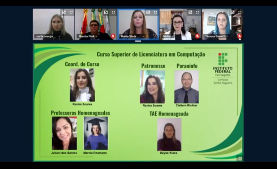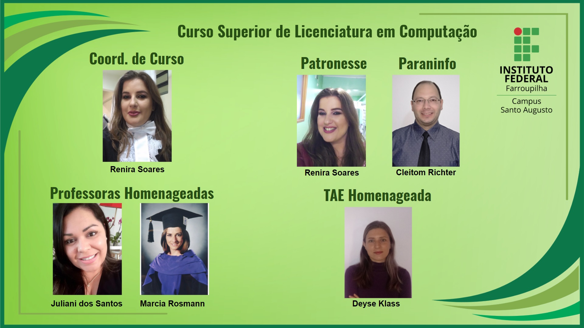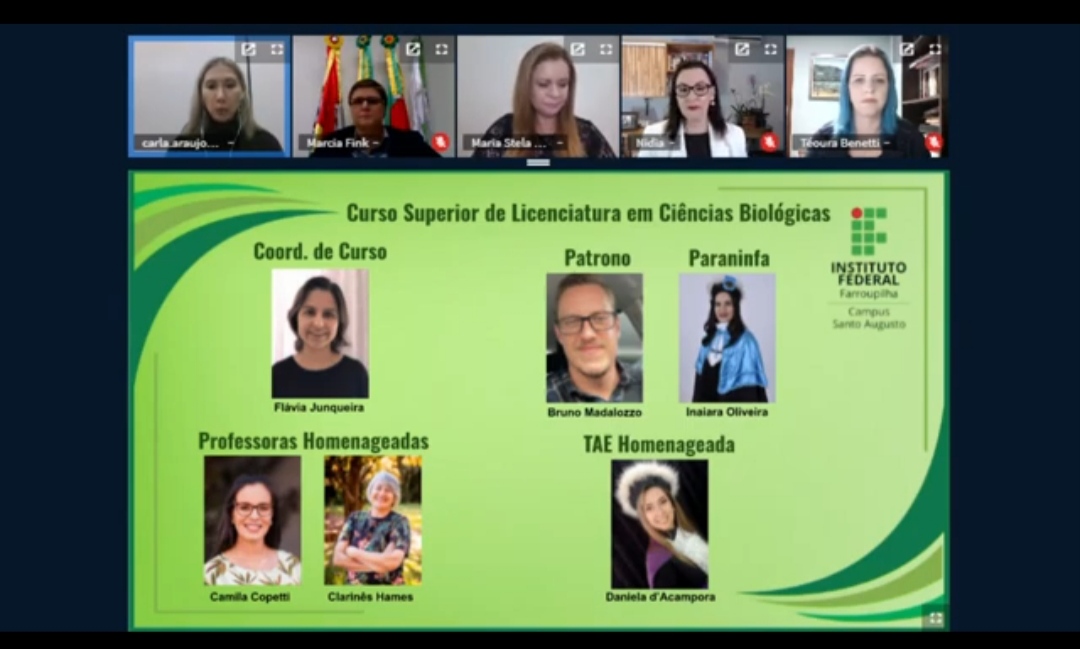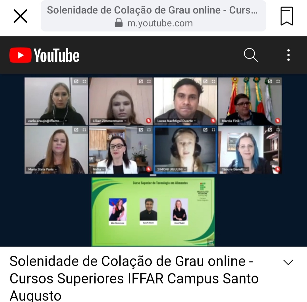 O IFFar - Campus Santo Augusto realizou na noite de ontem, às 19h, a solenidade de Colação de Grau dos cursos superiores de Licenciatura em Ciências Biológicas, Licenciatura em Computação, Tecnologia em Alimentos e Tecnologia em Gestão do Agronegócio. A solenidade foi online, devido a pandemia de COVID 19, sendo transmitida pelo canal do IFFar - Campus Santo Augusto no You Tube ( https://youtu.be/W1naqNMXST8) .