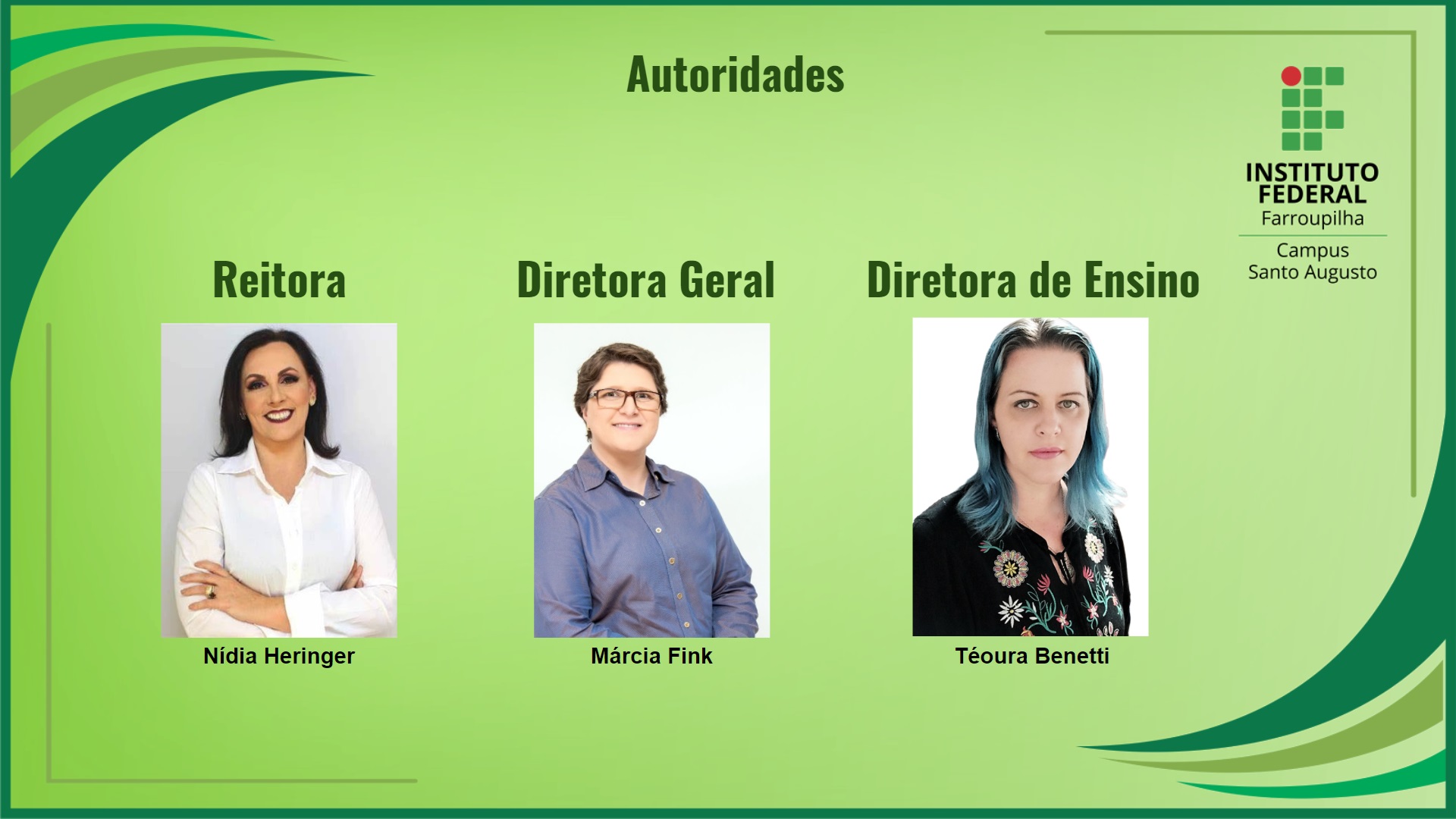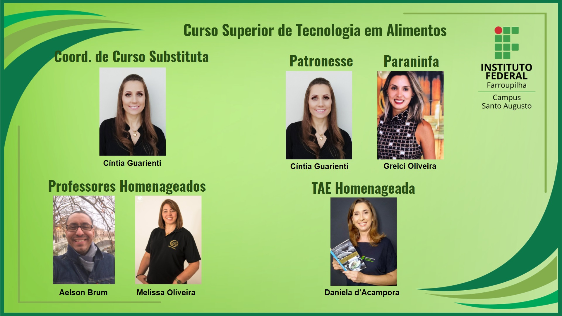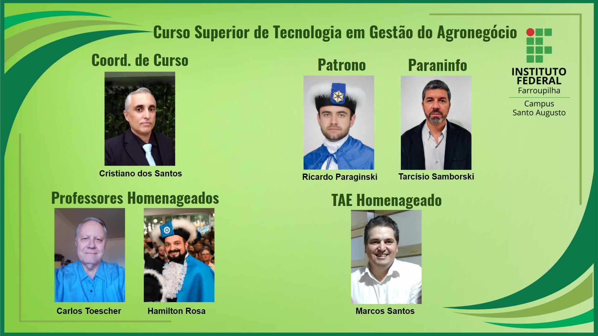 Participaram da solenidade além dos formandos, a Reitora do IFFar, Nidia Heringer; a Diretora Geral do Campus Santo Augusto, Márcia Fink; a Diretora de Ensino, Teoura Benetti, paraninfos, patronos e homenageados dos cursos.