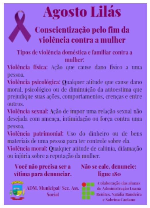 A professora de língua inglesa do IFFar – Campus Santo Augusto, Miquela Piaia, organizou no primeiro semestre deste ano com os estudantes dos segundos anos dos cursos técnicos de administração, agropecuária e informática, uma proposta didática, em língua materna e estrangeira, que contribuiu com a prática de multiletramento, baseado na produção e compreensão de gêneros discursivos, utilizando o gênero AWARENESS CAMPAIGN (Campanha de Conscientização).