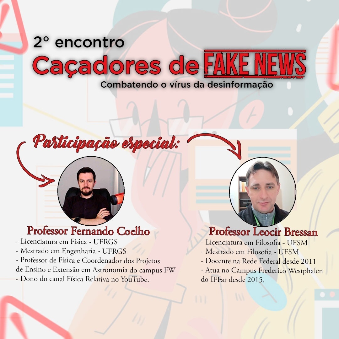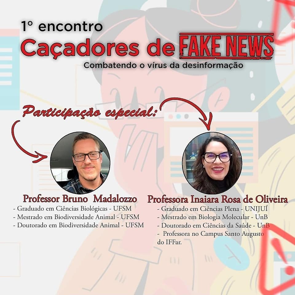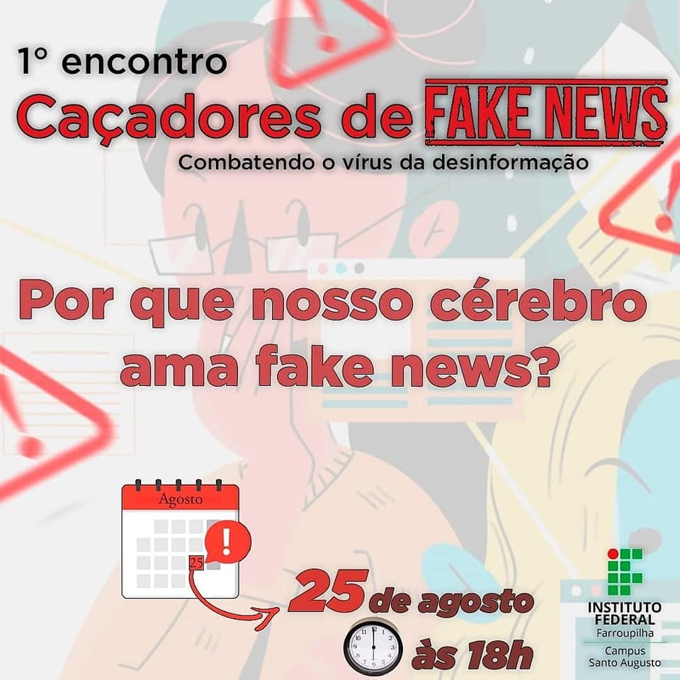 Iniciaram no dia 25 de agosto as atividades do projeto de ensino “Caçadores de fake news: combatendo o vírus da desinformação”, com o objetivo de possibilitar um espaço institucional para debates, reflexões e investigações sobre notícias falsas, seu alcance e impactos em nossa instituição e sociedade. O primeiro encontro virtual trouxe a temática “Por que nosso cérebro ama fake news?, tendo como convidados a professora Drª Inaiara Rosa de Oliveira e o professor Dr. Bruno Madalozzo. O debate está disponível no canal do projeto no youtube, disponível no link https://youtu.be/iJj606wJE-o