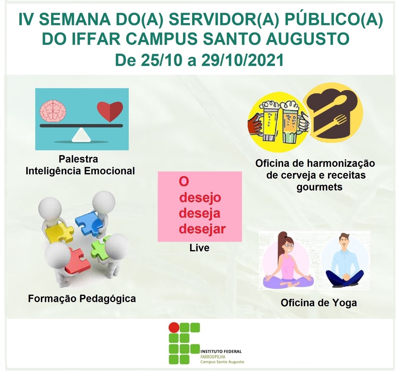 O IFFar – Campus Santo Augusto, promove de 25 a 29 de outubro a IV Semana do Servidor, em comemoração ao Dia do Servidor Público, com atividades virtuais via plataforma GoToMeeting. A programação, alusiva ao Dia do Servidor, comemorado no dia 28 de outubro, organizada pela Coordenação de Gestão de Pessoas, com o apoio da Direção de Planejamento e Desenvolvimento Institucional, contará com várias atividades online voltadas aos servidores da instituição, oportunizando momentos de descontração e conhecimento, sempre a partir das 14 horas.