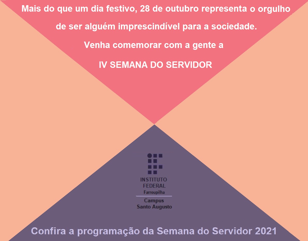 Os organizadores da Semana do Servidor e a Direção do IFFar – Campus Santo Augusto, desde já parabenizam a todos os servidores públicos, que exercem com dignidade sua profissão; ajudam a construir a organização social, colocando projetos em prática, propiciando assim inúmeras mudanças em nossa sociedade. A todos que se empenham na missão de servir com responsabilidade, comprometimento e postura ética, o exercício da função pública, o IFFar - Campus Santo Augusto reafirma o reconhecimento, e agradece por todo o esforço e dedicação dispensados a essa instituição de ensino.