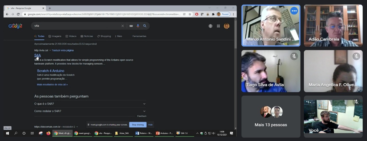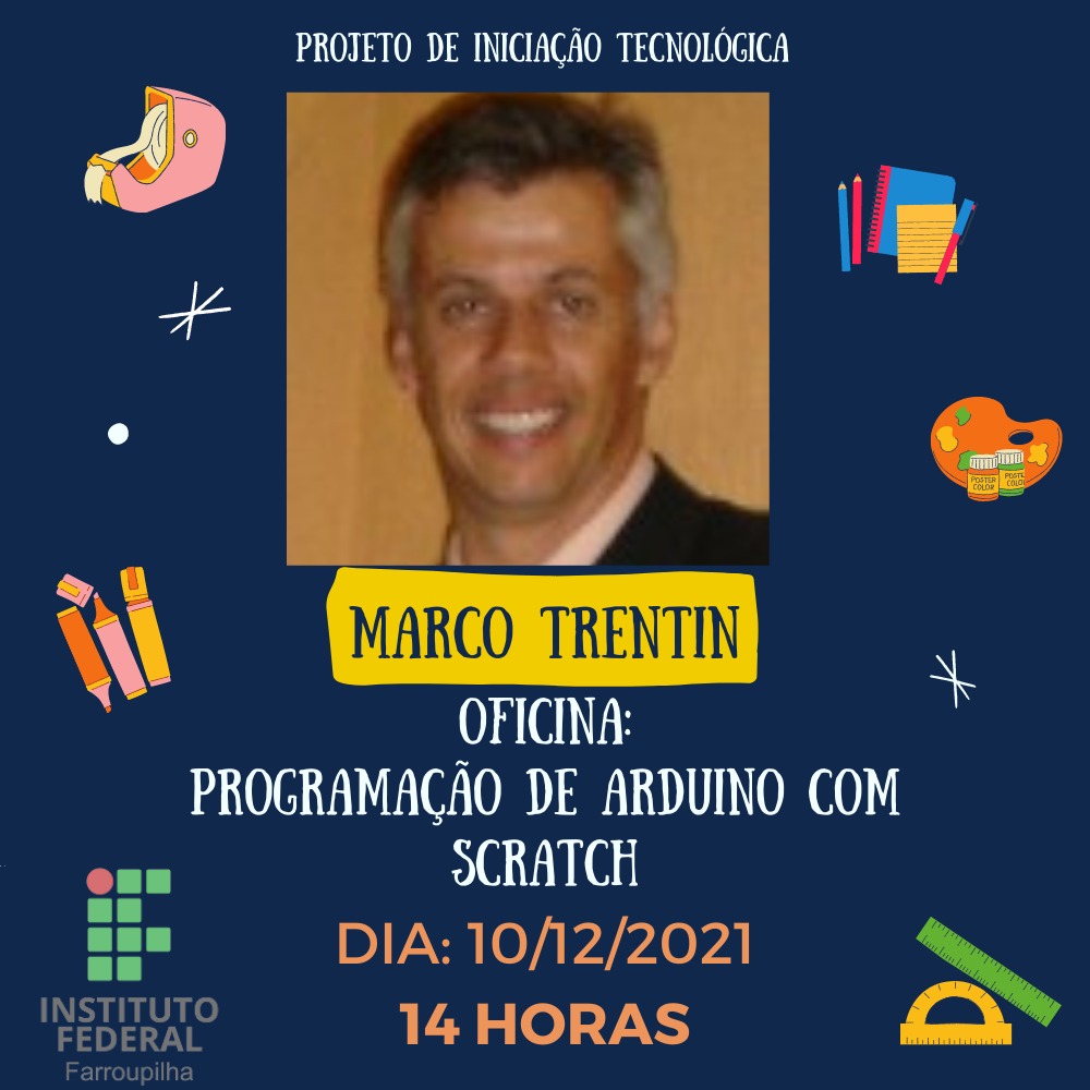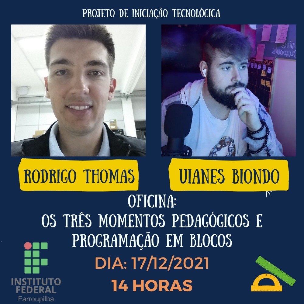 O primeiro encontro online do projeto aconteceu no dia 06 de dezembro, através da formação conjunta com a equipe do Campus de Júlio de Castilhos, coordenada pela professora Drª. Angélica Oliveira, tendo como tema “Metodologias Ativas com programação Scratch”, ministrado pela professora do IFFar, Maria Angélica Figueiredo de Oliveira. O segundo encontro aconteceu no dia 08 de dezembro, com o tema “Computação desplugada”, ministrado pela professora Dr. Aline Bona do IFRS. O terceiro encontro aconteceu no dia 10 de dezembro, com o tema “Scratch para robótica”, ministrado pelo professor da UPF, Dr. Marco Trentin. O quarto e último encontro será no dia 17 de dezembro, com o tema “Momentos pedagógicos e projetos integrados com Scratch”, ministrado pelo servidor do Campus Santo Ângelo, Rodrigo Thomas (mestrando do ProfePT/IFFar) e pelo professor municipal e bolsista do projeto Uianes Biondo (egresso da Licenciatura em Computação do Campus Santo Augusto atualmente mestrando na UFSM).