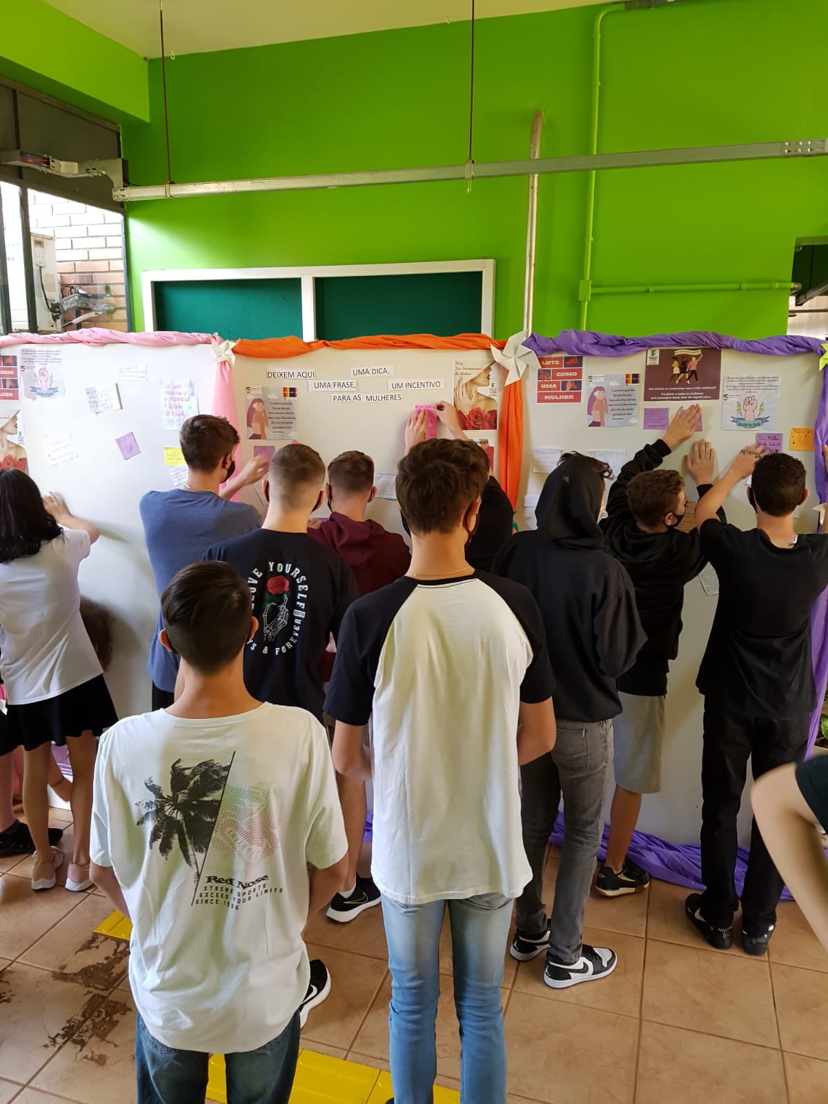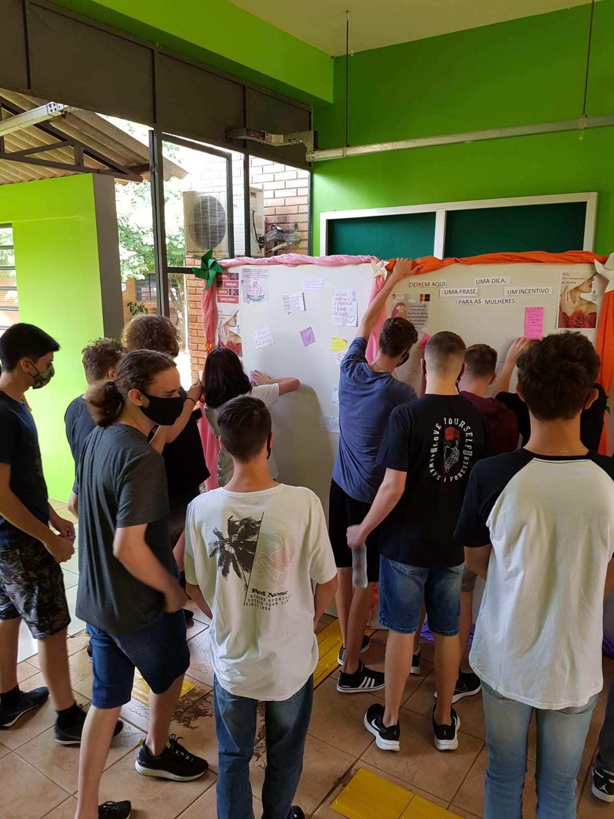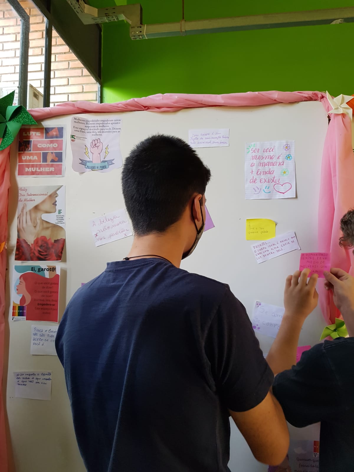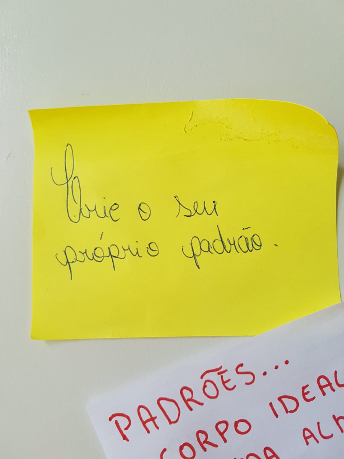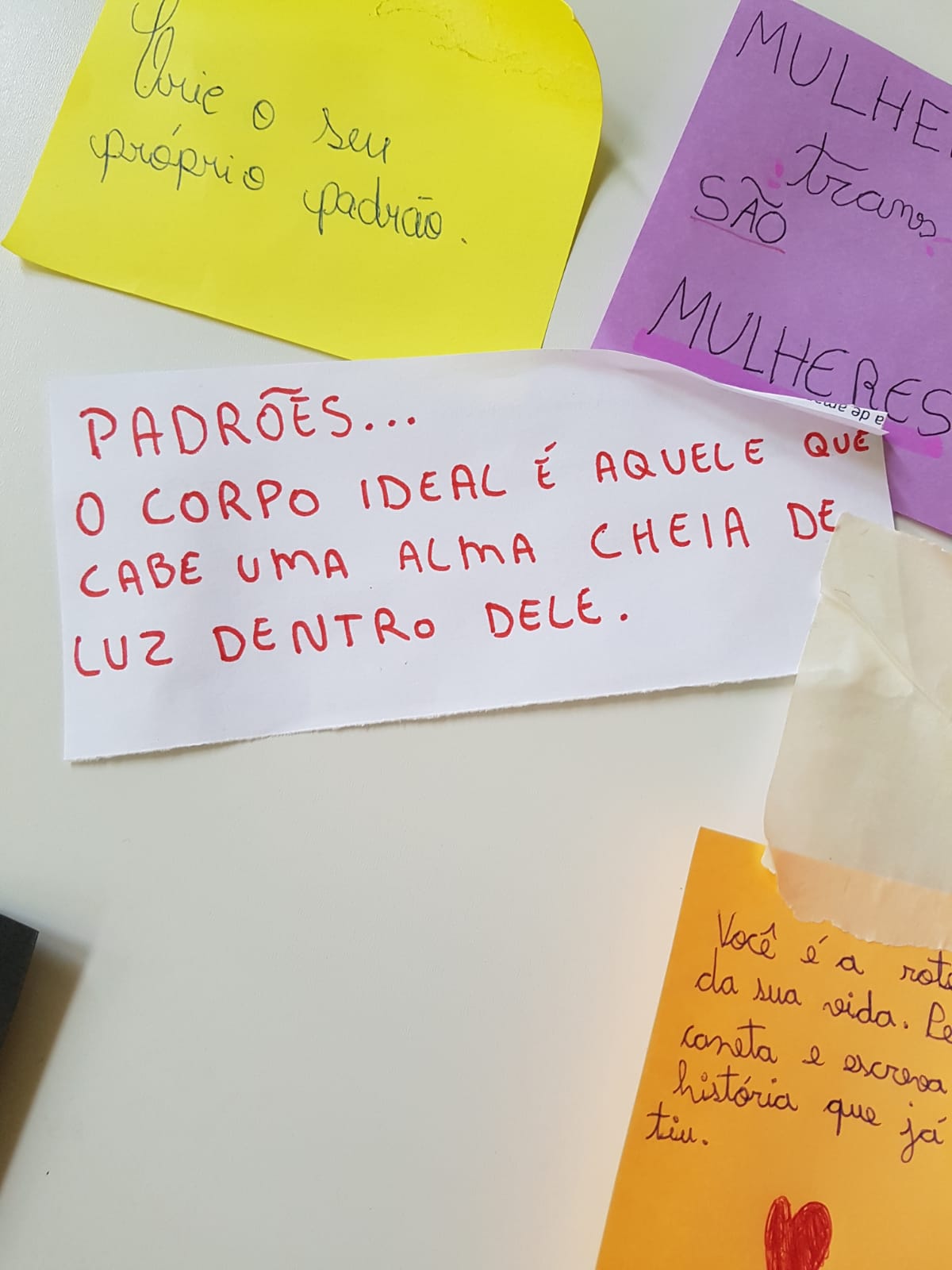 A professora de Educação Física, Laís Cavalheiro Rigo, desenvolveu nas aulas o diagnóstico individual dos/as estudantes com aferição de peso e altura para o cálculo do Índice de Massa Corporal, paralelo a esse diagnóstico a discussão realizada foi acerca das temáticas peso x saúde: uma medida para além dos números. A intenção da discussão foi orientar os/as estudantes a buscar saúde acima de qualquer medida. Na oportunidade também foi conversado sobre os padrões estéticos que a mídia e a indústria impõem fortemente, sobre homens e mulheres, mas enfatizando os padrões estéticos impostos para as mulheres levantando a temática: Mulher, você é mais que um padrão. Os alunos e as alunas realizaram a leitura do texto “Padrão de Beleza: está na hora de amar nosso corpo ao invés de escondê-lo”, escrito por Cinthya Dávila da Redação Minha Vida, com o objetivo de instigar e ajudar na criação dos recados para o mural.