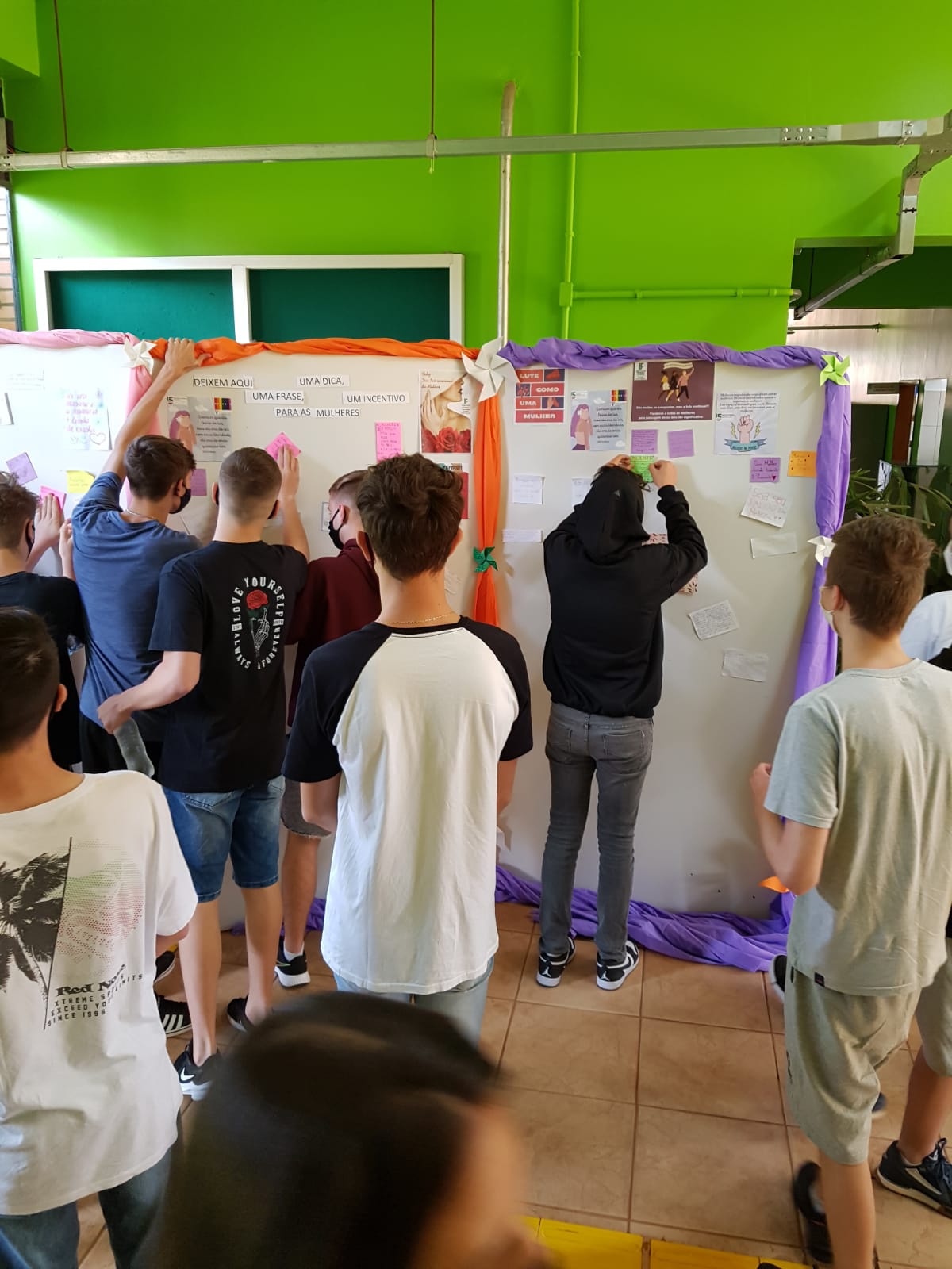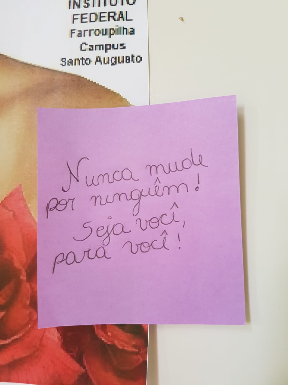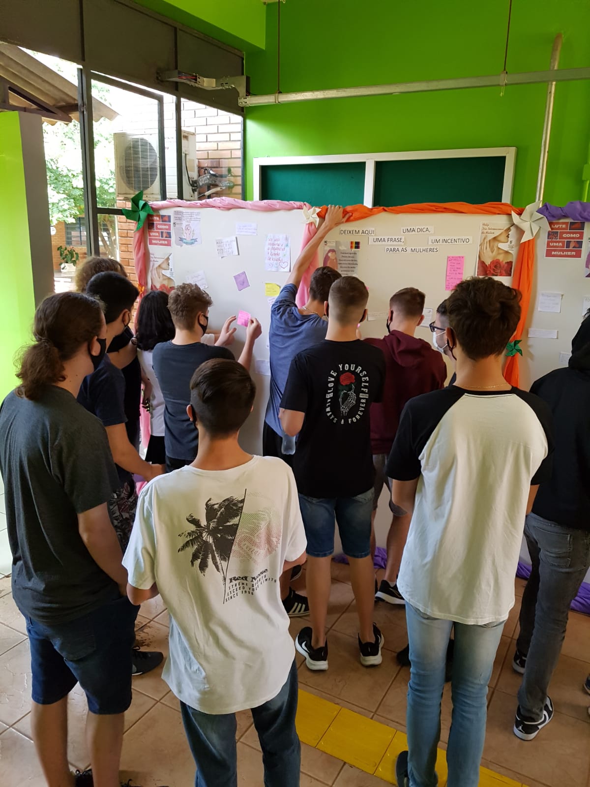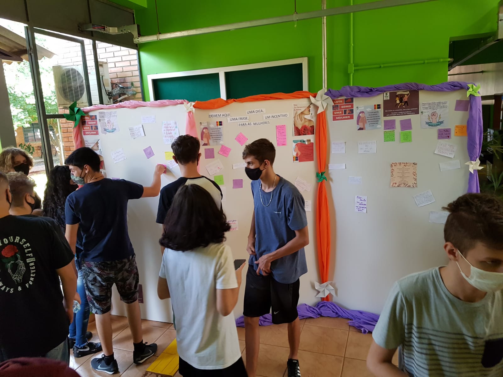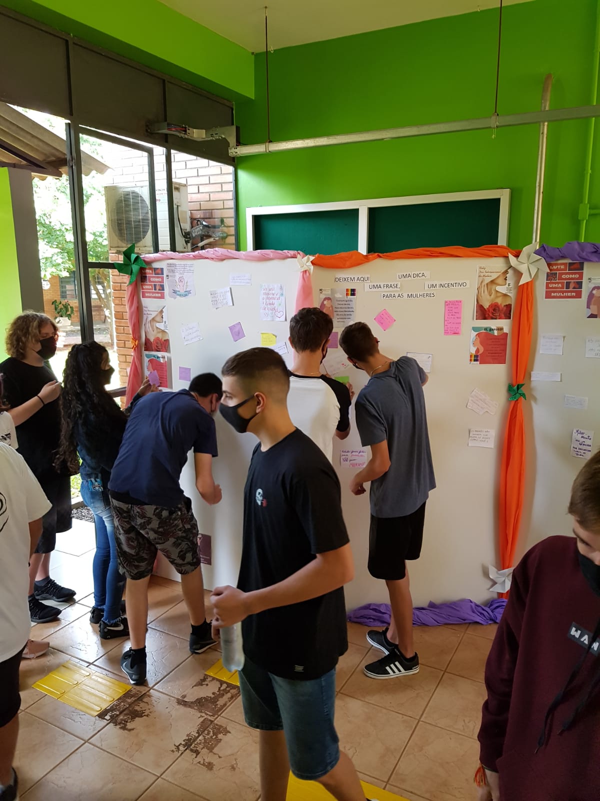 A professora de Educação Física, Laís Cavalheiro Rigo, desenvolveu nas aulas o diagnóstico individual dos/as estudantes com aferição de peso e altura para o cálculo do Índice de Massa Corporal, paralelo a esse diagnóstico a discussão realizada foi acerca das temáticas peso x saúde: uma medida para além dos números. A intenção da discussão foi orientar os/as estudantes a buscar saúde acima de qualquer medida. Na oportunidade também foi conversado sobre os padrões estéticos que a mídia e a indústria impõem fortemente, sobre homens e mulheres, mas enfatizando os padrões estéticos impostos para as mulheres levantando a temática: Mulher, você é mais que um padrão. Os alunos e as alunas realizaram a leitura do texto “Padrão de Beleza: está na hora de amar nosso corpo ao invés de escondê-lo”, escrito por Cinthya Dávila da Redação Minha Vida, com o objetivo de instigar e ajudar na criação dos recados para o mural.