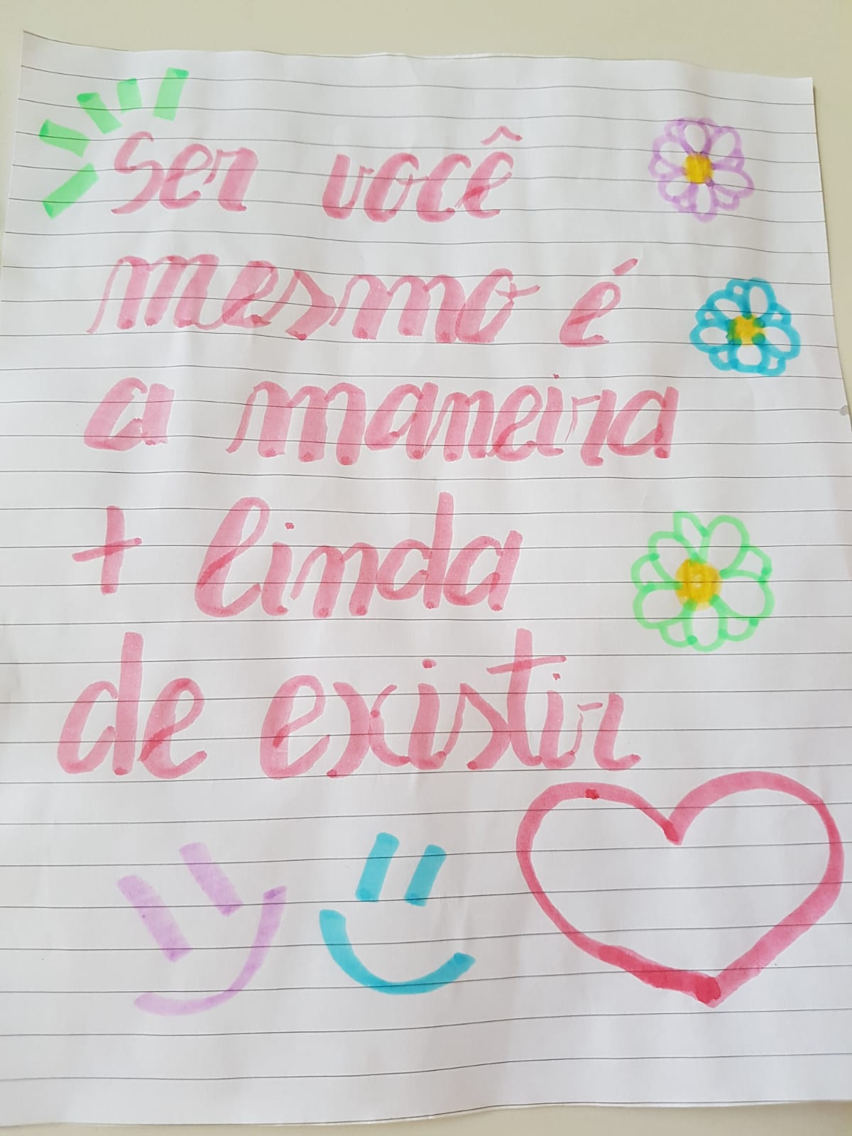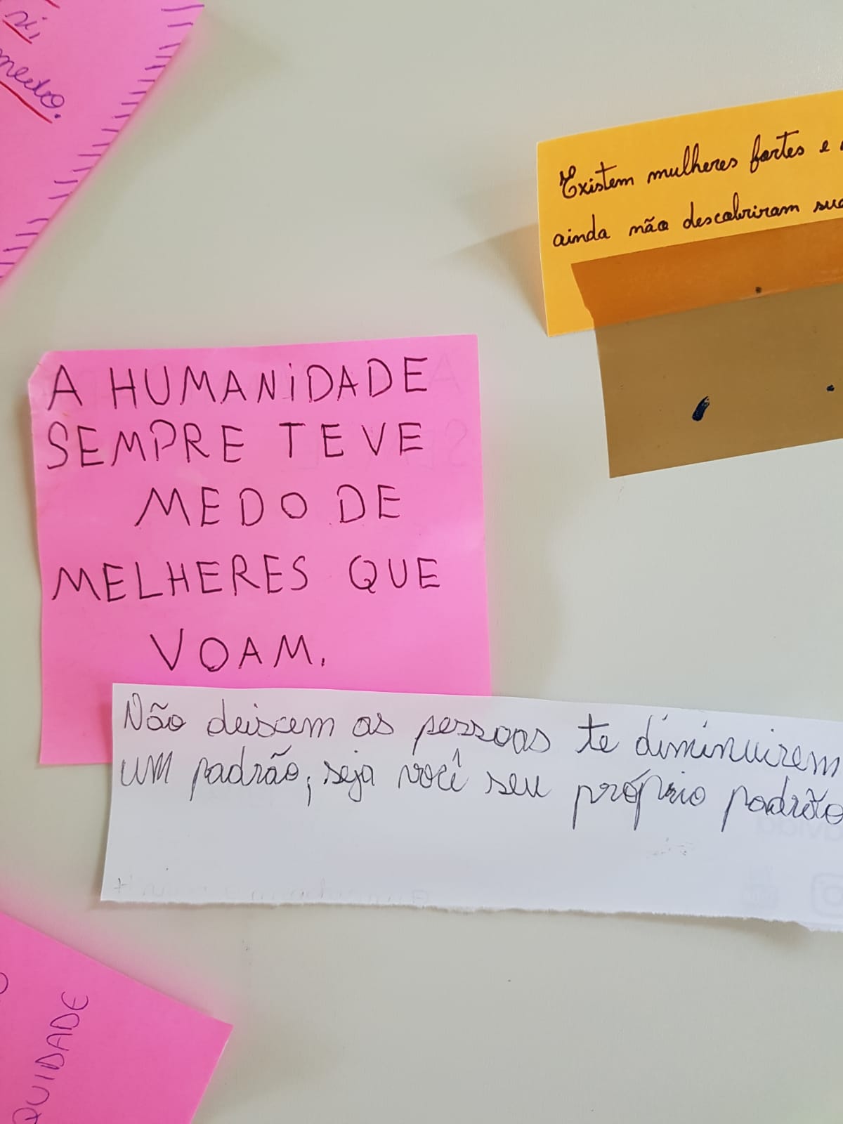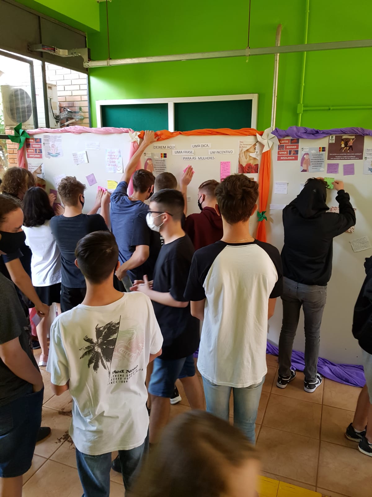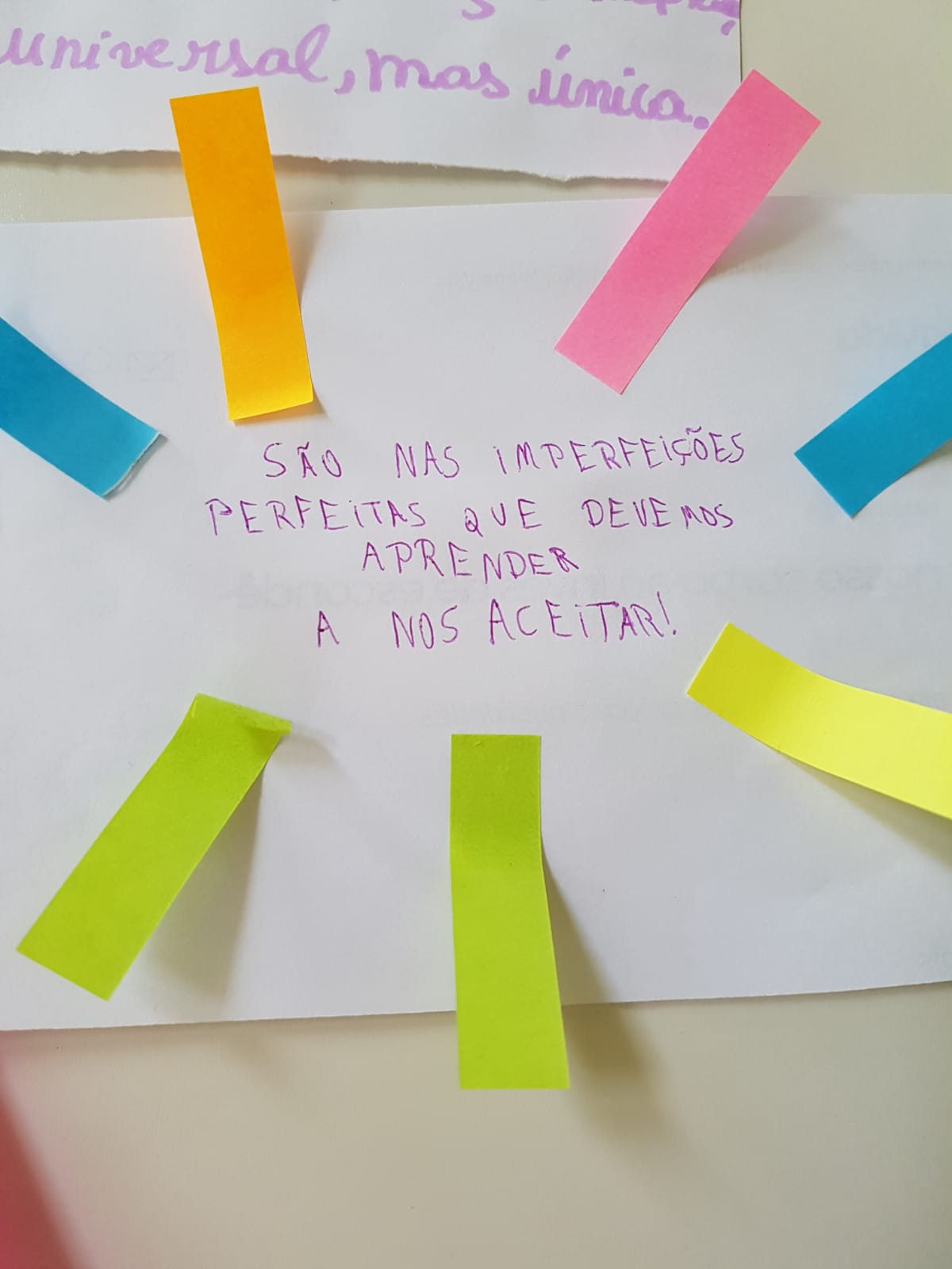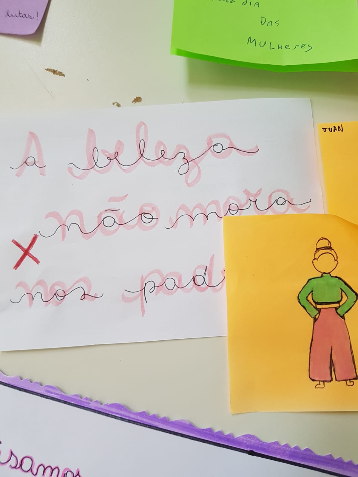 A professora de Educação Física, Laís Cavalheiro Rigo, desenvolveu nas aulas o diagnóstico individual dos/as estudantes com aferição de peso e altura para o cálculo do Índice de Massa Corporal, paralelo a esse diagnóstico a discussão realizada foi acerca das temáticas peso x saúde: uma medida para além dos números. A intenção da discussão foi orientar os/as estudantes a buscar saúde acima de qualquer medida. Na oportunidade também foi conversado sobre os padrões estéticos que a mídia e a indústria impõem fortemente, sobre homens e mulheres, mas enfatizando os padrões estéticos impostos para as mulheres levantando a temática: Mulher, você é mais que um padrão. Os alunos e as alunas realizaram a leitura do texto “Padrão de Beleza: está na hora de amar nosso corpo ao invés de escondê-lo”, escrito por Cinthya Dávila da Redação Minha Vida, com o objetivo de instigar e ajudar na criação dos recados para o mural.