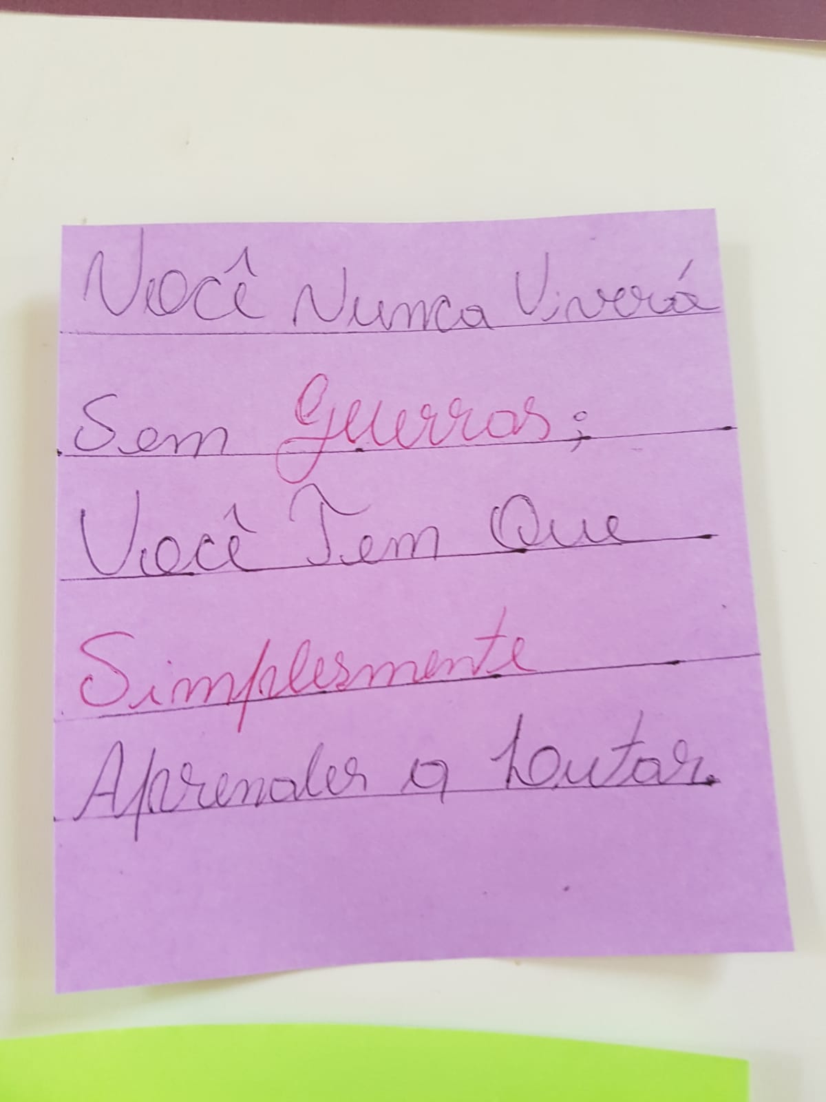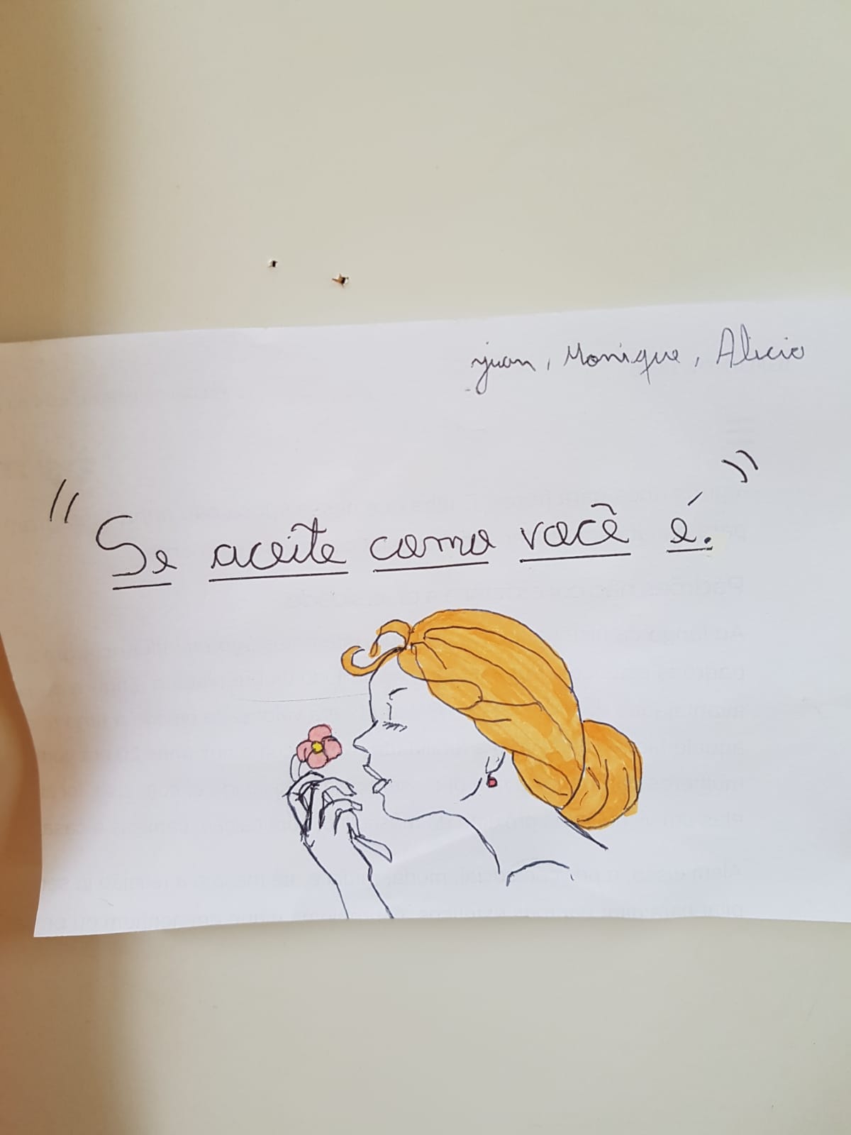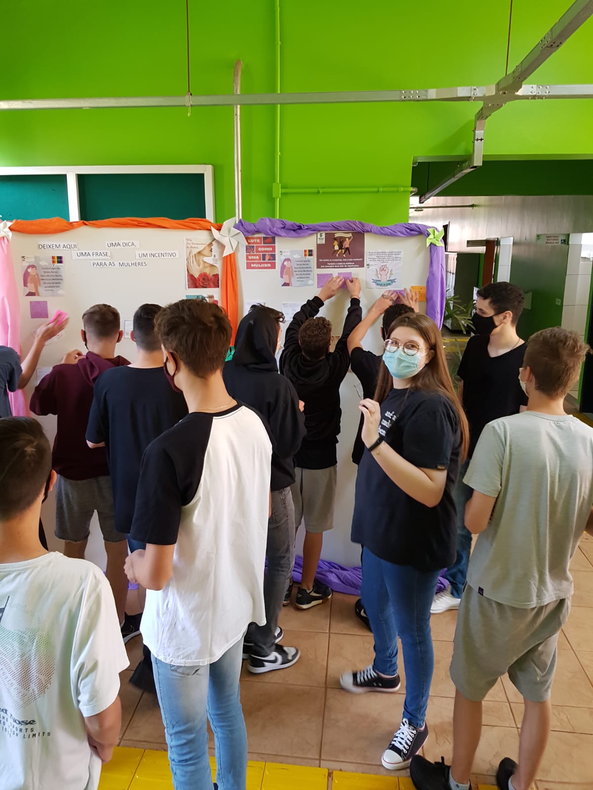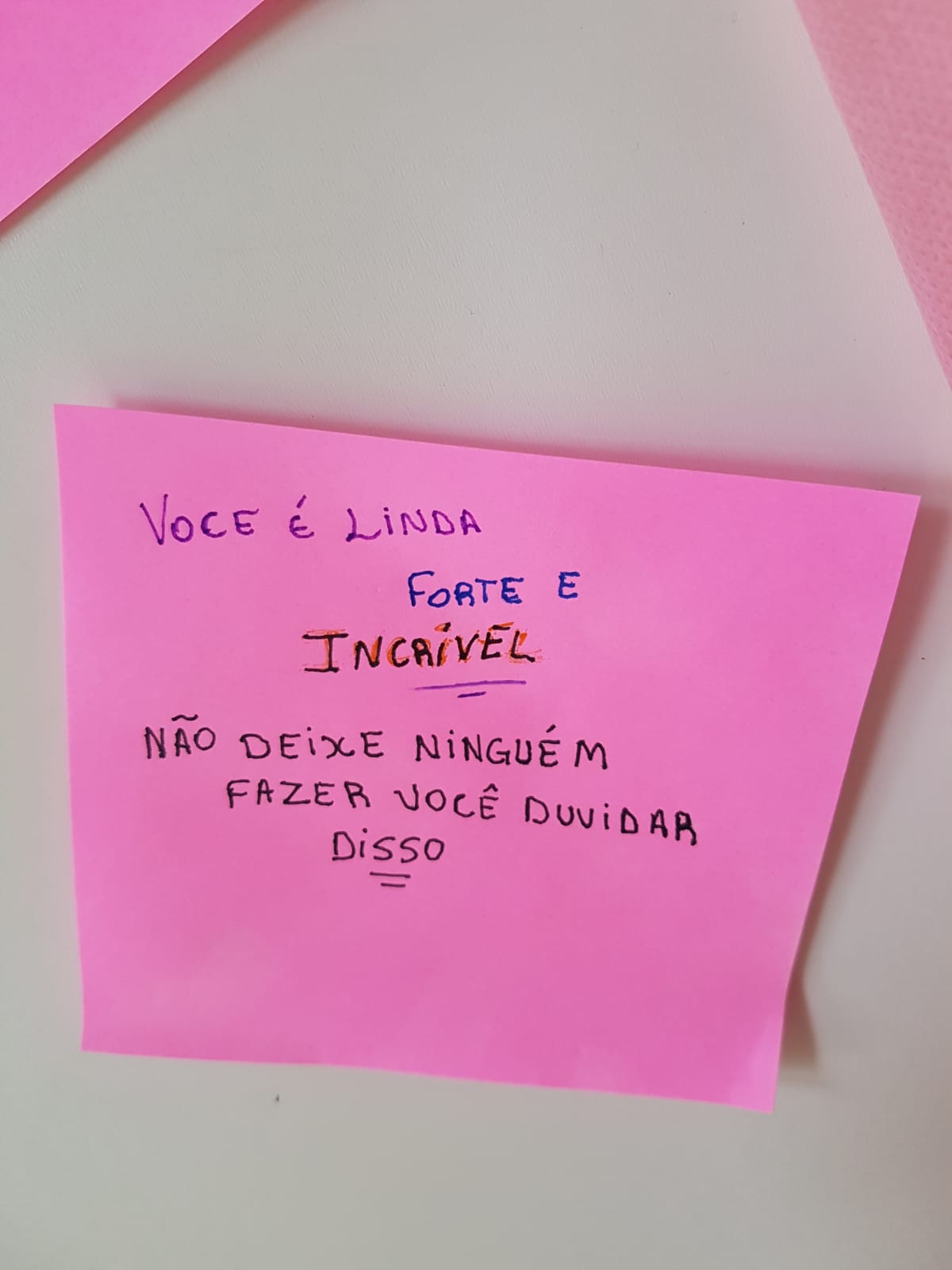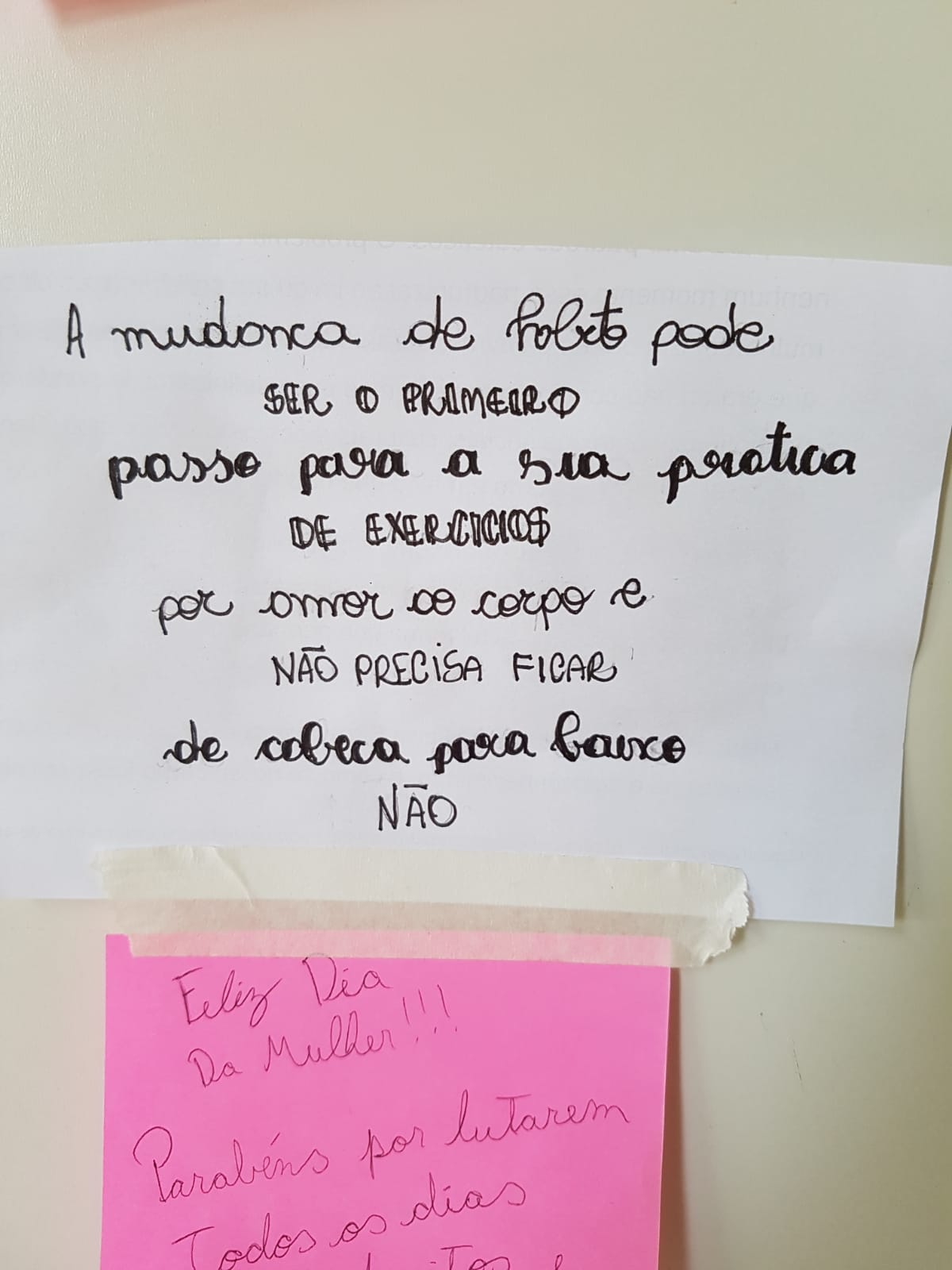 A professora de Educação Física, Laís Cavalheiro Rigo, desenvolveu nas aulas o diagnóstico individual dos/as estudantes com aferição de peso e altura para o cálculo do Índice de Massa Corporal, paralelo a esse diagnóstico a discussão realizada foi acerca das temáticas peso x saúde: uma medida para além dos números. A intenção da discussão foi orientar os/as estudantes a buscar saúde acima de qualquer medida. Na oportunidade também foi conversado sobre os padrões estéticos que a mídia e a indústria impõem fortemente, sobre homens e mulheres, mas enfatizando os padrões estéticos impostos para as mulheres levantando a temática: Mulher, você é mais que um padrão. Os alunos e as alunas realizaram a leitura do texto “Padrão de Beleza: está na hora de amar nosso corpo ao invés de escondê-lo”, escrito por Cinthya Dávila da Redação Minha Vida, com o objetivo de instigar e ajudar na criação dos recados para o mural.