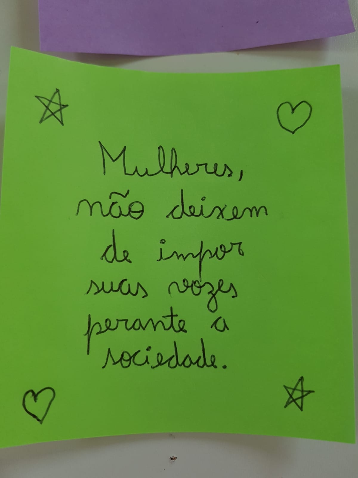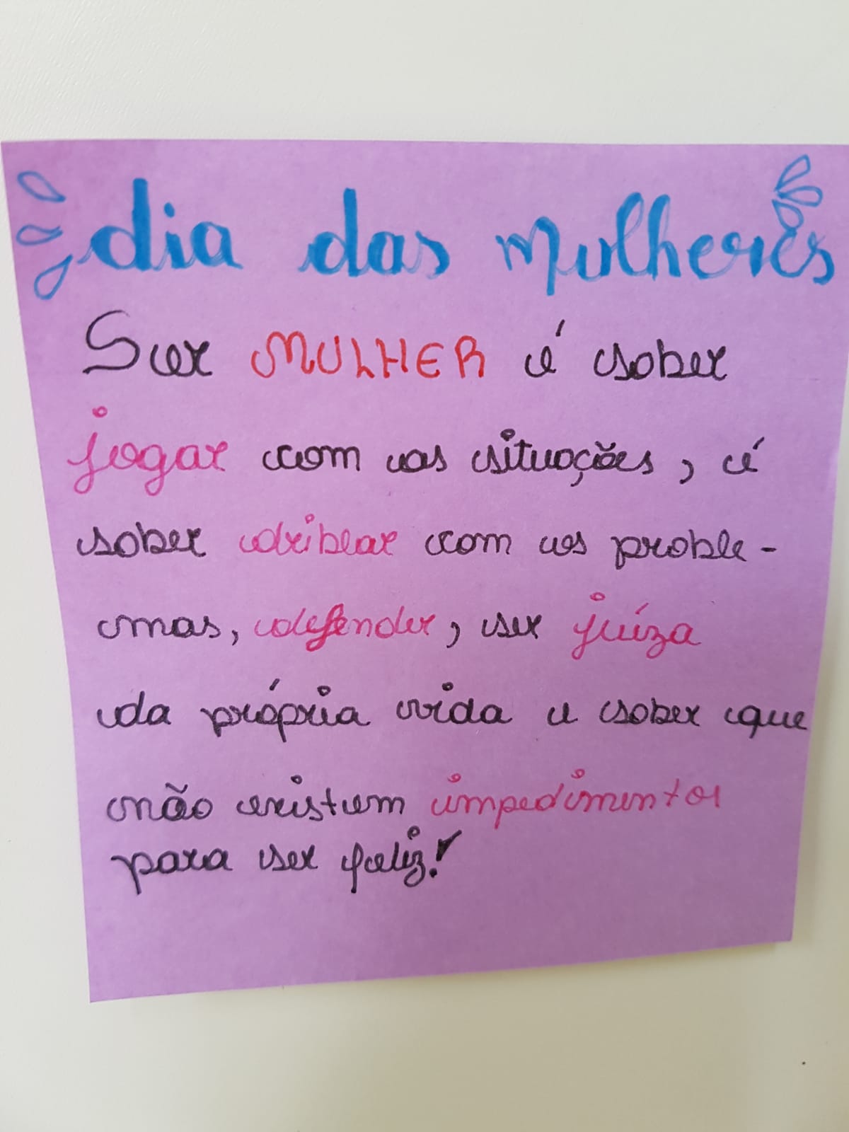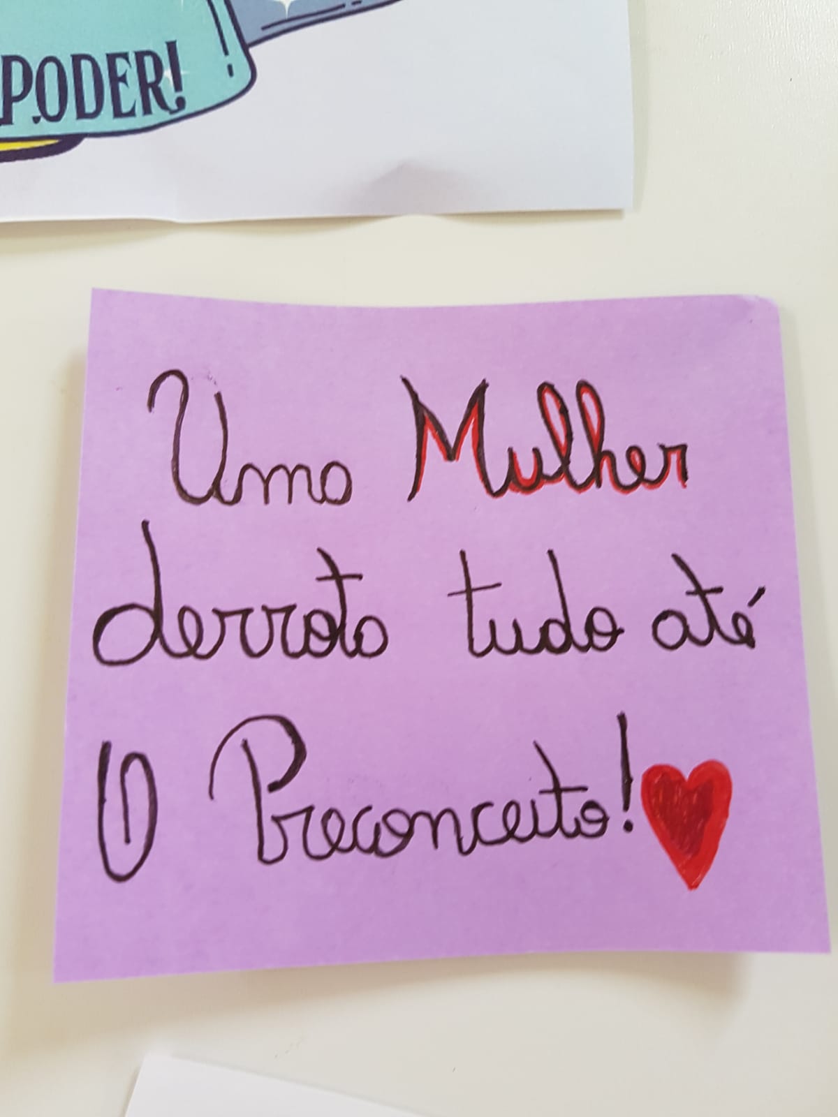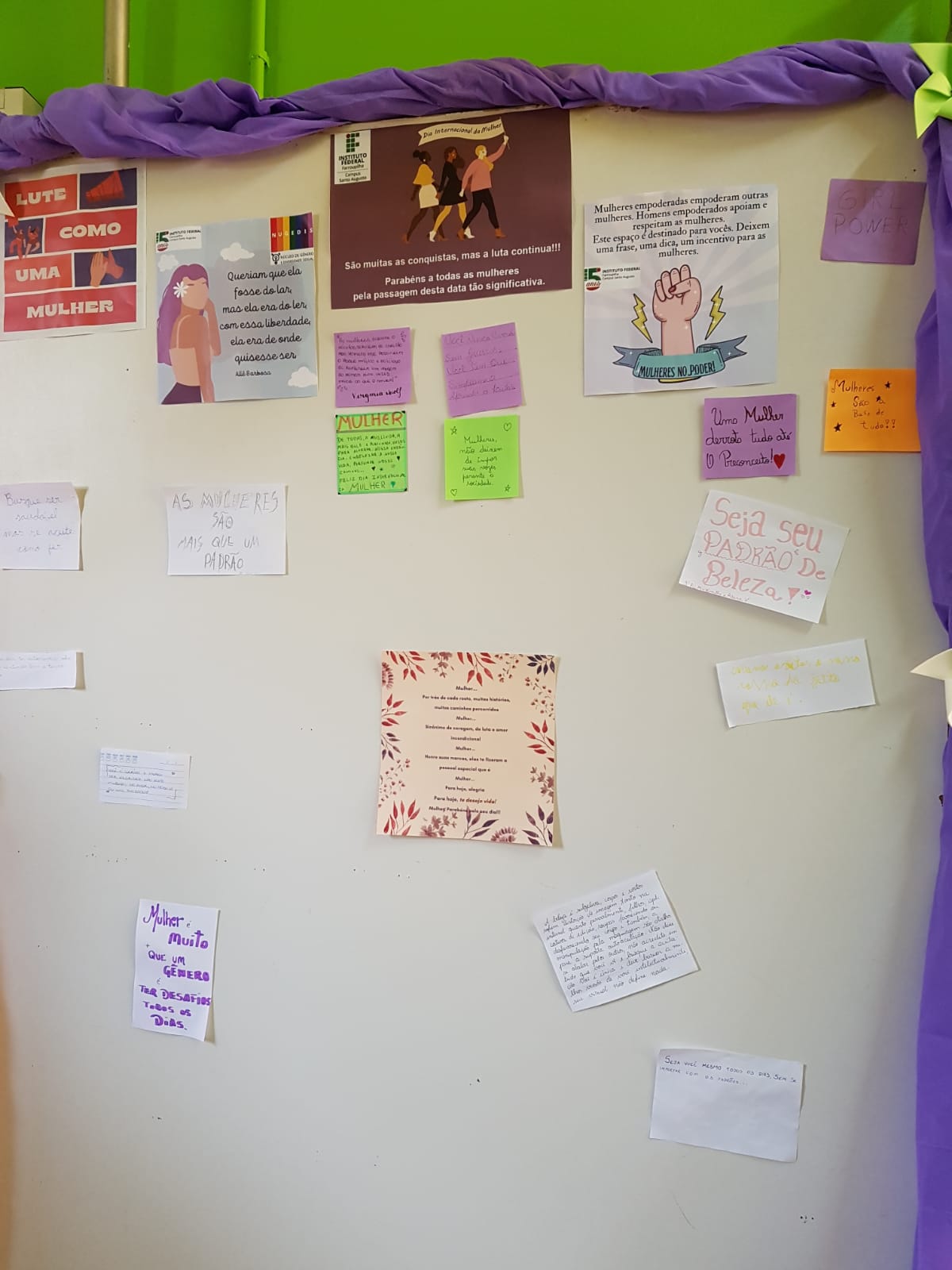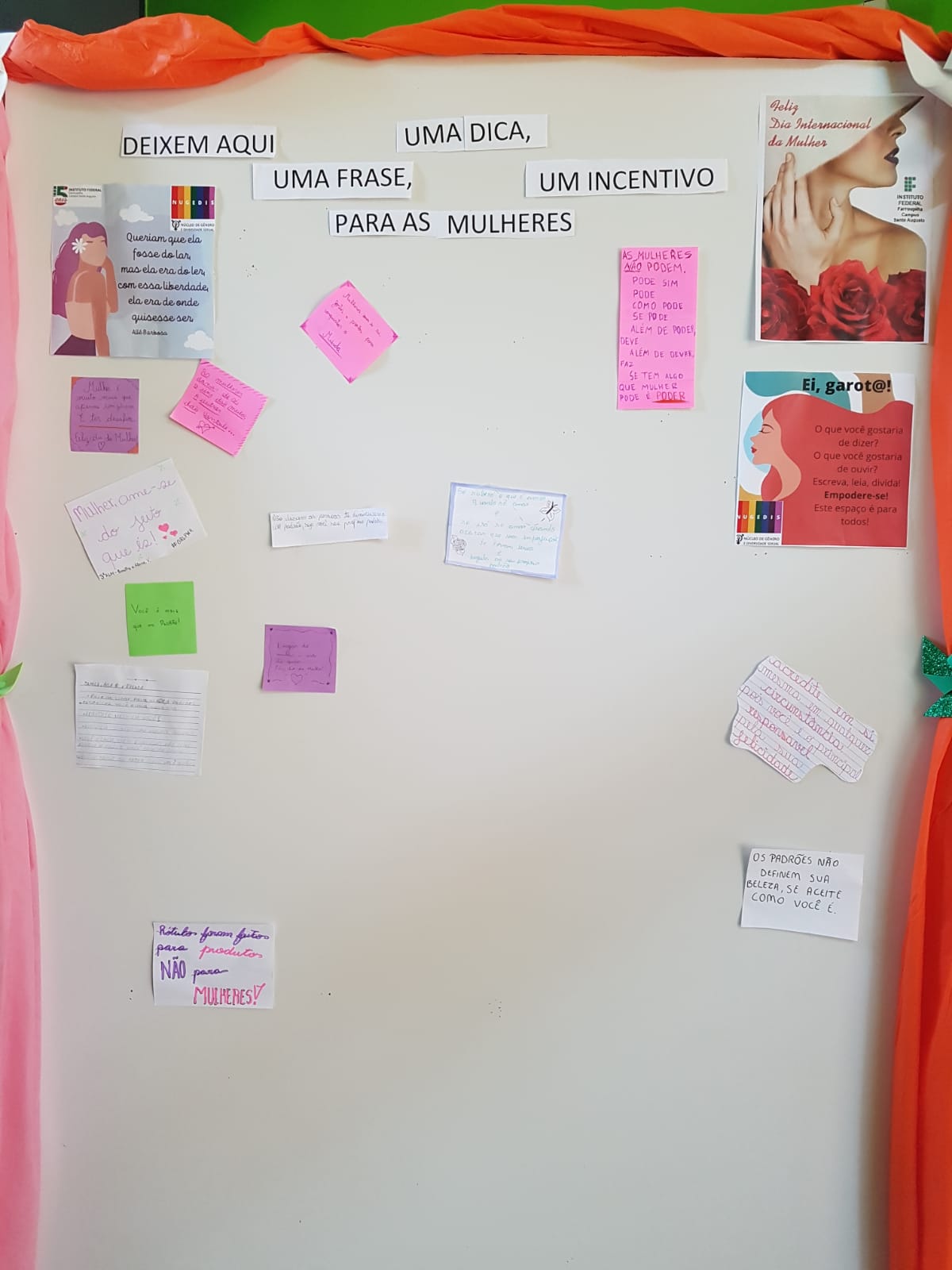 Um painel está instalado no hall do prédio F, onde estudantes e servidores podem até o final deste mês colocar recados, mensagens, dicas e incentivos para as mulheres da instituição. No dia 08, um cartão foi entregue para estudantes e servidoras com a seguinte mensagem emponderadora: “Queriam que ela fosse do lar, mas ela era do ler, com essa liberdade ela era de onde quisesse ser”.