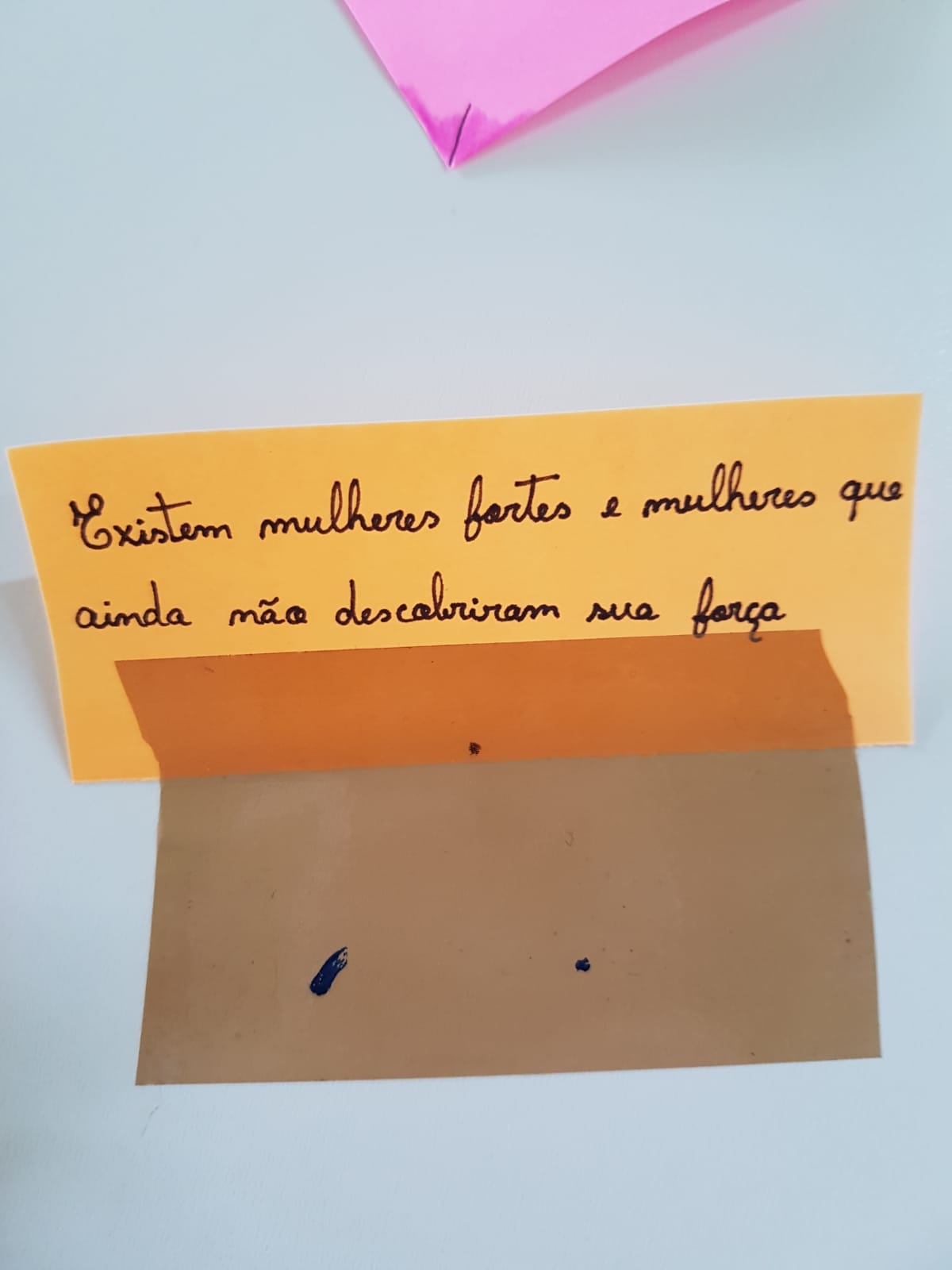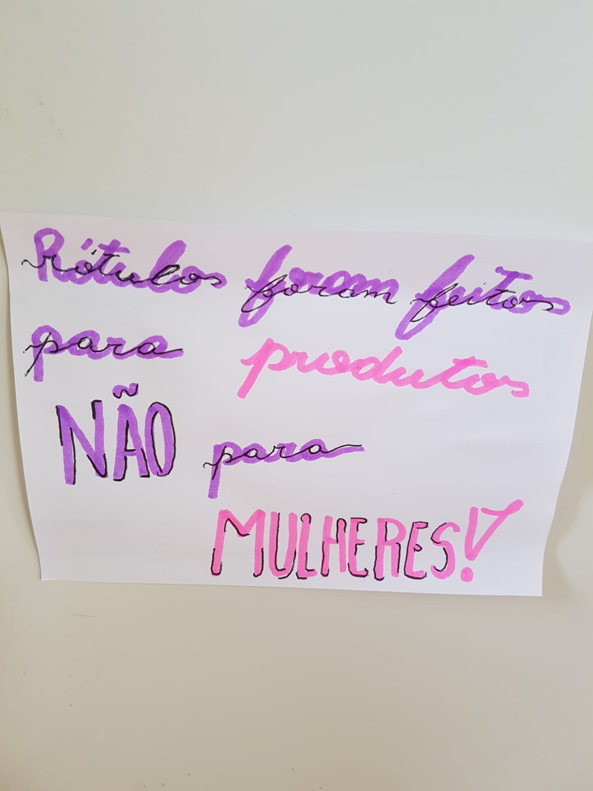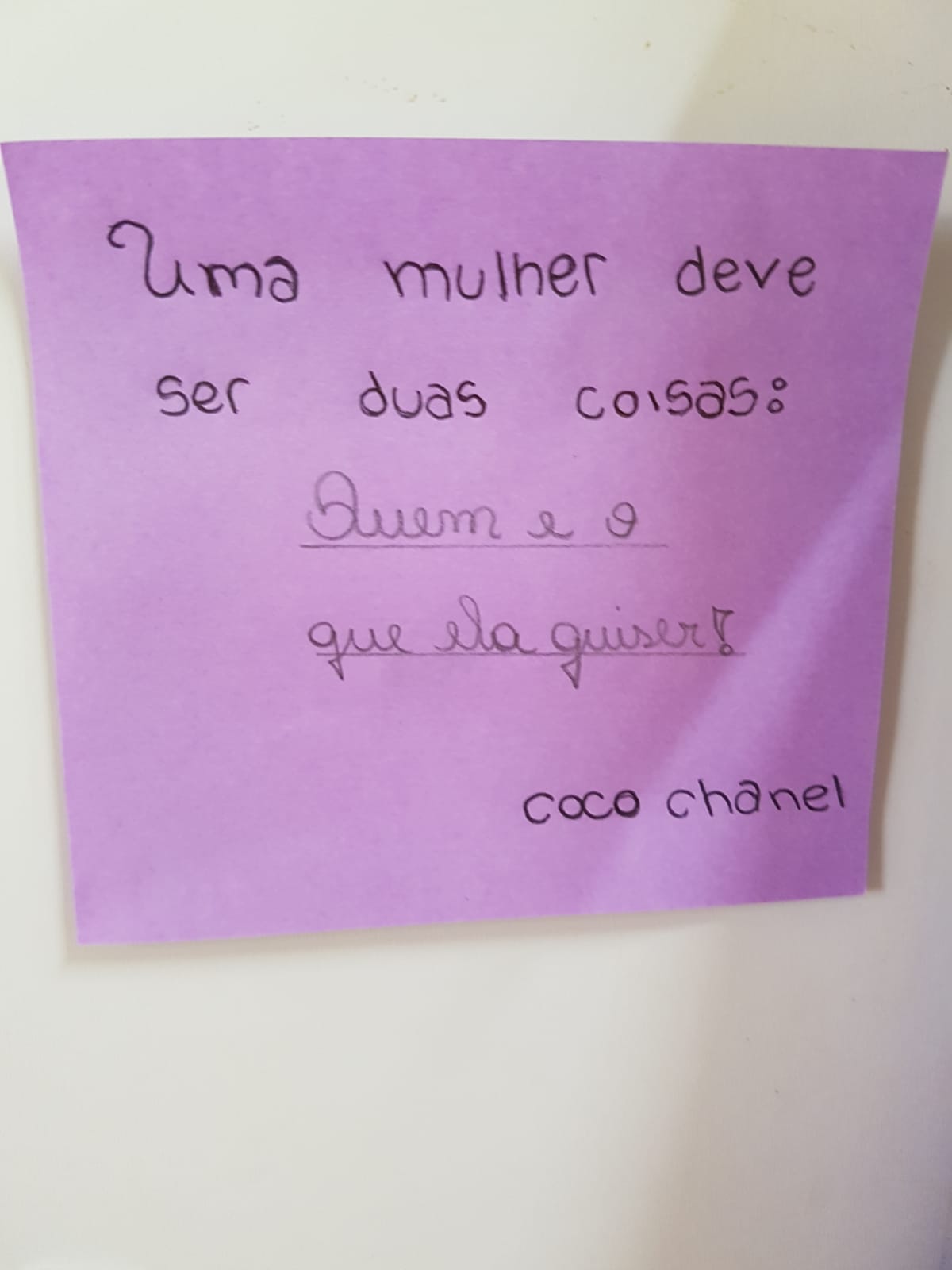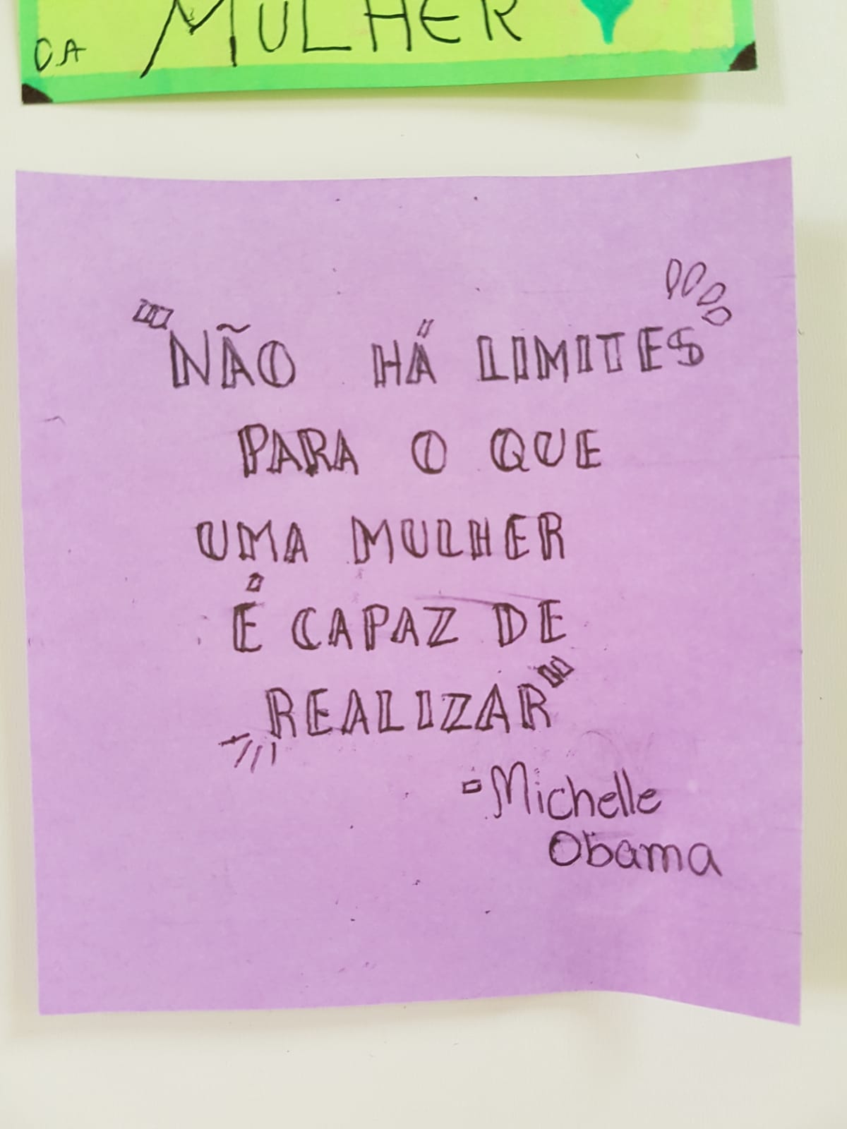 Um painel está instalado no hall do prédio F, onde estudantes e servidores podem até o final deste mês colocar recados, mensagens, dicas e incentivos para as mulheres da instituição. No dia 08, um cartão foi entregue para estudantes e servidoras com a seguinte mensagem emponderadora: “Queriam que ela fosse do lar, mas ela era do ler, com essa liberdade ela era de onde quisesse ser”.