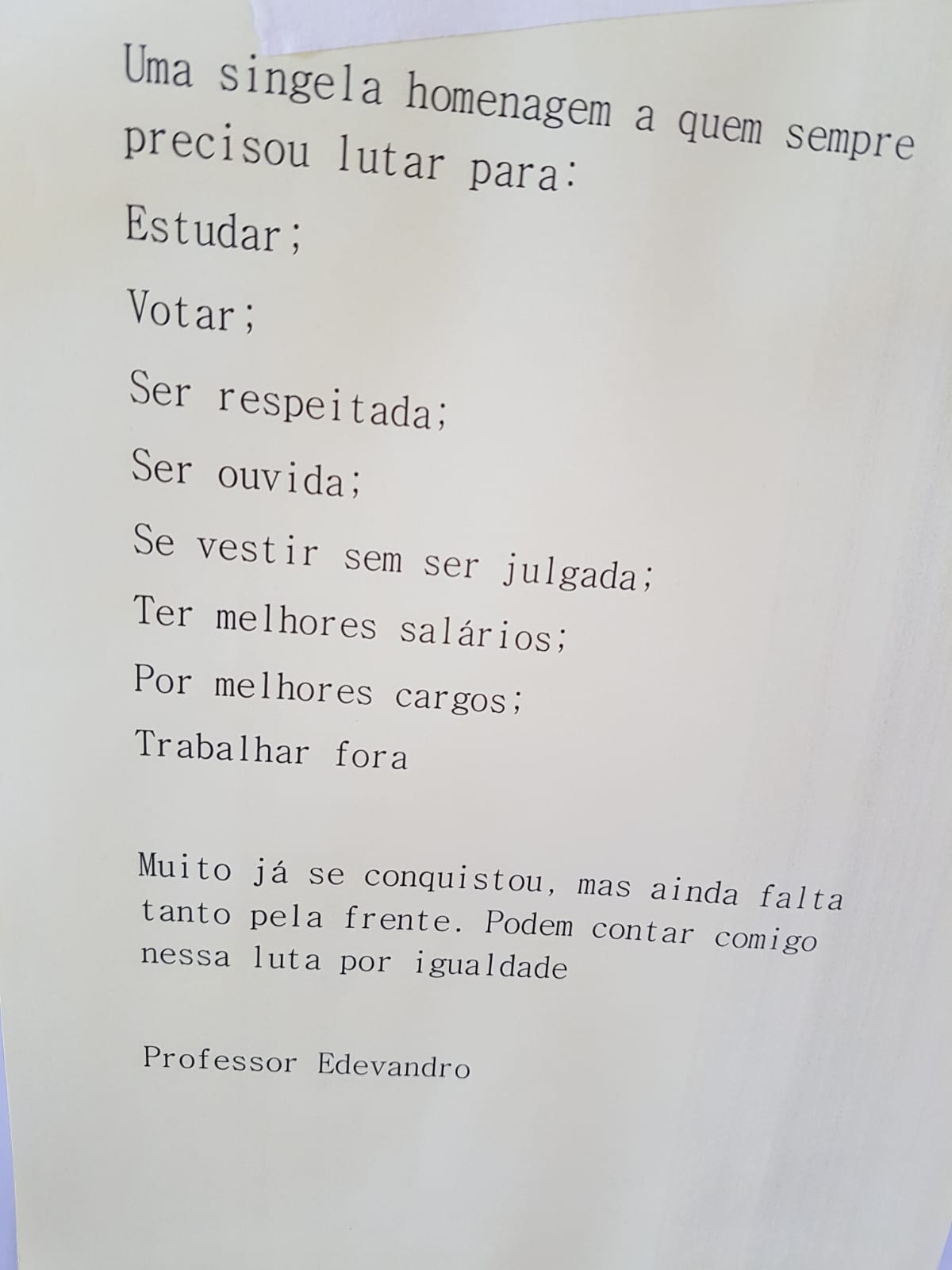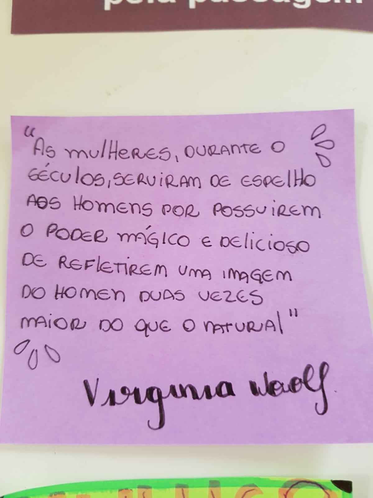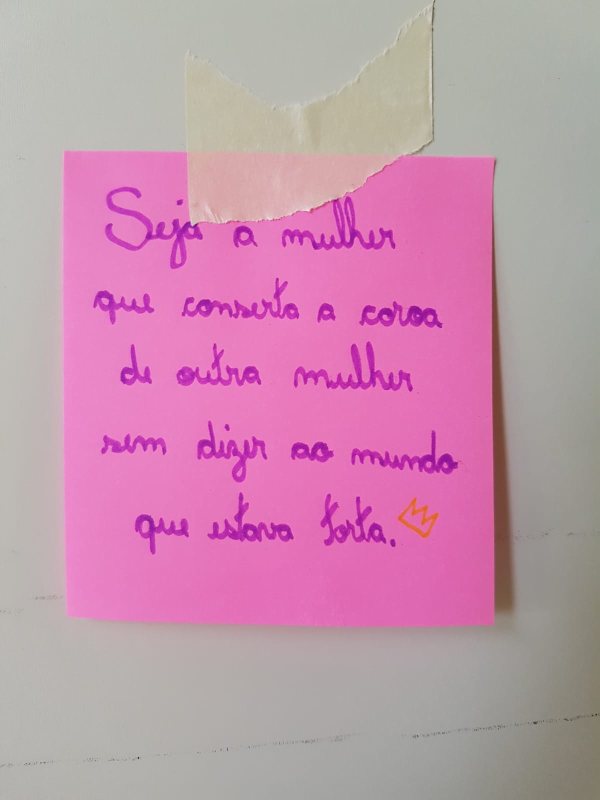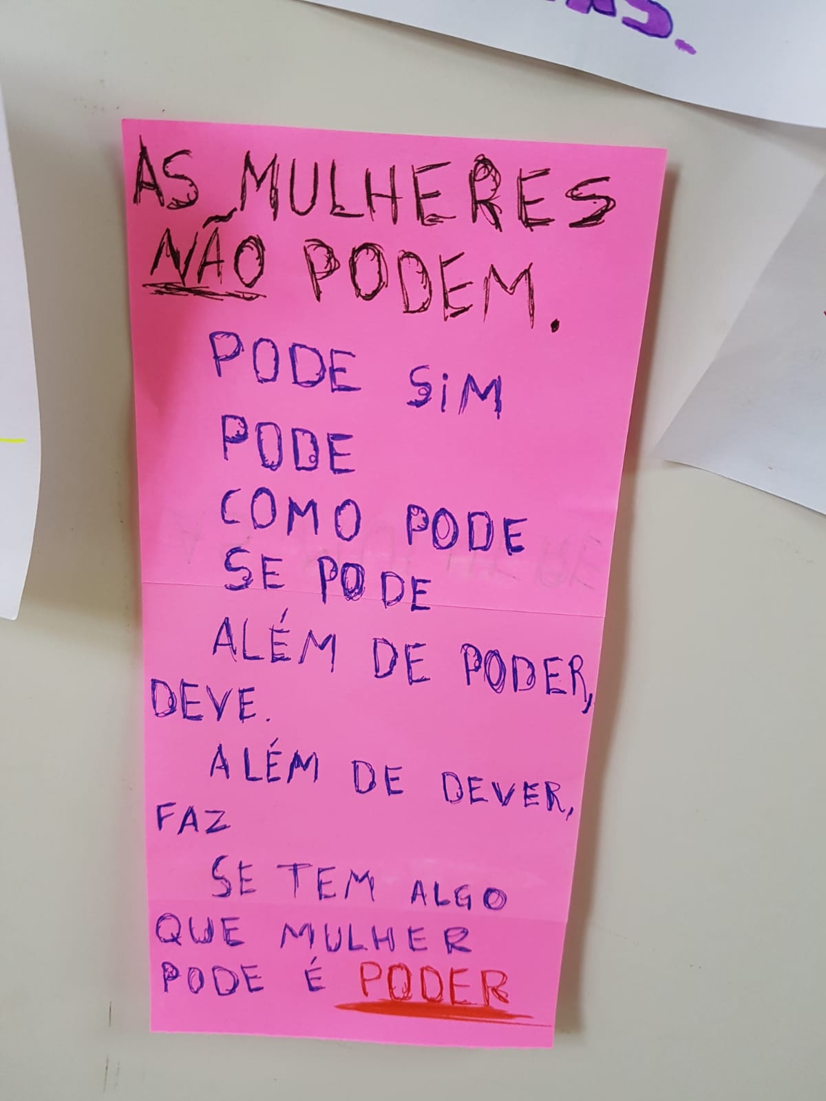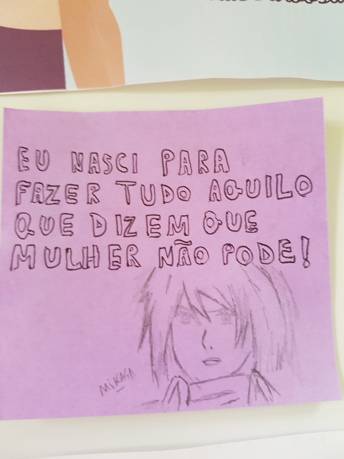 Um painel está instalado no hall do prédio F, onde estudantes e servidores podem até o final deste mês colocar recados, mensagens, dicas e incentivos para as mulheres da instituição. No dia 08, um cartão foi entregue para estudantes e servidoras com a seguinte mensagem emponderadora: “Queriam que ela fosse do lar, mas ela era do ler, com essa liberdade ela era de onde quisesse ser”.