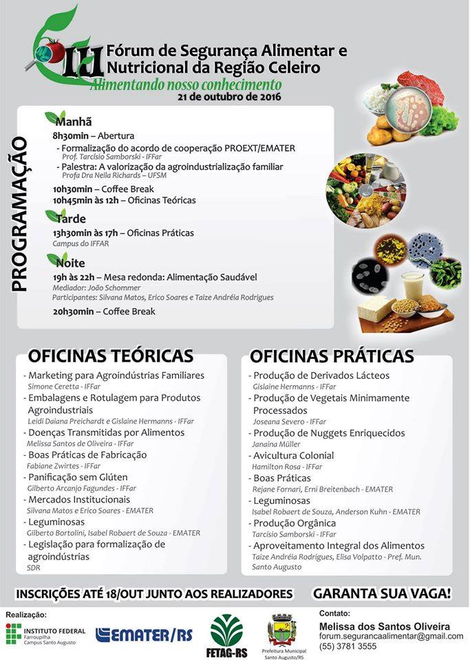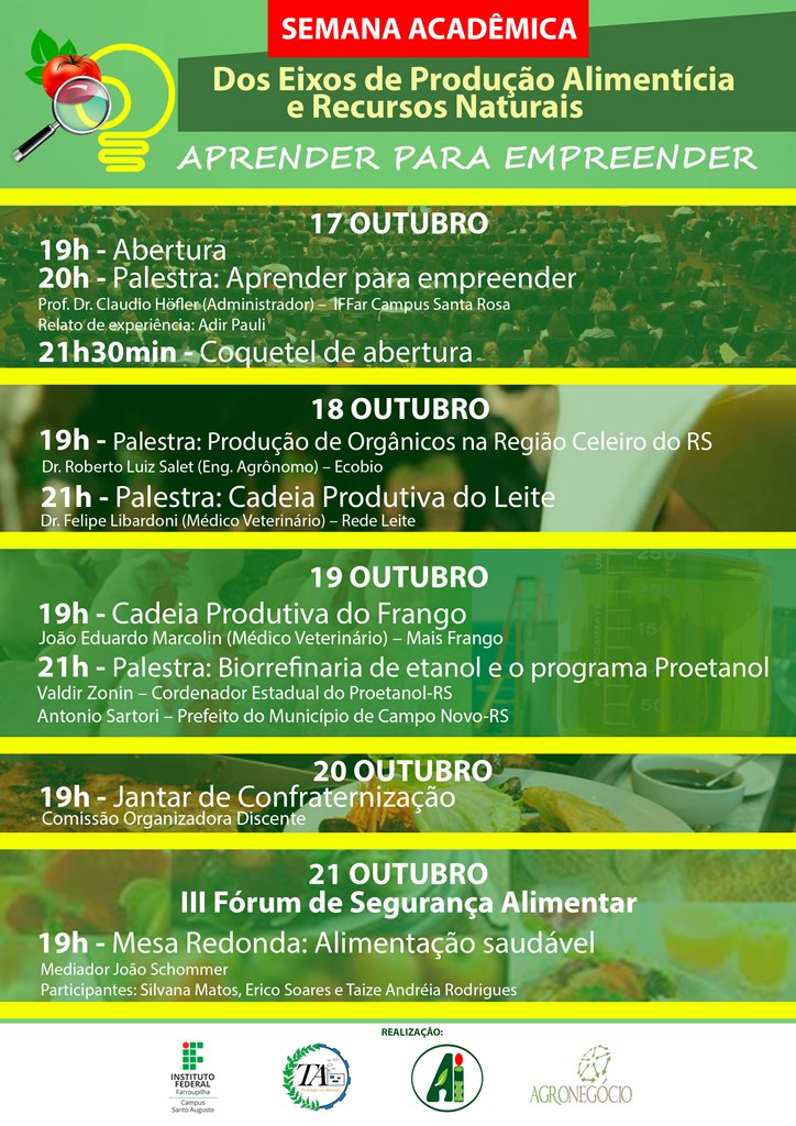 De 17 a 21 de outubro o IFFar - Campus Santo Augusto promove a Semana Acadêmica dos Eixos de Produção Alimentícia e Recursos Naturais. Paralelamente ao evento no dia 21 de outubro ocorre o 3º Fórum de Segurança Alimentar e Nutricional da Região Celeiro.