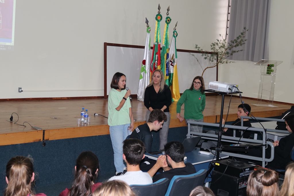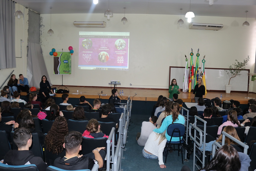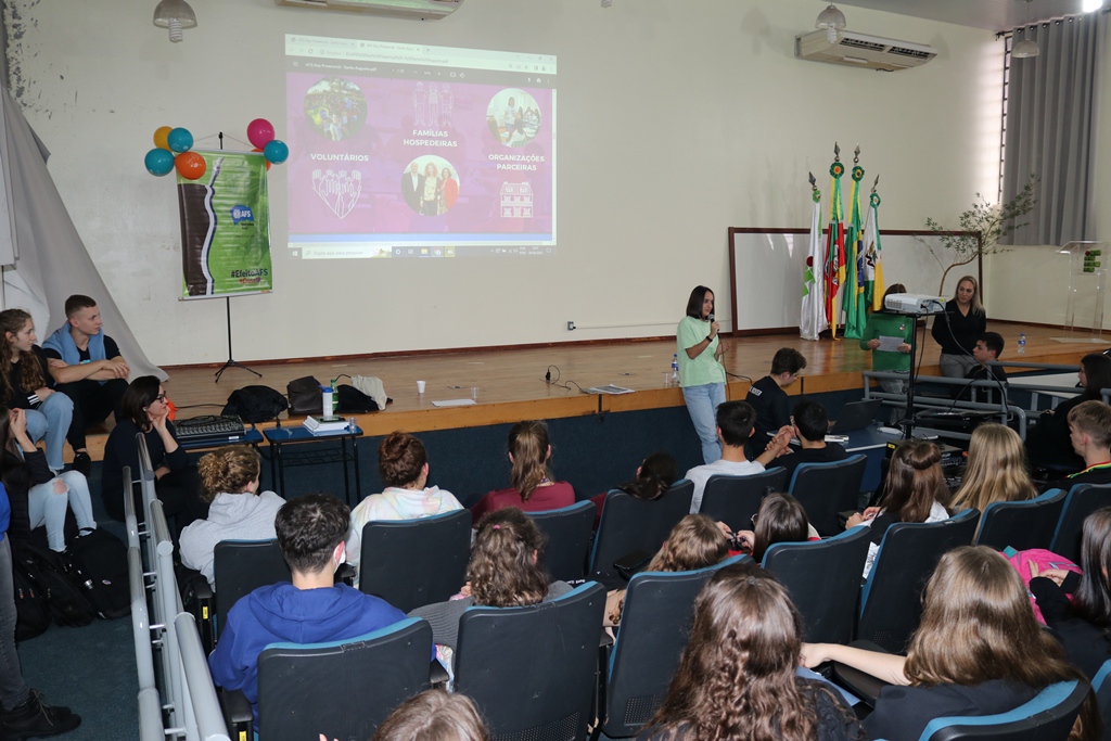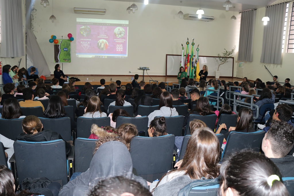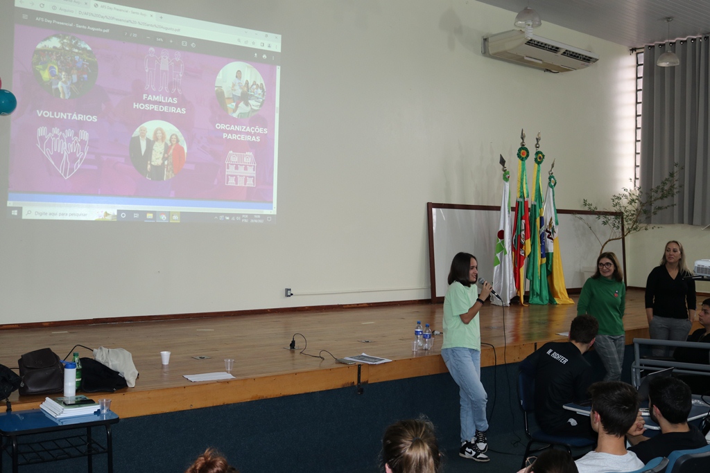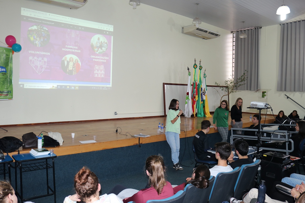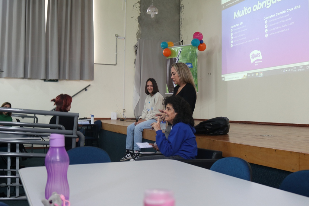 As representantes da AFS trouxeram para conversar com os estudantes a intercambista, Martina Minerva, da cidade de Otranto na Itália, que está morando em Cruz Alta desde o início deste ano, realizando intercâmbio semestral e cursa 2º ano do ensino médio na Escola Estadual Professor Annes Dias, a qual falou como é o intercambio, como funciona a relação com a família hospedeira e como são as diferenças culturais entre os países.