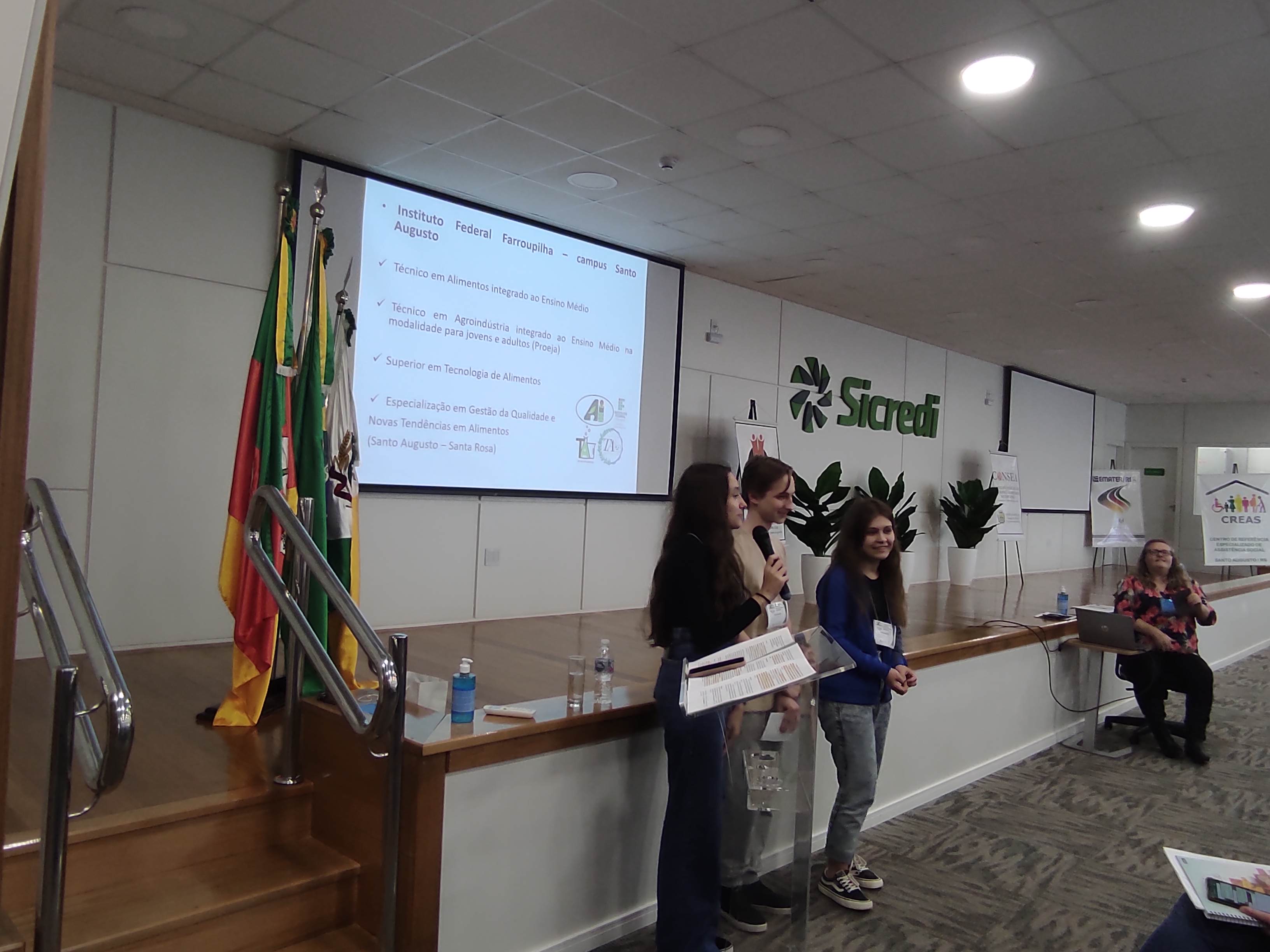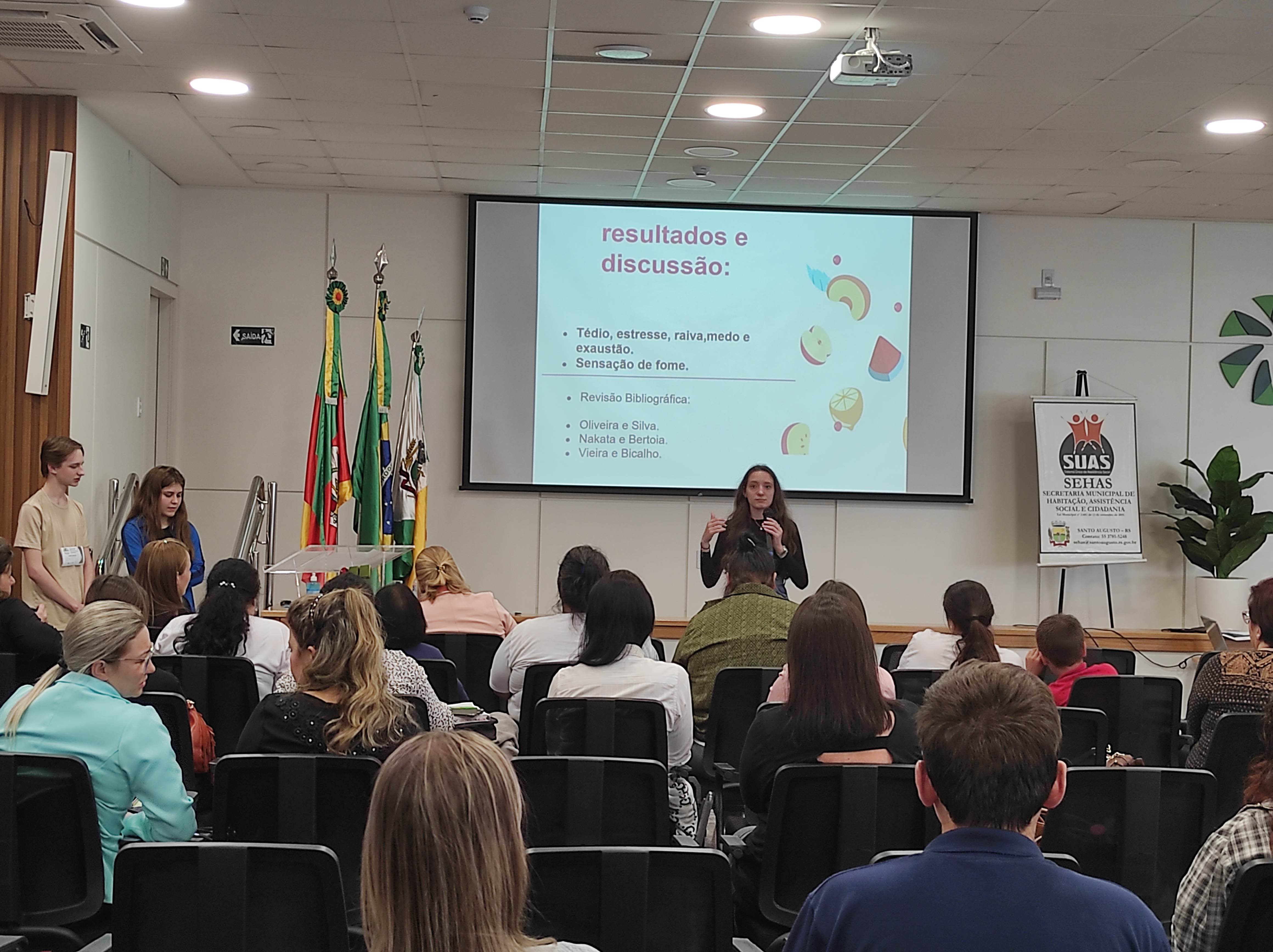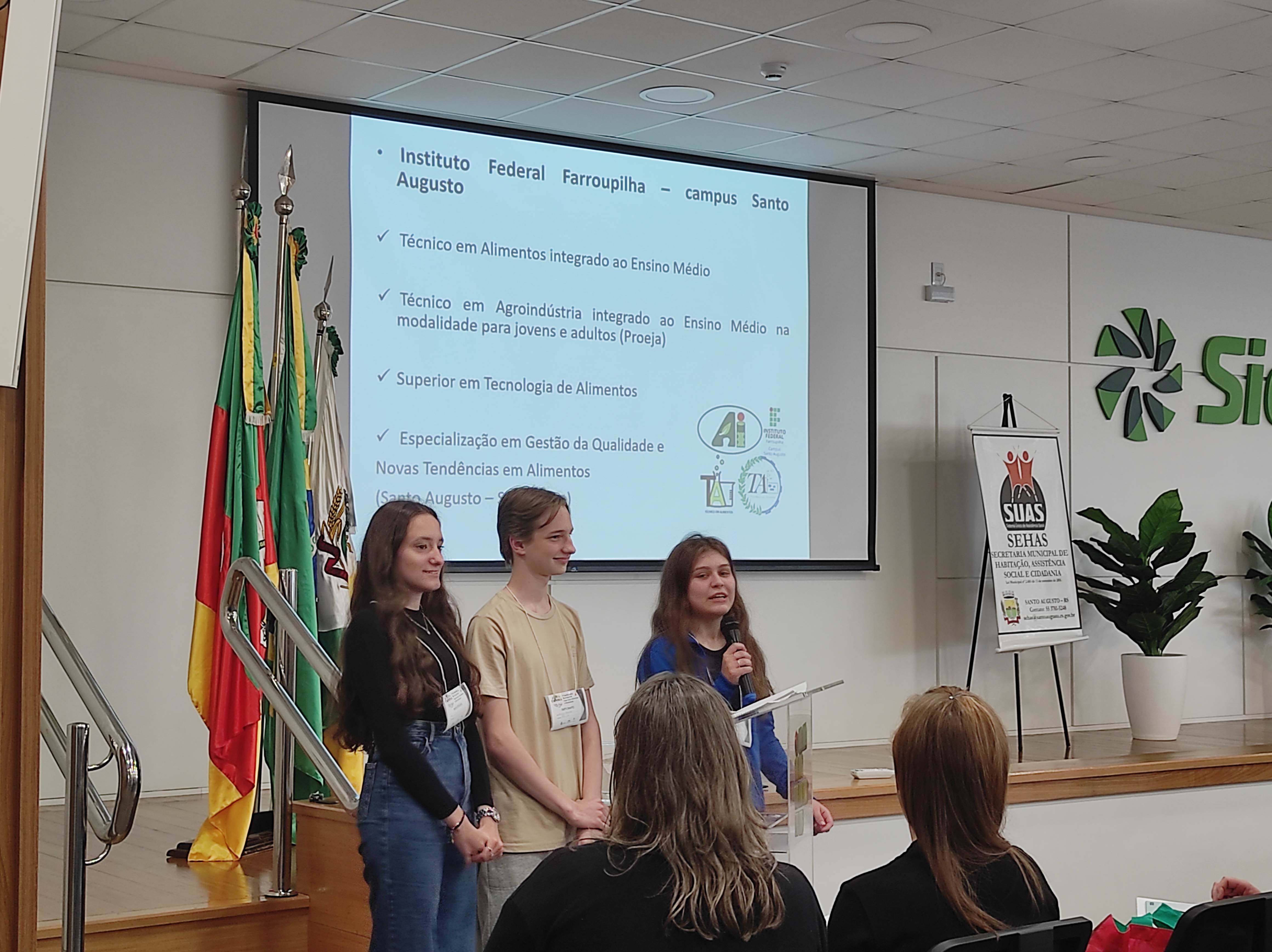 Na parte da tarde foram apresentadas apolíticas públicas realizadas no município em relação a Segurança Alimentar e Nutricional, com dados, serviços, projetos, ações. Em seguida os estudantes do 2º ano do curso técnico em Alimentos do IFFar – Campus Santo Augusto, Luiza Trautmann, Henrique Schmiddel e Emily Micaela Vieira, apresentaram trabalhos desenvolvidos por eles sobre o assunto, sob a orientação da professora Tatiane Storch.