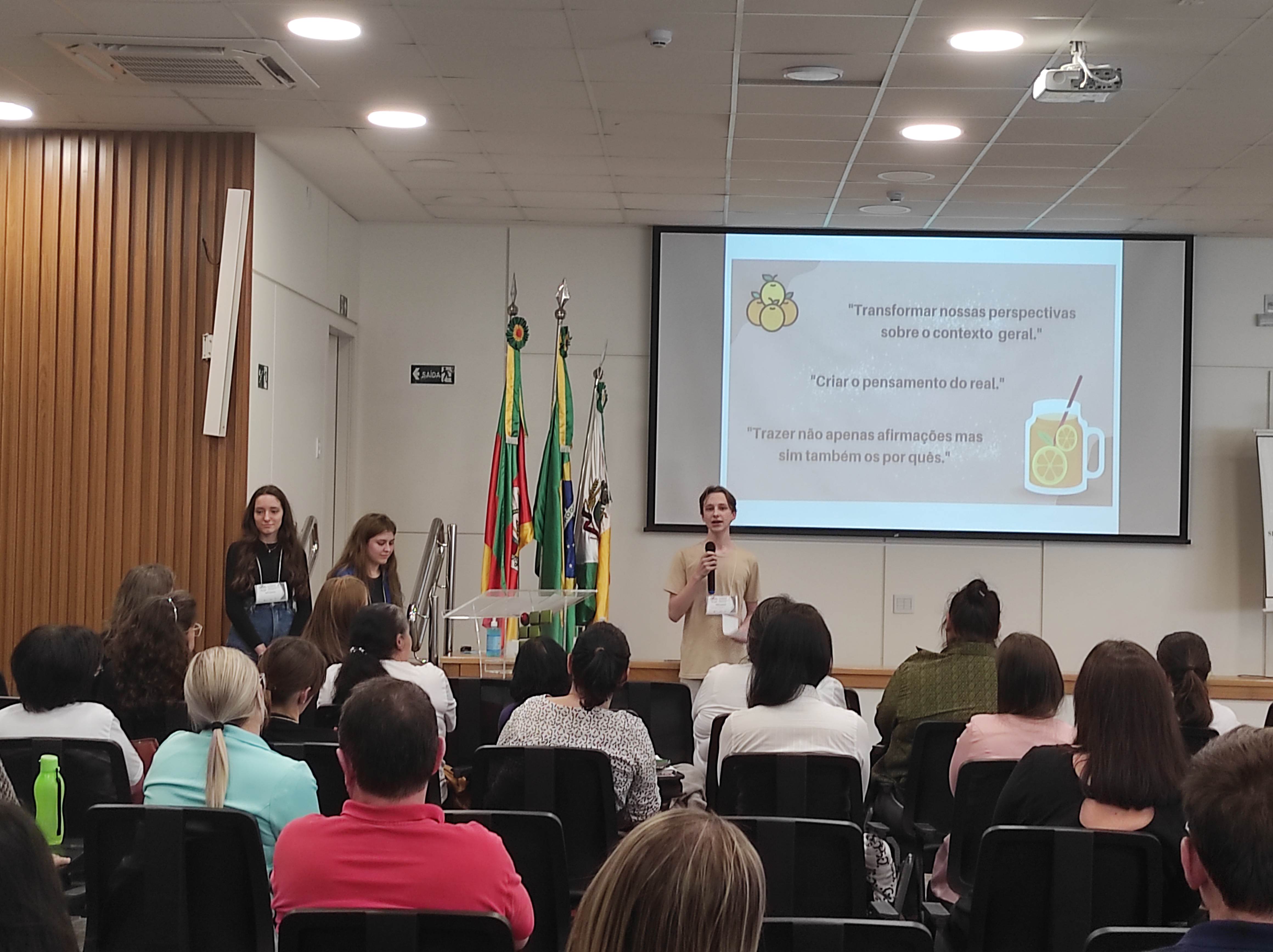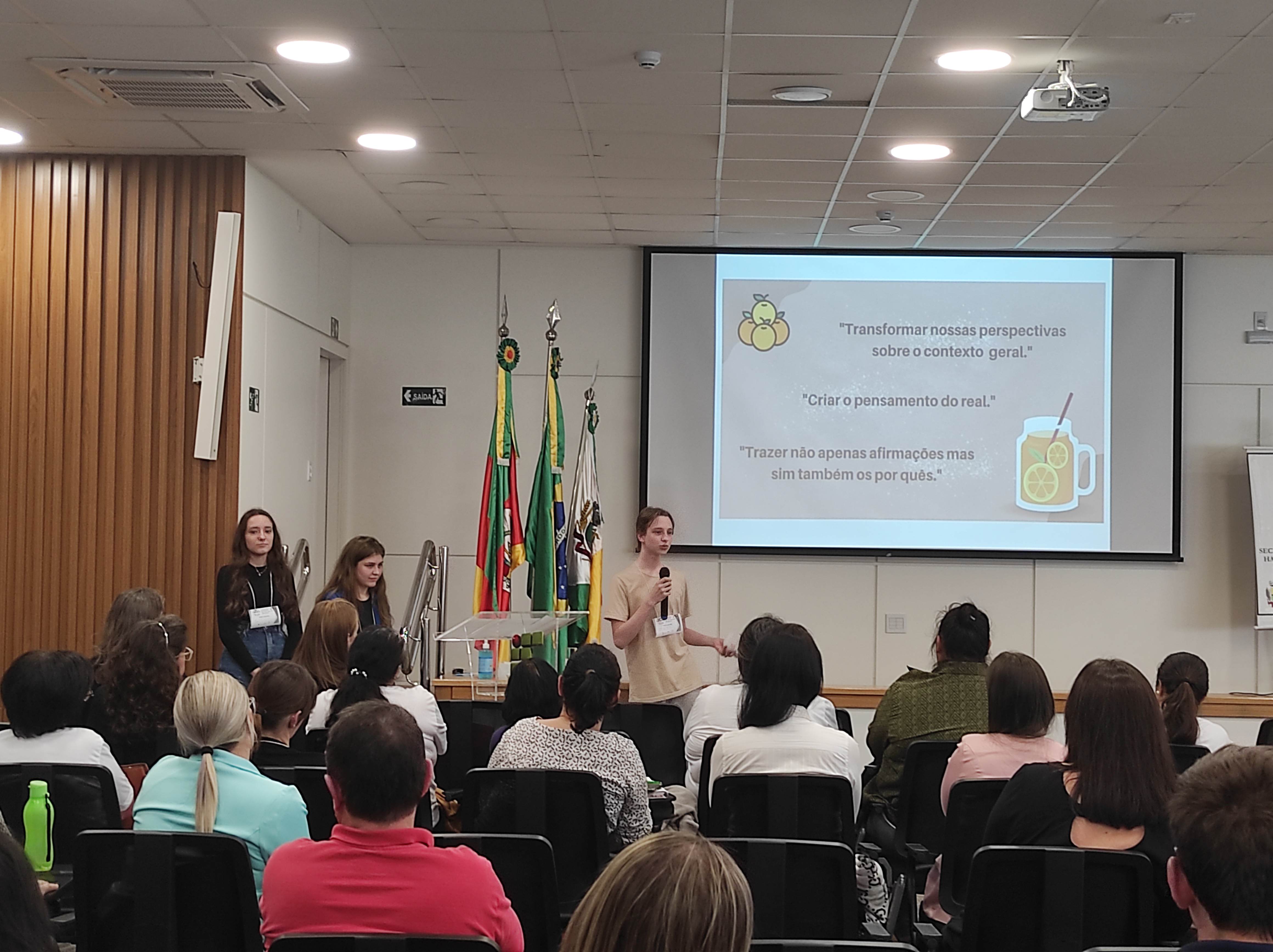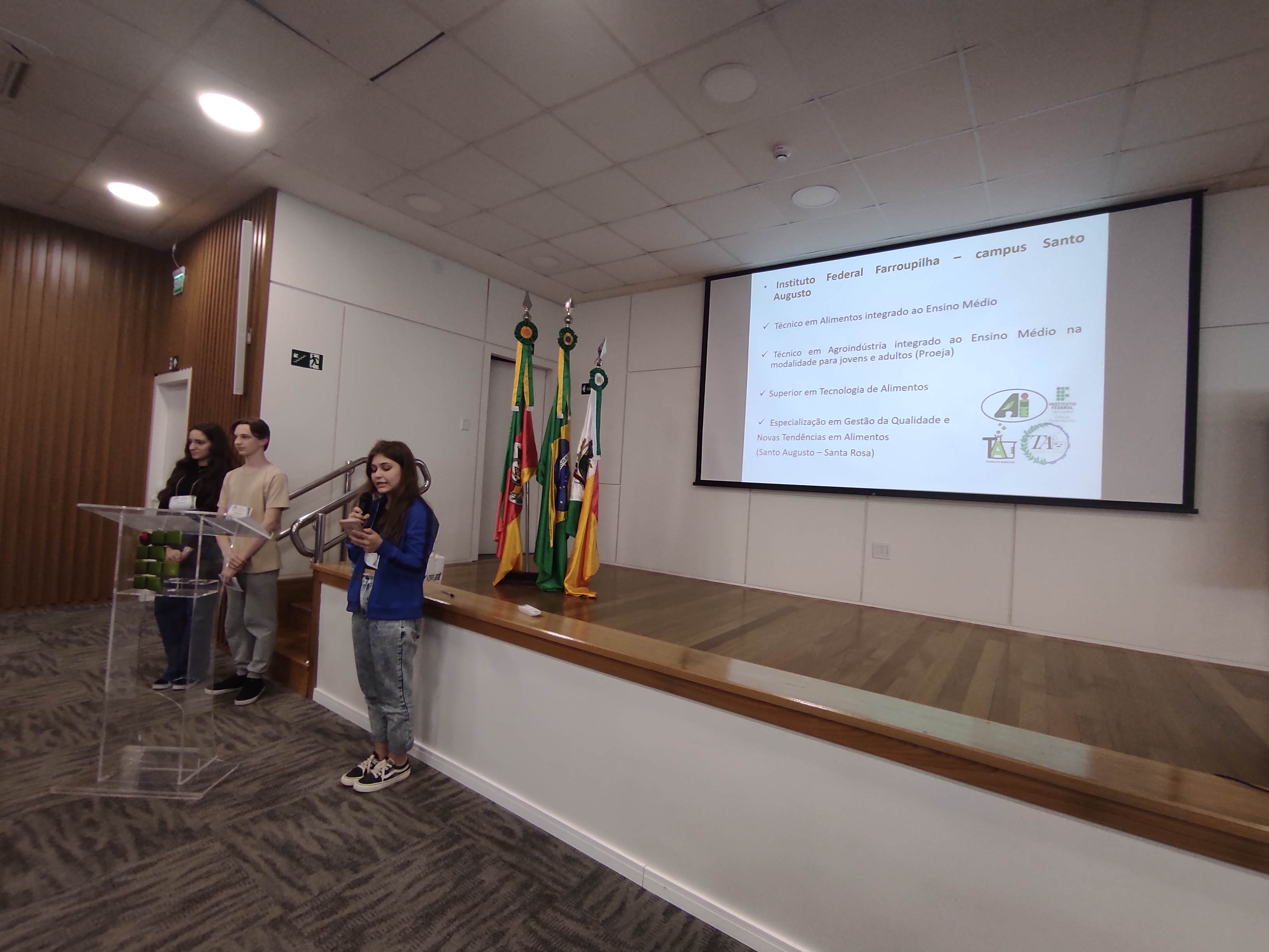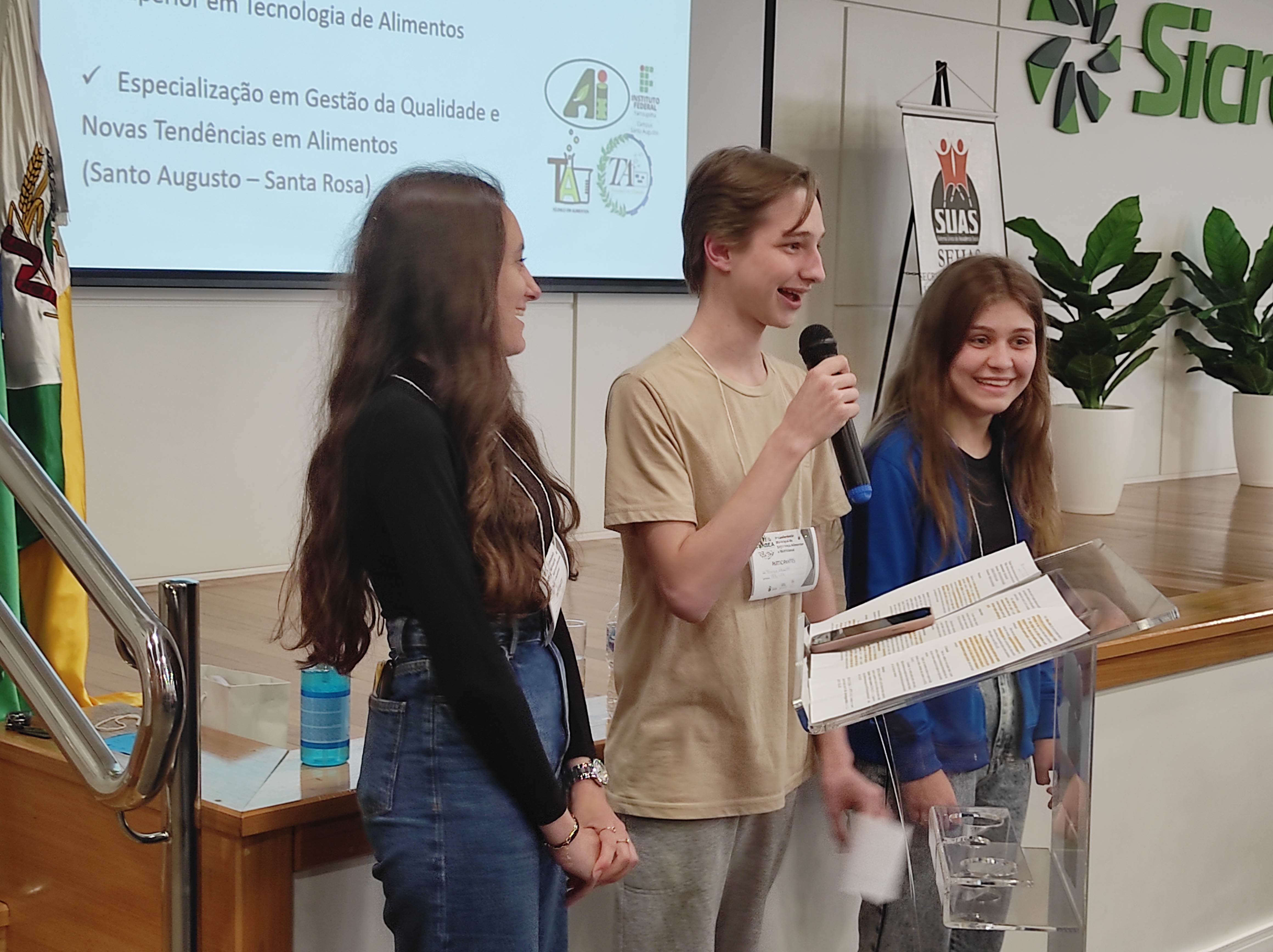 Na parte da tarde foram apresentadas apolíticas públicas realizadas no município em relação a Segurança Alimentar e Nutricional, com dados, serviços, projetos, ações. Em seguida os estudantes do 2º ano do curso técnico em Alimentos do IFFar – Campus Santo Augusto, Luiza Trautmann, Henrique Schmiddel e Emily Micaela Vieira, apresentaram trabalhos desenvolvidos por eles sobre o assunto, sob a orientação da professora Tatiane Storch.